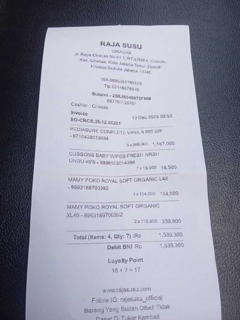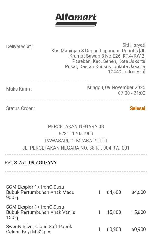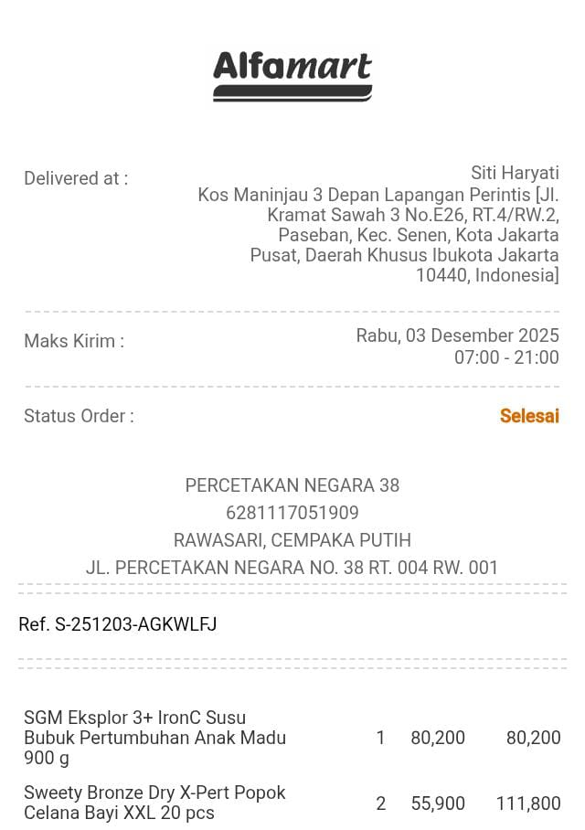 Dana digunakan untuk 1. Pampers 2 ball Rp100.000 2. Susu sgm 4 kotak Rp338.0002025-11-07 09:35:30