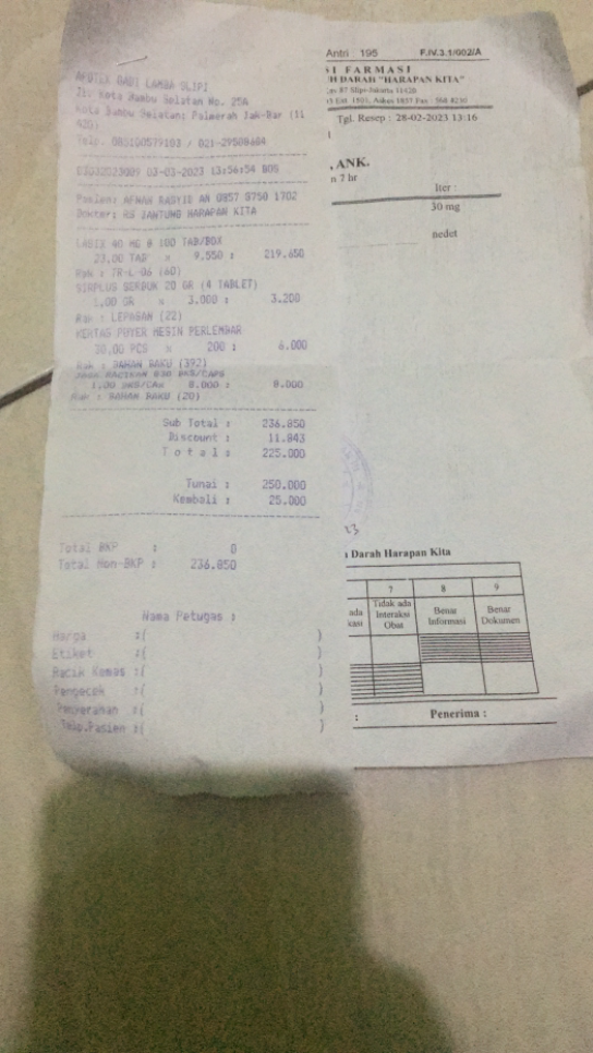 Aku mau mengabarkan kondisi anakku ya. Obat furosemide yang dibutuhkan anakku sempat kosong di RS Harapan Kita, jadi aku harus menebusnya di apotek luar dengan biaya sendiri karena obat itu tidak ditanggung BPJS.
