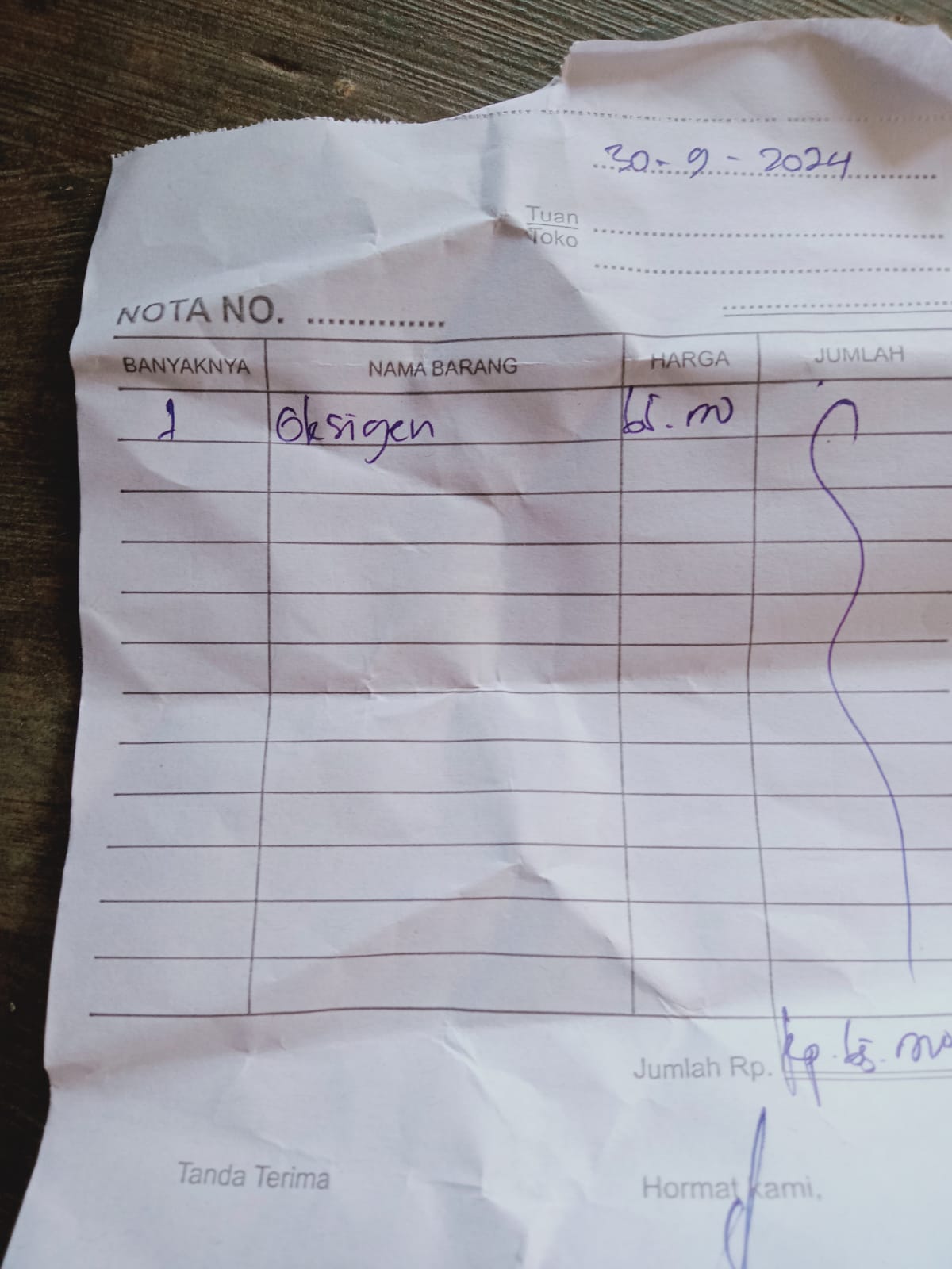 Dokter juga menganjurkan agar Ahmad diberikan oksigen pada malam hari, sehingga kami perlu membeli isi ulang oksigen.