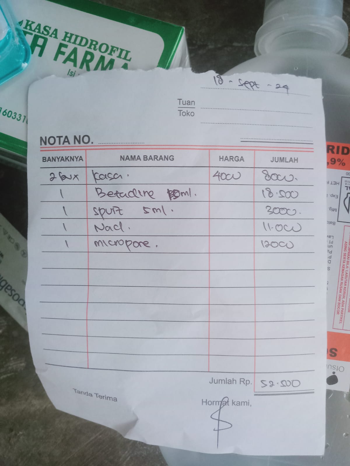 Selain itu, Ahmad memerlukan obat perawatan luka seperti Betadine, salep, kasa, cairan NaCl, dan lainnya untuk persediaan di rumah. Karena tidak ditanggung oleh rumah sakit, kami harus membeli semua kebutuhan tersebut sendiri.