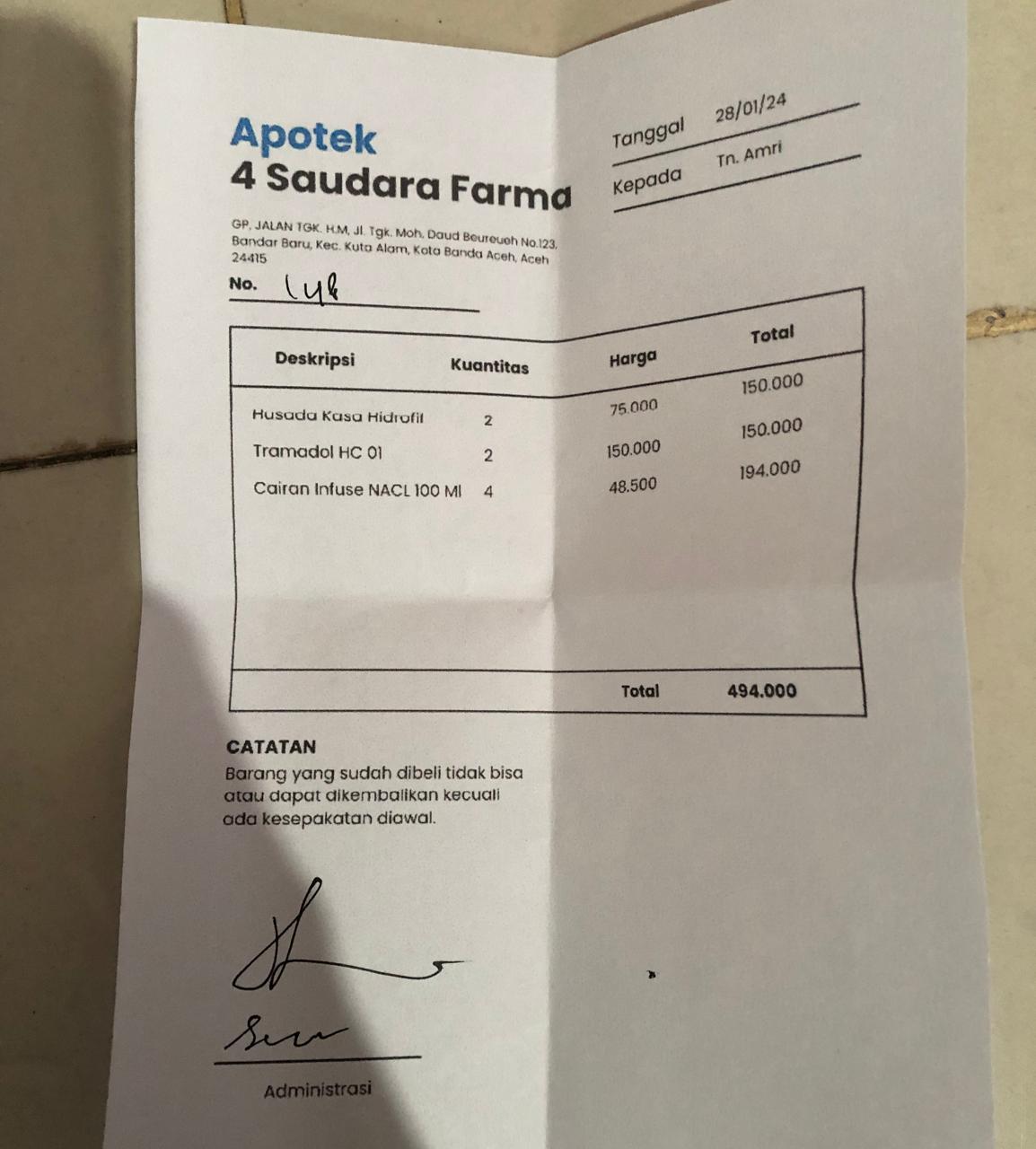 Dana digunakan untuk 1. Obat Tramadol HC 1 Box Rp150.000 2. Kain Kasa Rp75.000 x 2 Box = Rp150.000 3. Air Infused Rp200.000.