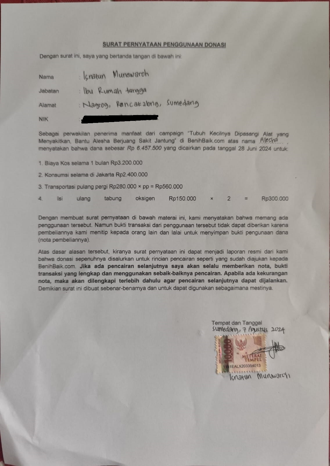 Adapun dana bantuan dari #TemanBaik sudah dipergunakan untuk membeli susu dan beberapa kebutuhan nutrisi untuk Alesha.