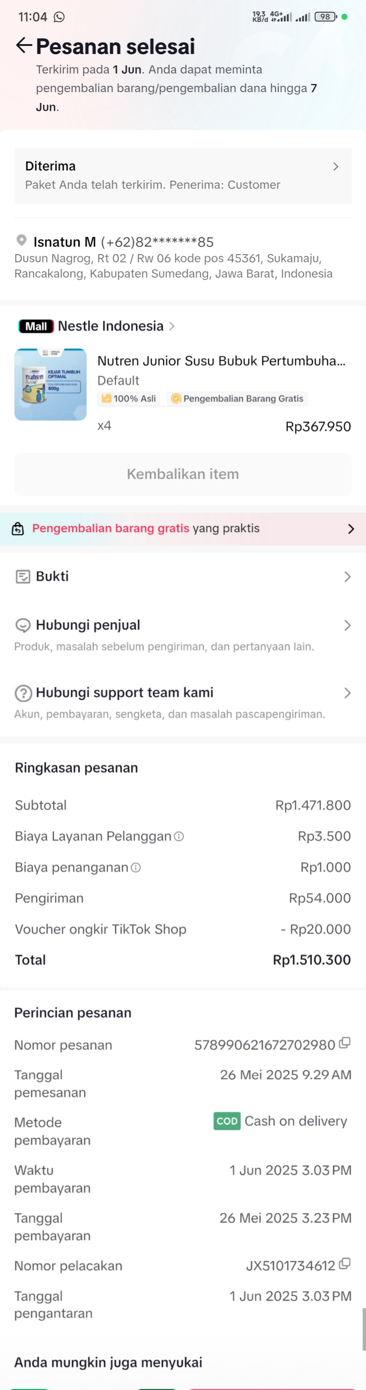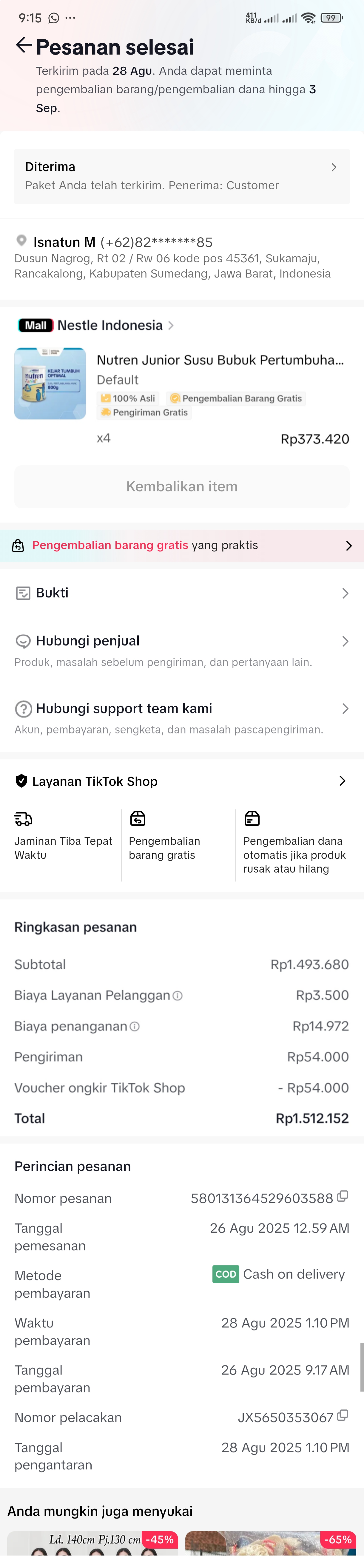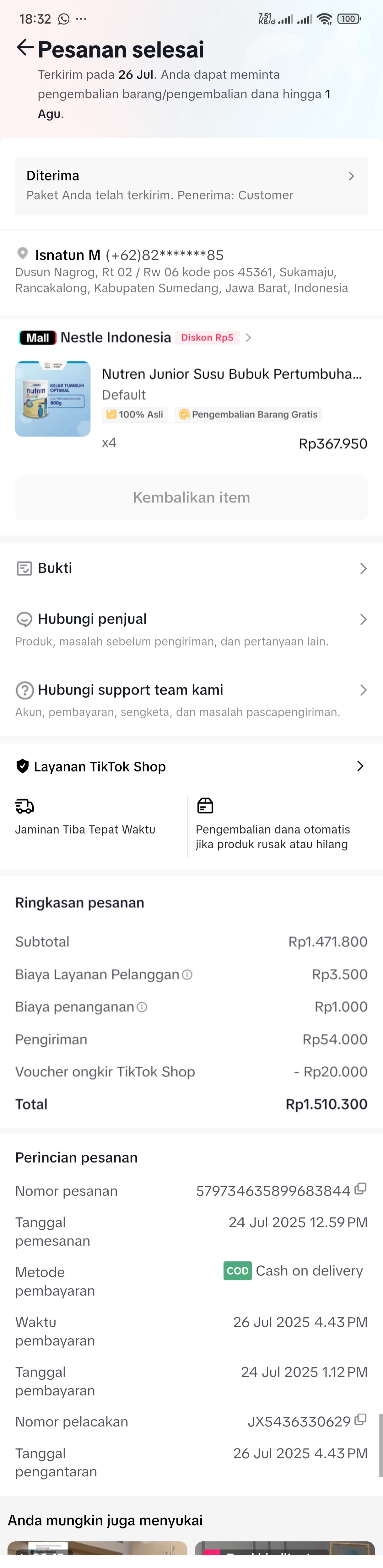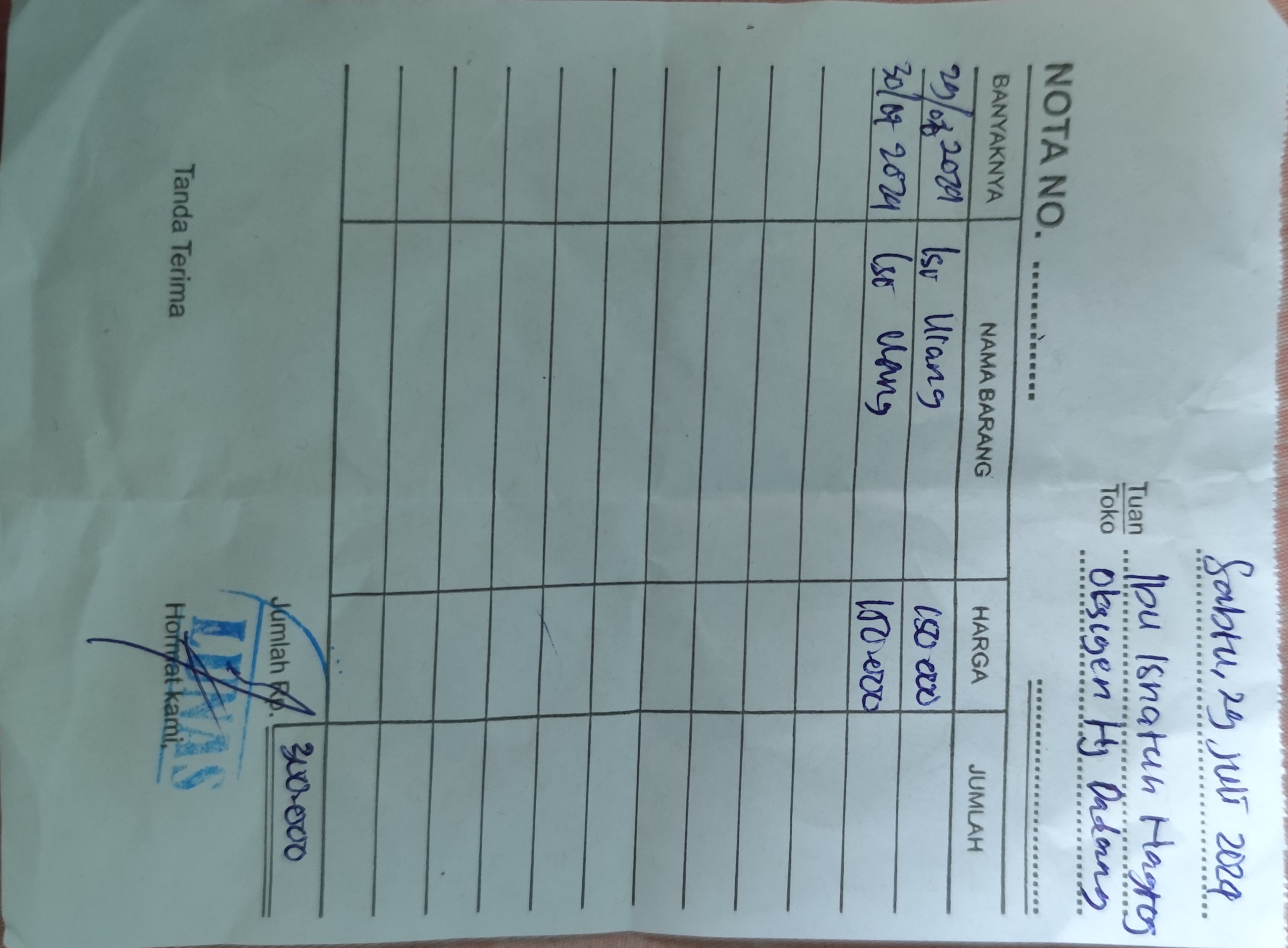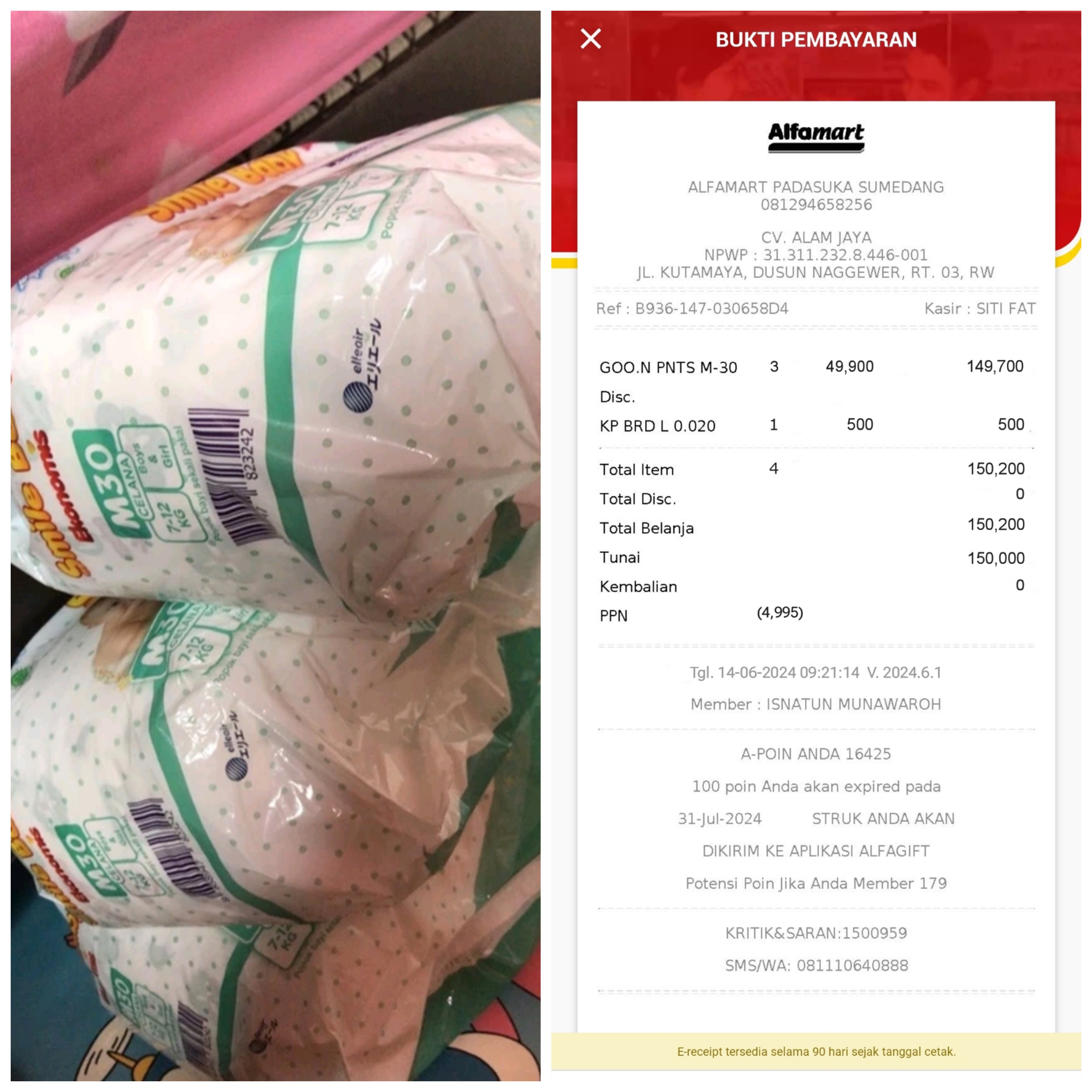 1. Pembelian 4 kaleng susu nutren Junior + ongkir 375.000 × 4 = Rp1.500.000 2. Pembeliam pampers makuku M28 56.700 x 3bal = Rp170.000 3. Pembelian vitamin bicara Generos Rp. 400.0002024-09-26 09:21:58