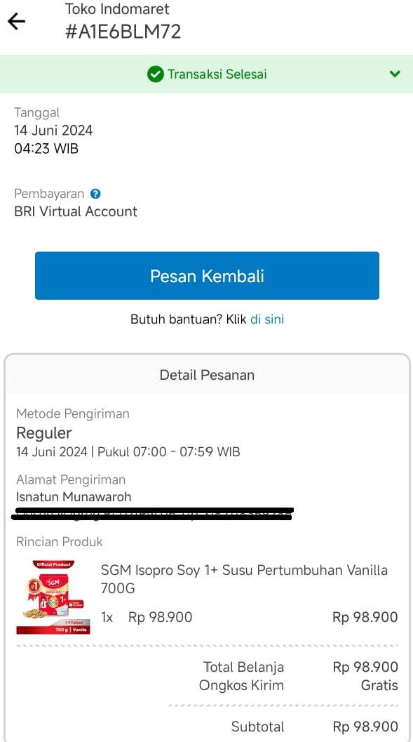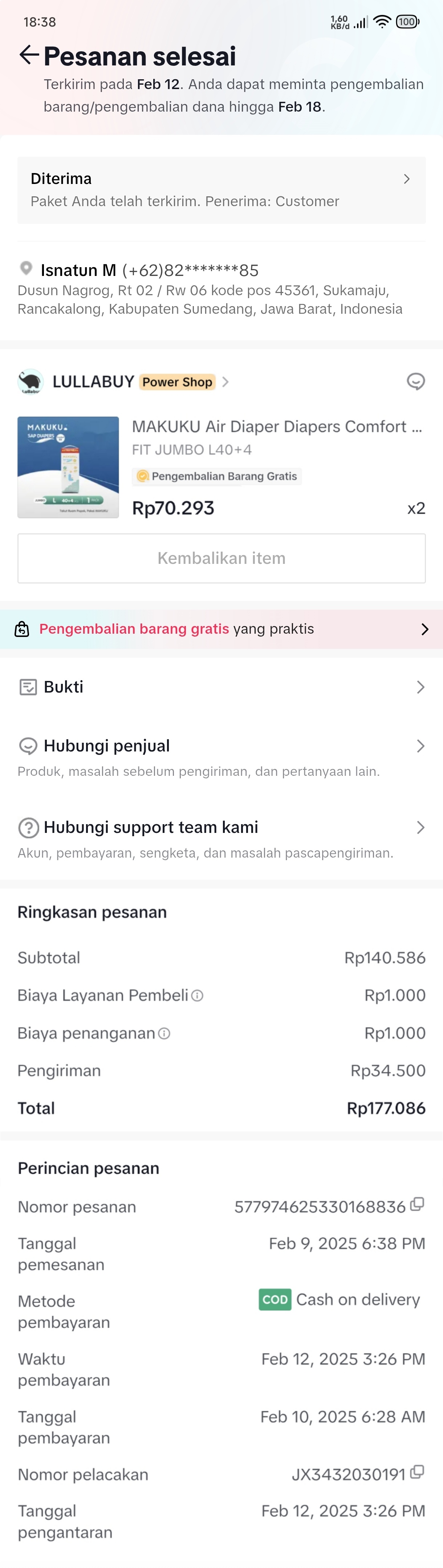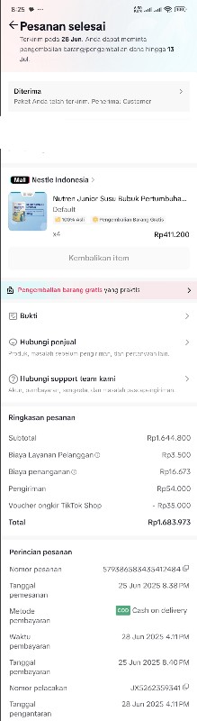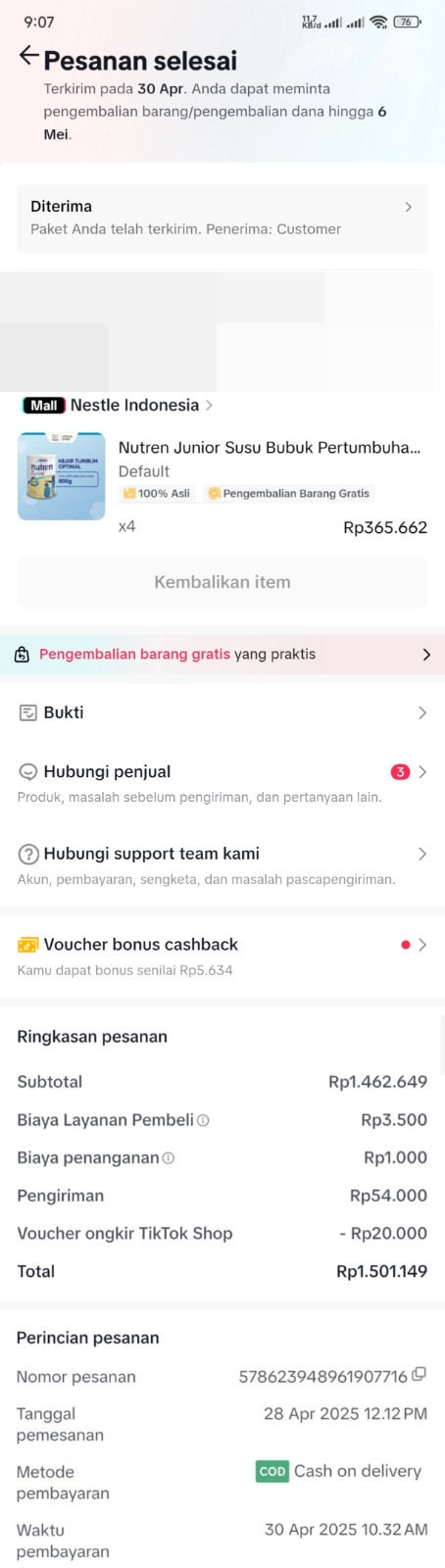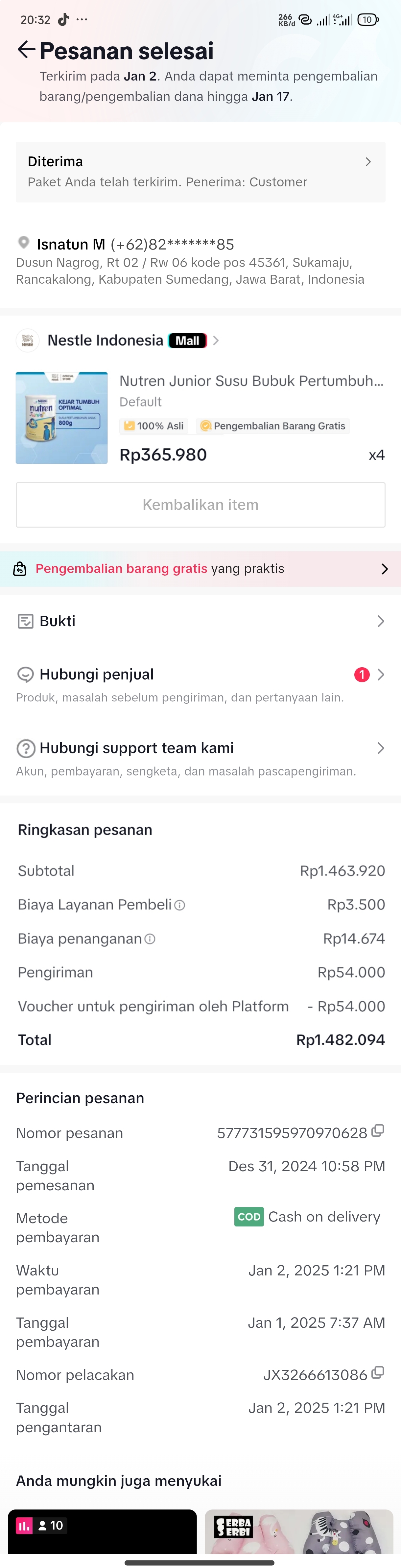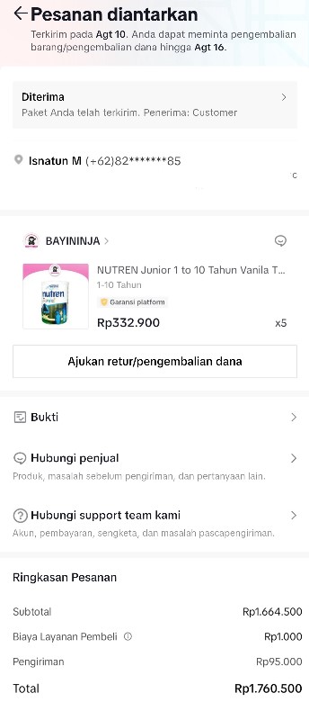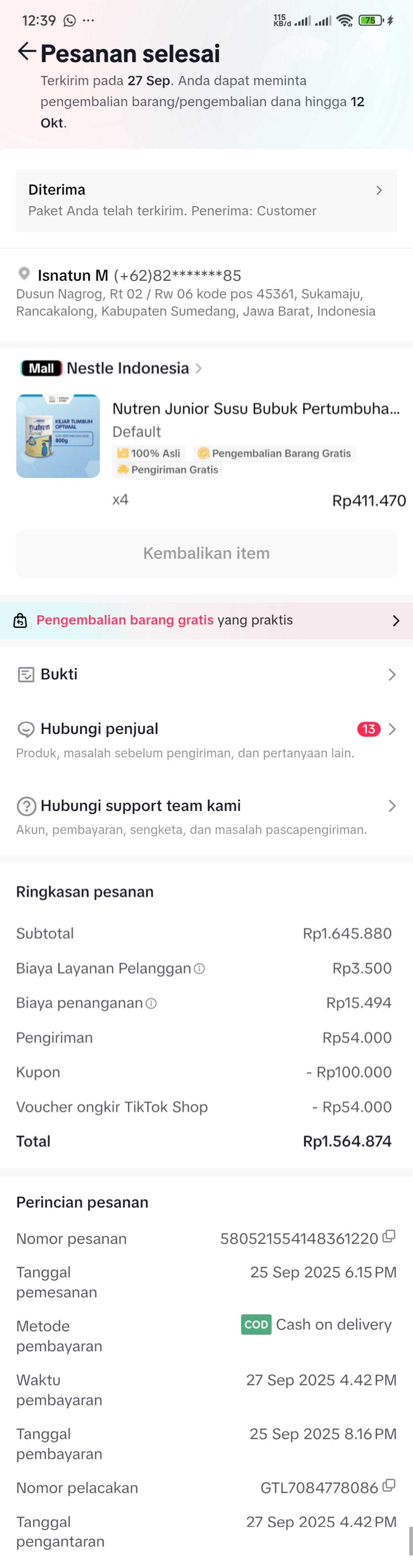 1. Pembelian 4 kaleng susu nutren Junior + ongkir 375.000 × 4 = Rp1.500.000 2. Pembeliam pampers makuku M28 56.700 x 3bal = Rp170.000 3. Pembelian vitamin bicara Generos Rp. 400.0002024-09-26 09:21:58
