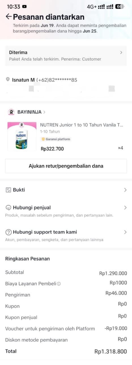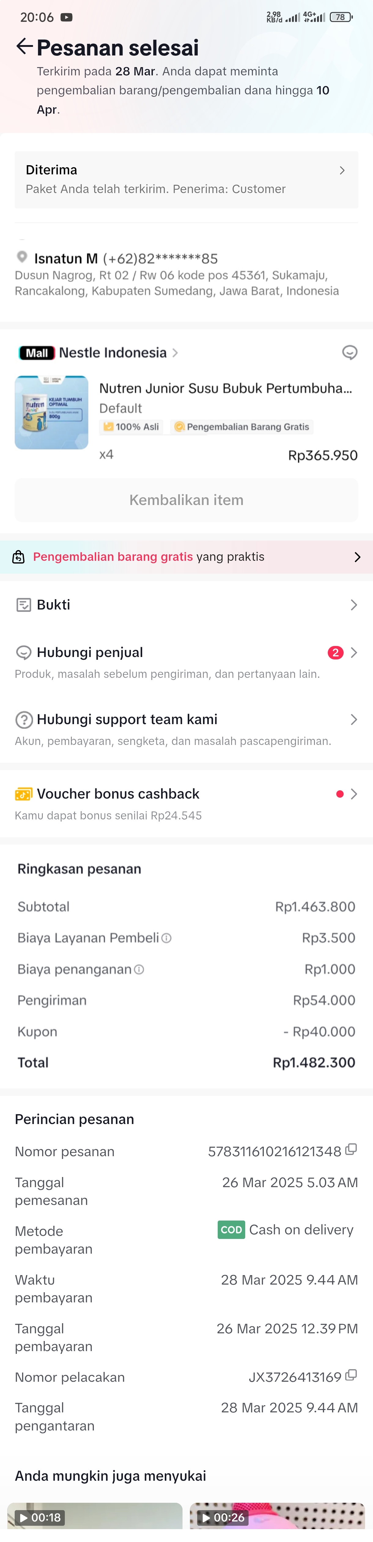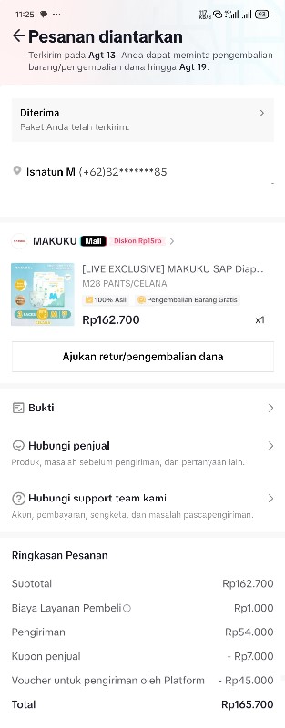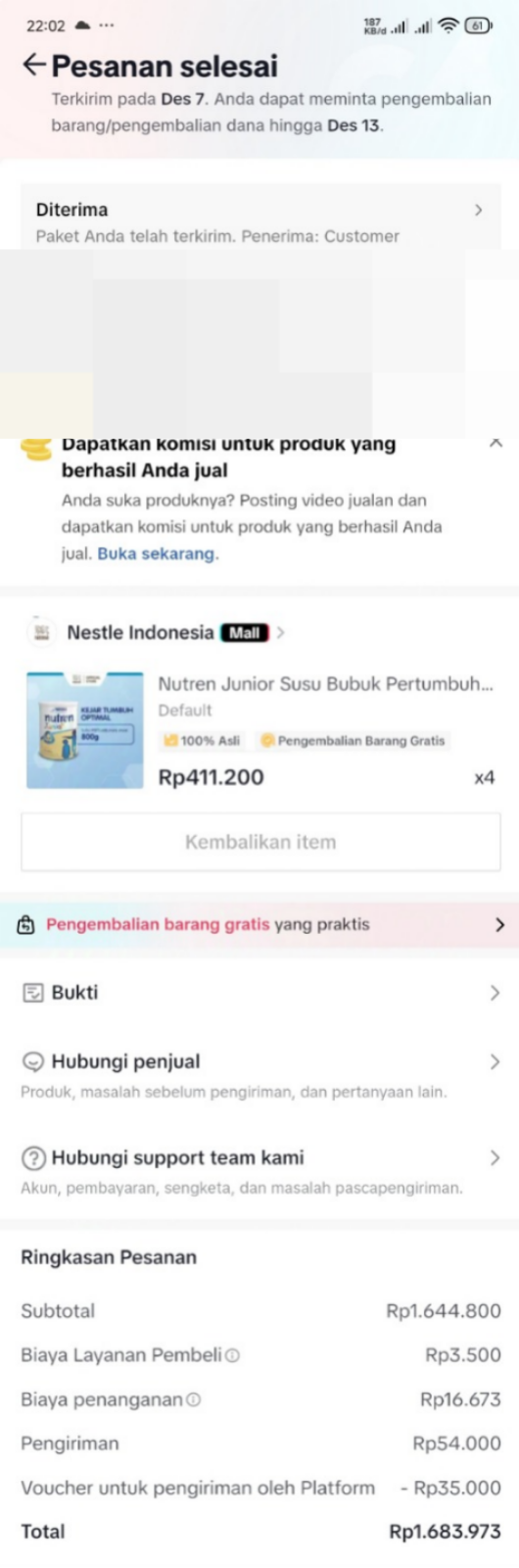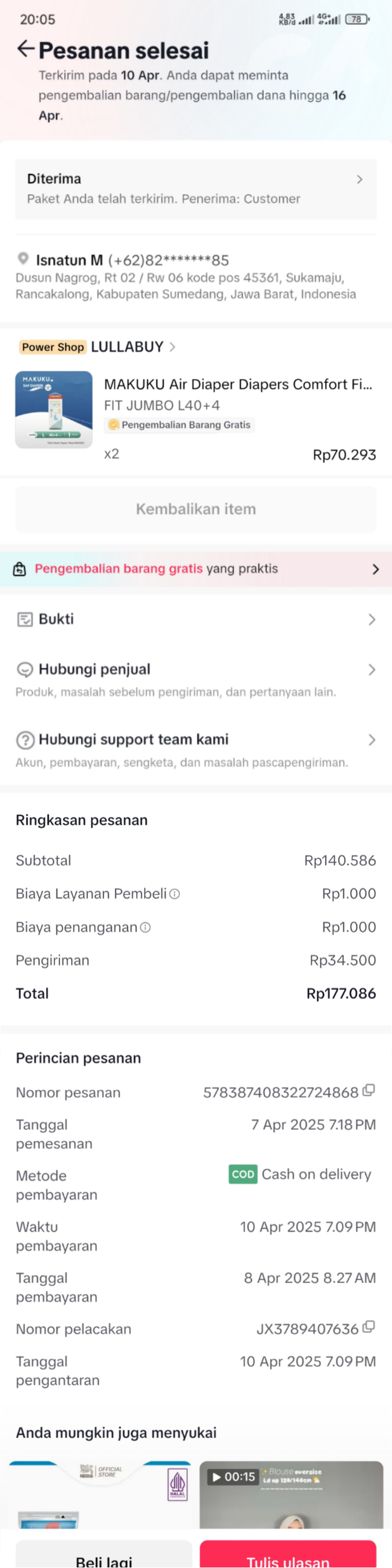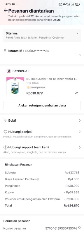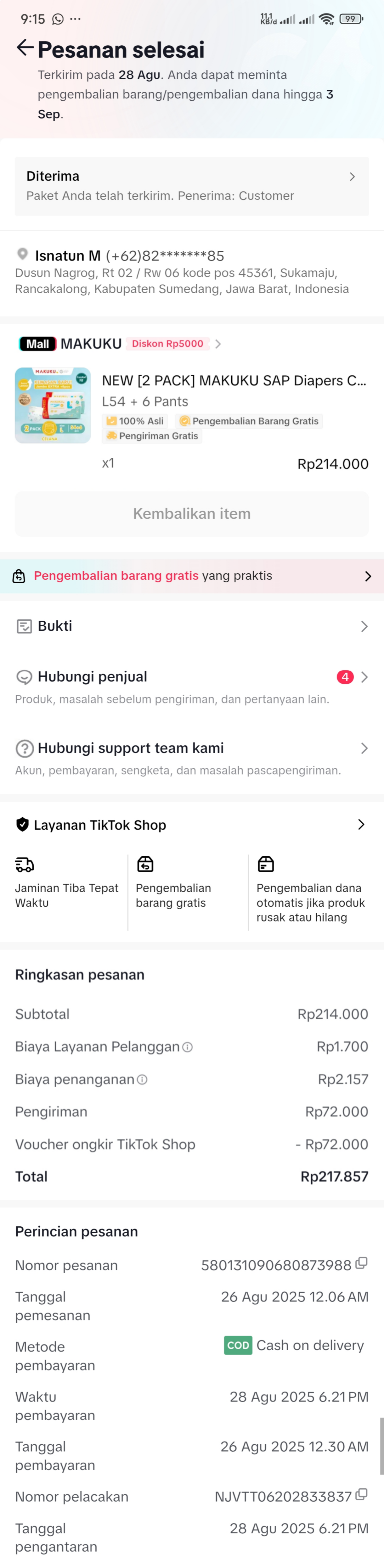 1. Pembelian 4 kaleng susu nutren Junior + ongkir 375.000 × 4 = Rp1.500.000 2. Pembeliam pampers makuku M28 56.700 x 3bal = Rp170.000 3. Pembelian vitamin bicara Generos Rp. 400.0002024-09-26 09:21:58