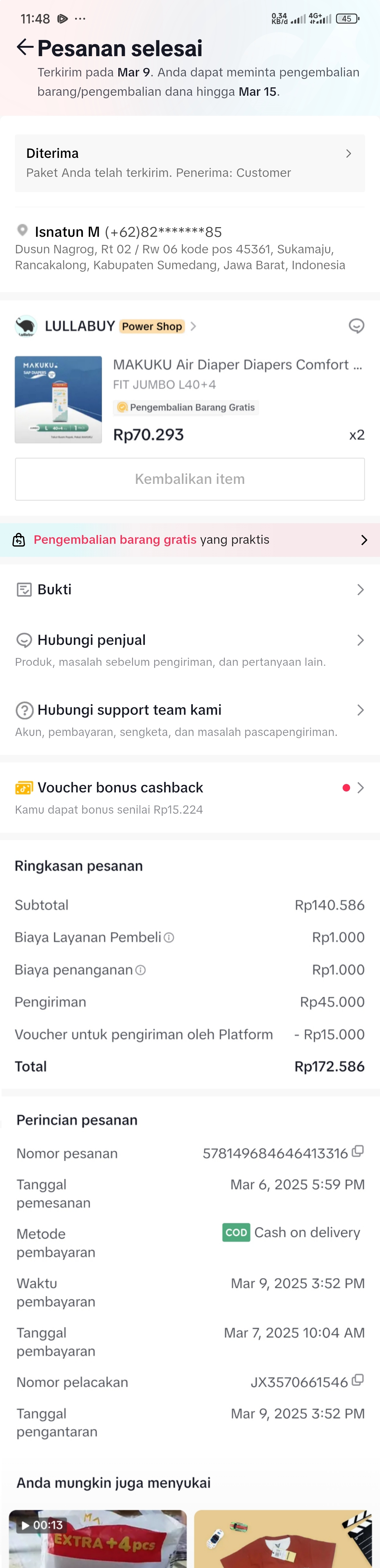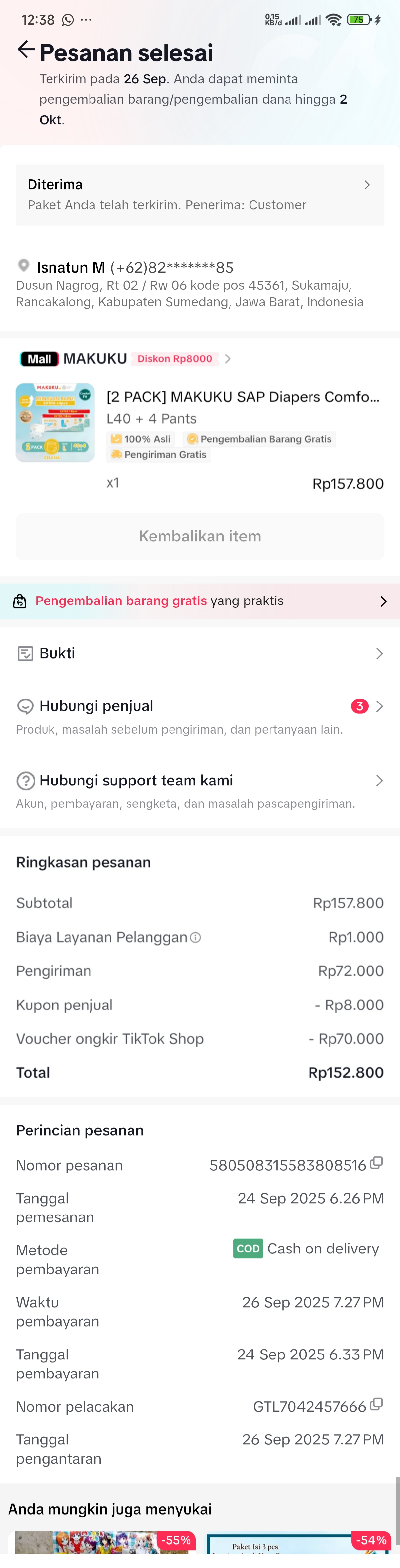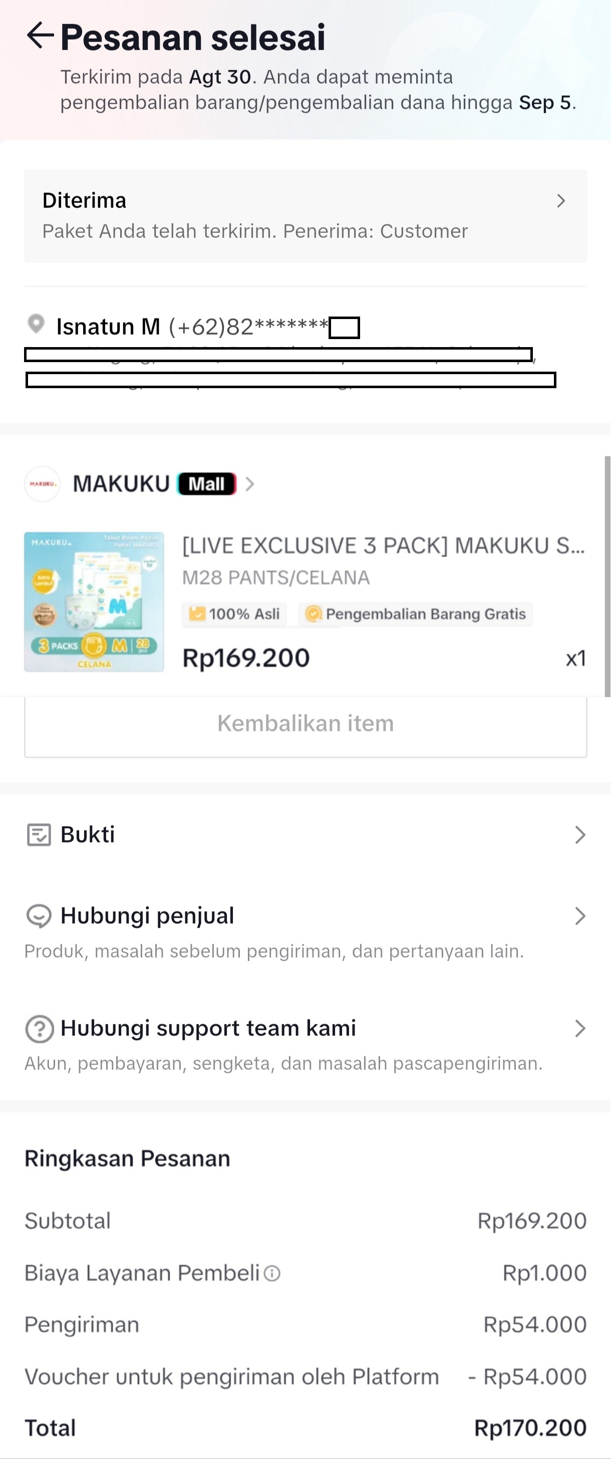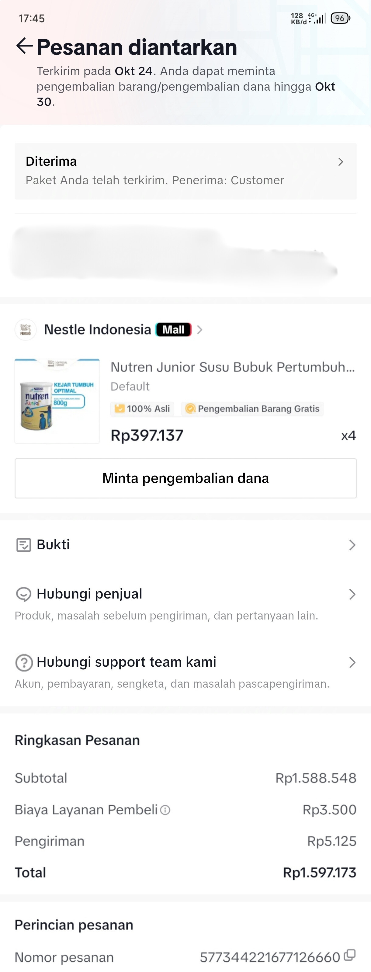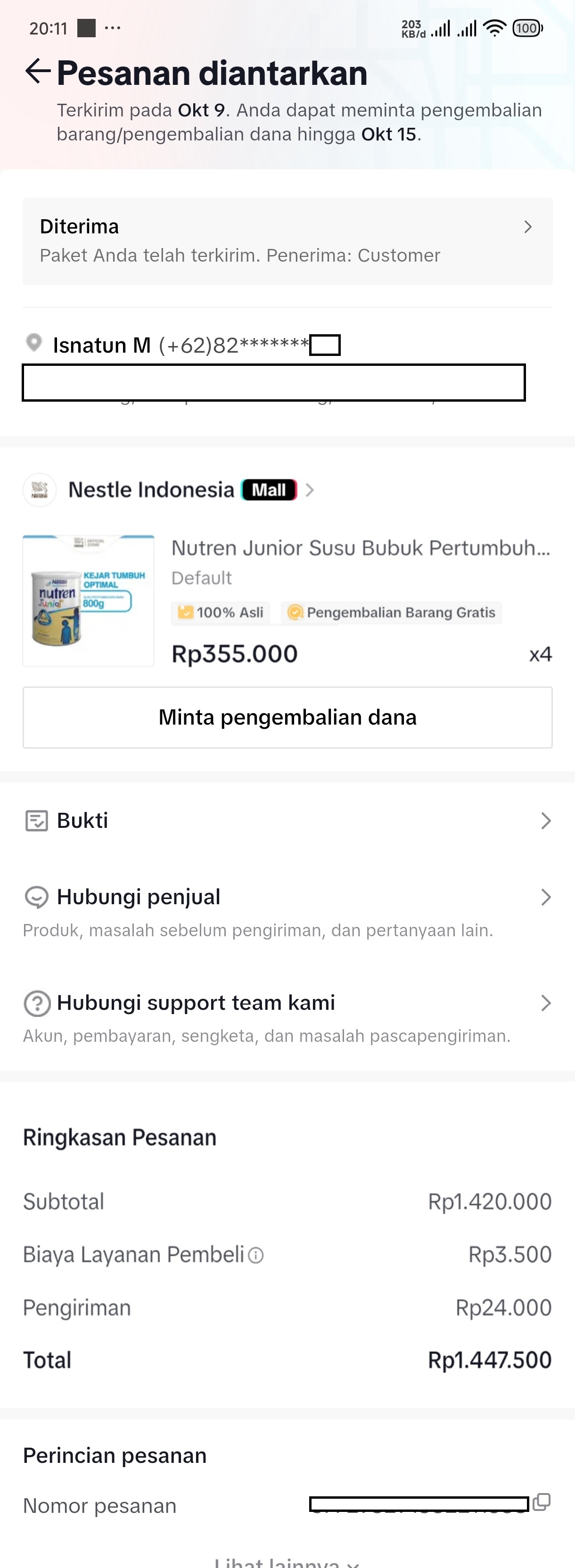 1. Pembelian 4 kaleng susu nutren Junior + ongkir 375.000 × 4 = Rp1.500.000 2. Pembeliam pampers makuku M28 56.700 x 3bal = Rp170.000 3. Pembelian vitamin bicara Generos Rp. 400.0002024-09-26 09:21:58