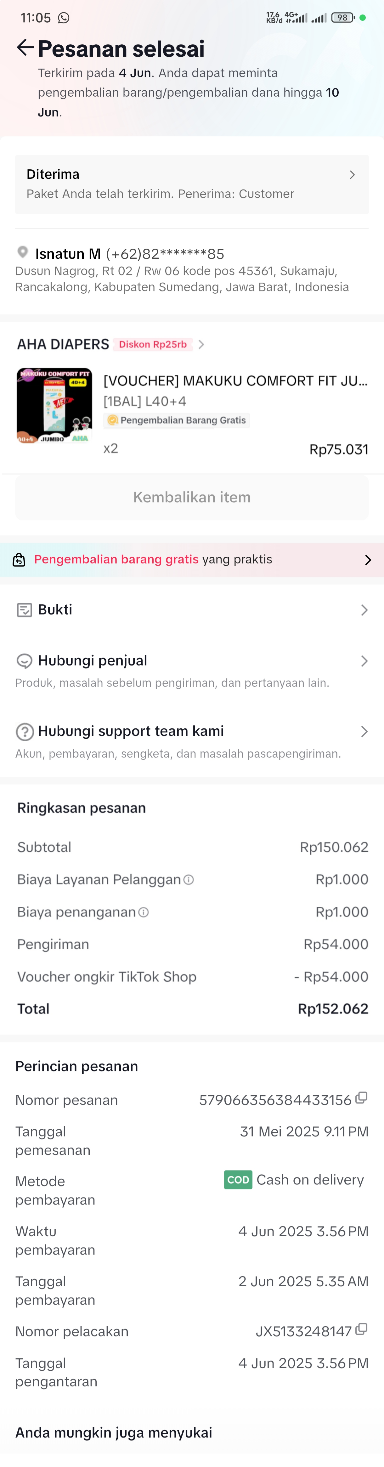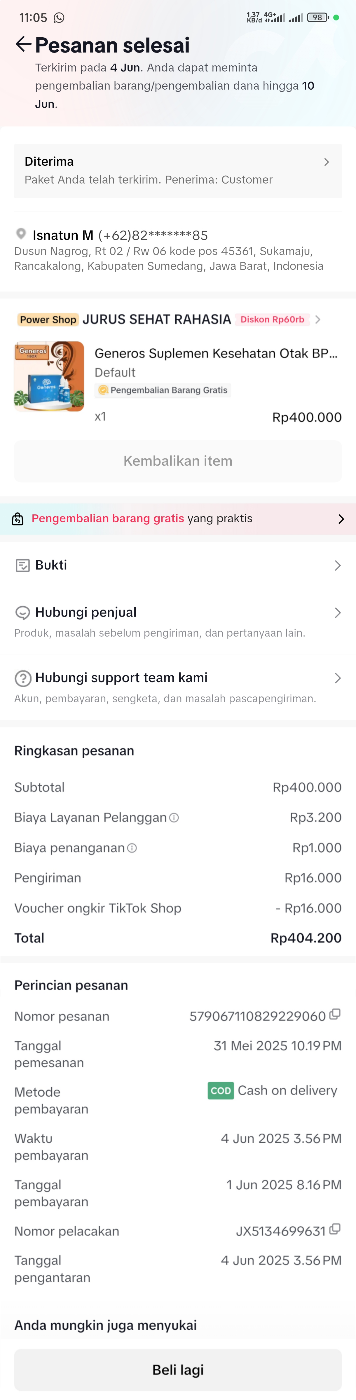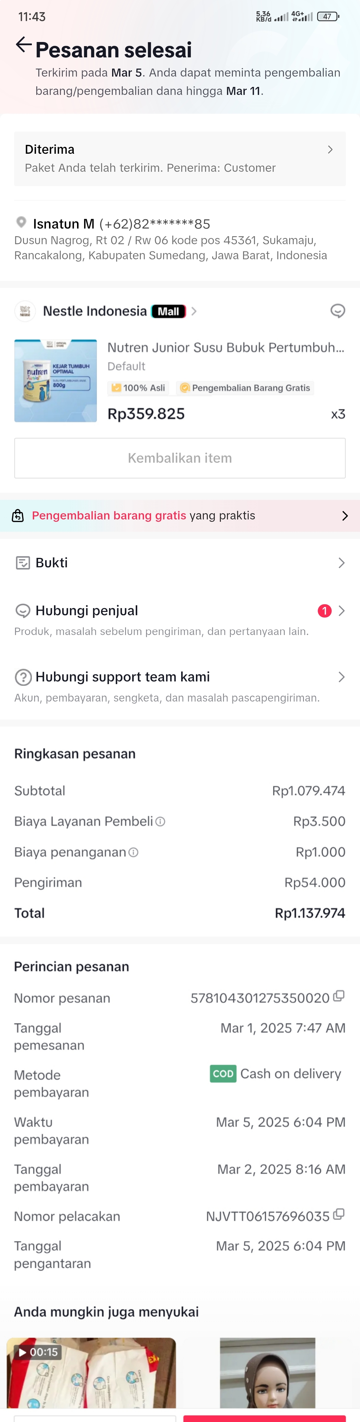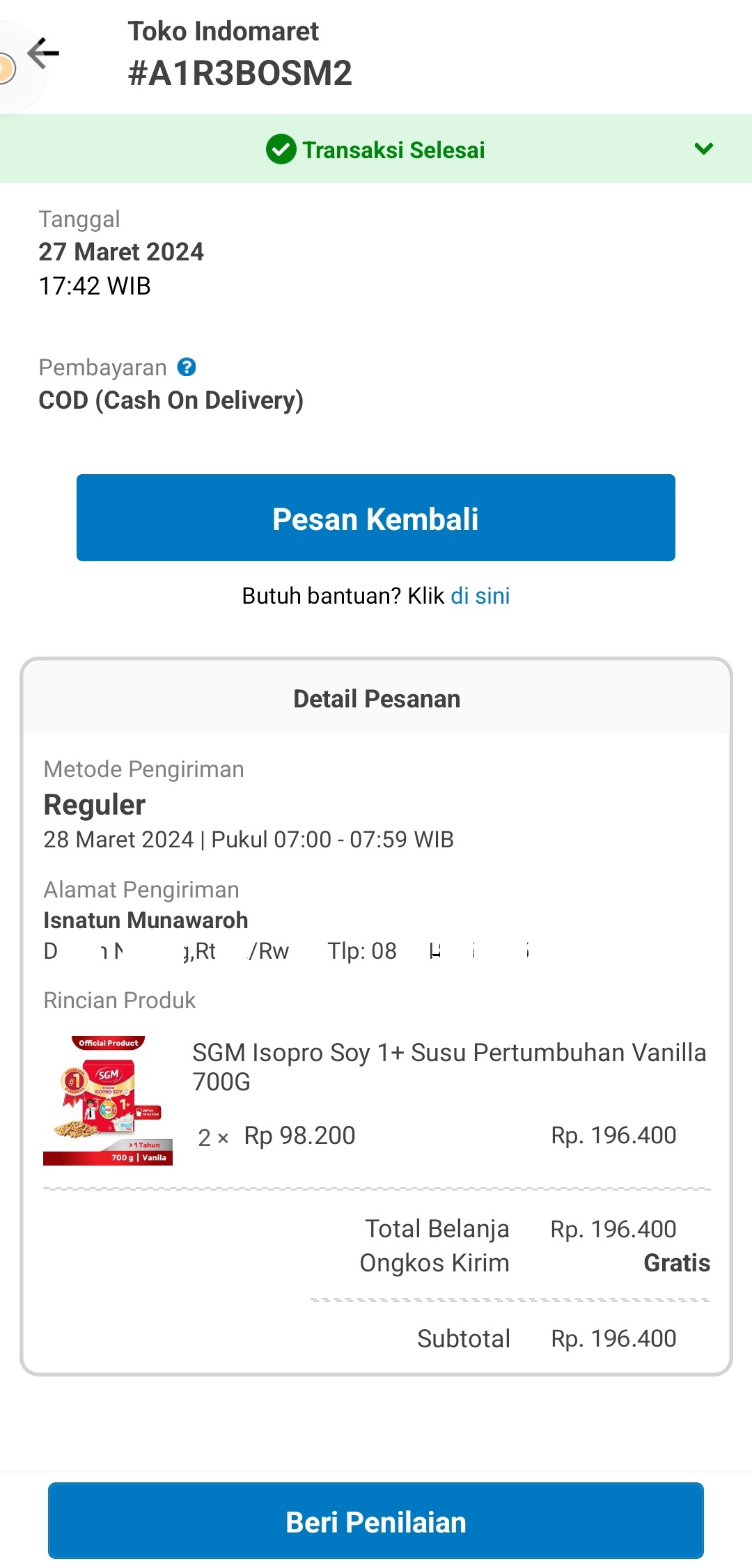 1. Pembelian 4 kaleng susu nutren Junior + ongkir 375.000 × 4 = Rp1.500.000 2. Pembeliam pampers makuku M28 56.700 x 3bal = Rp170.000 3. Pembelian vitamin bicara Generos Rp. 400.0002024-09-26 09:21:58
