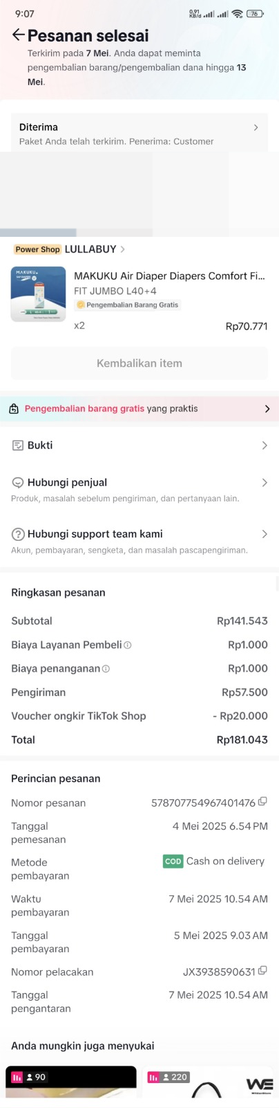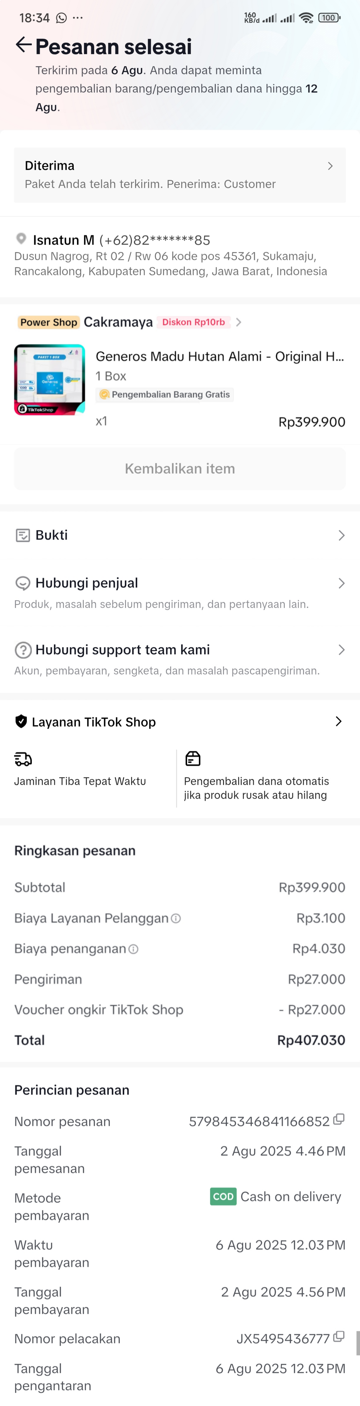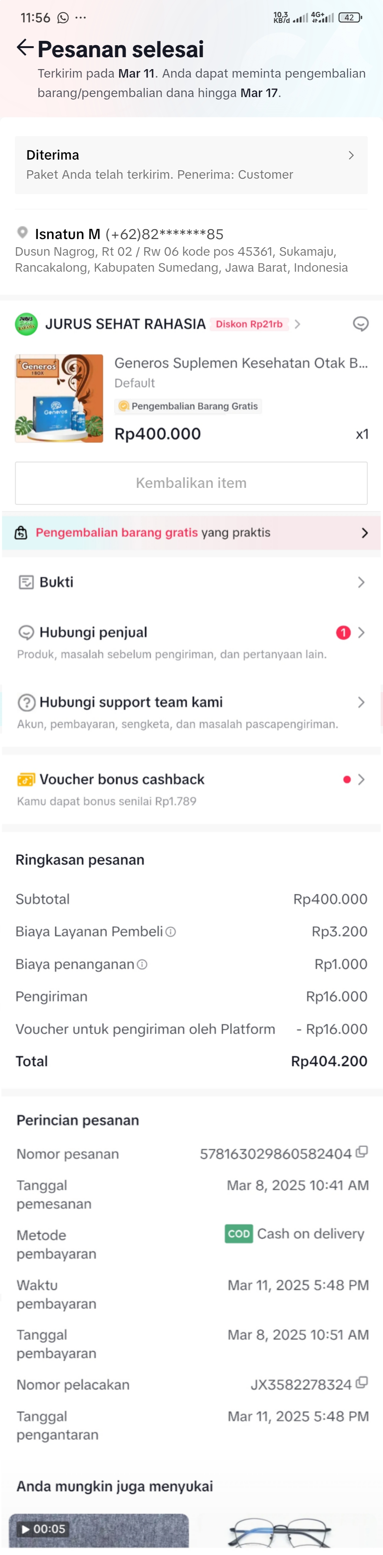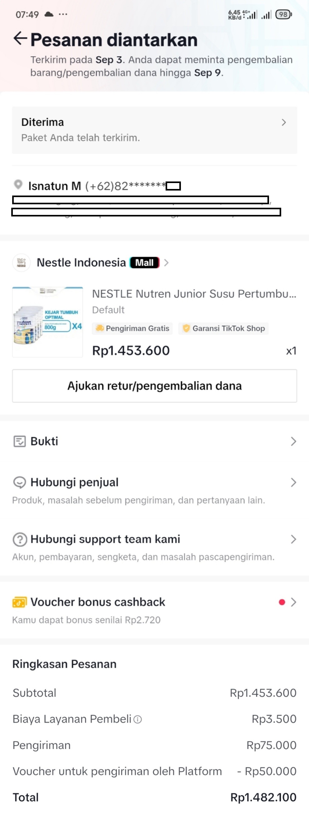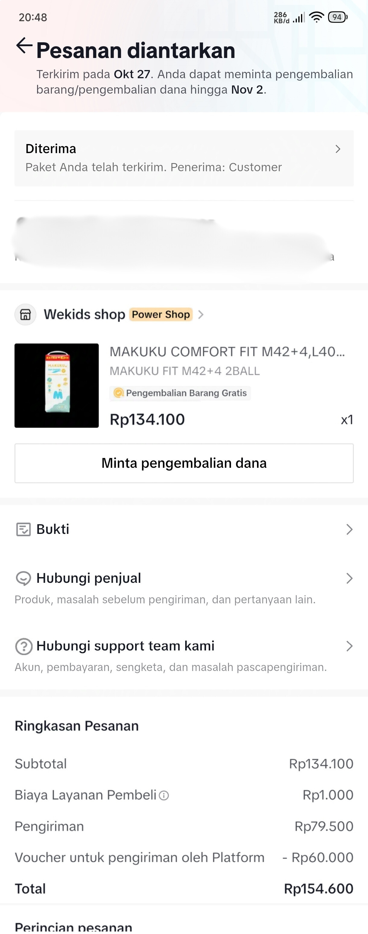 1. Pembelian 4 kaleng susu nutren Junior + ongkir 375.000 × 4 = Rp1.500.000 2. Pembeliam pampers makuku M28 56.700 x 3bal = Rp170.000 3. Pembelian vitamin bicara Generos Rp. 400.0002024-09-26 09:21:58