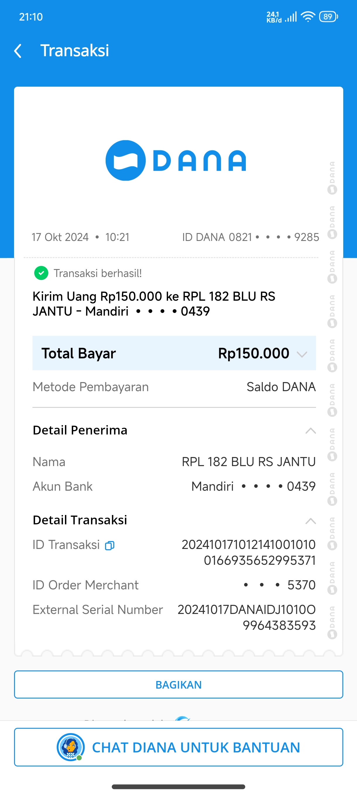 Dana digunakan untuk 1. Susu Nutren Junior Rp375.000×4 kaleng= Rp1.500.000 2. Transportasi dari sumedang-Jakarta Rp140.000/×2 orang= Rp280.0002025-10-24 16:39:23