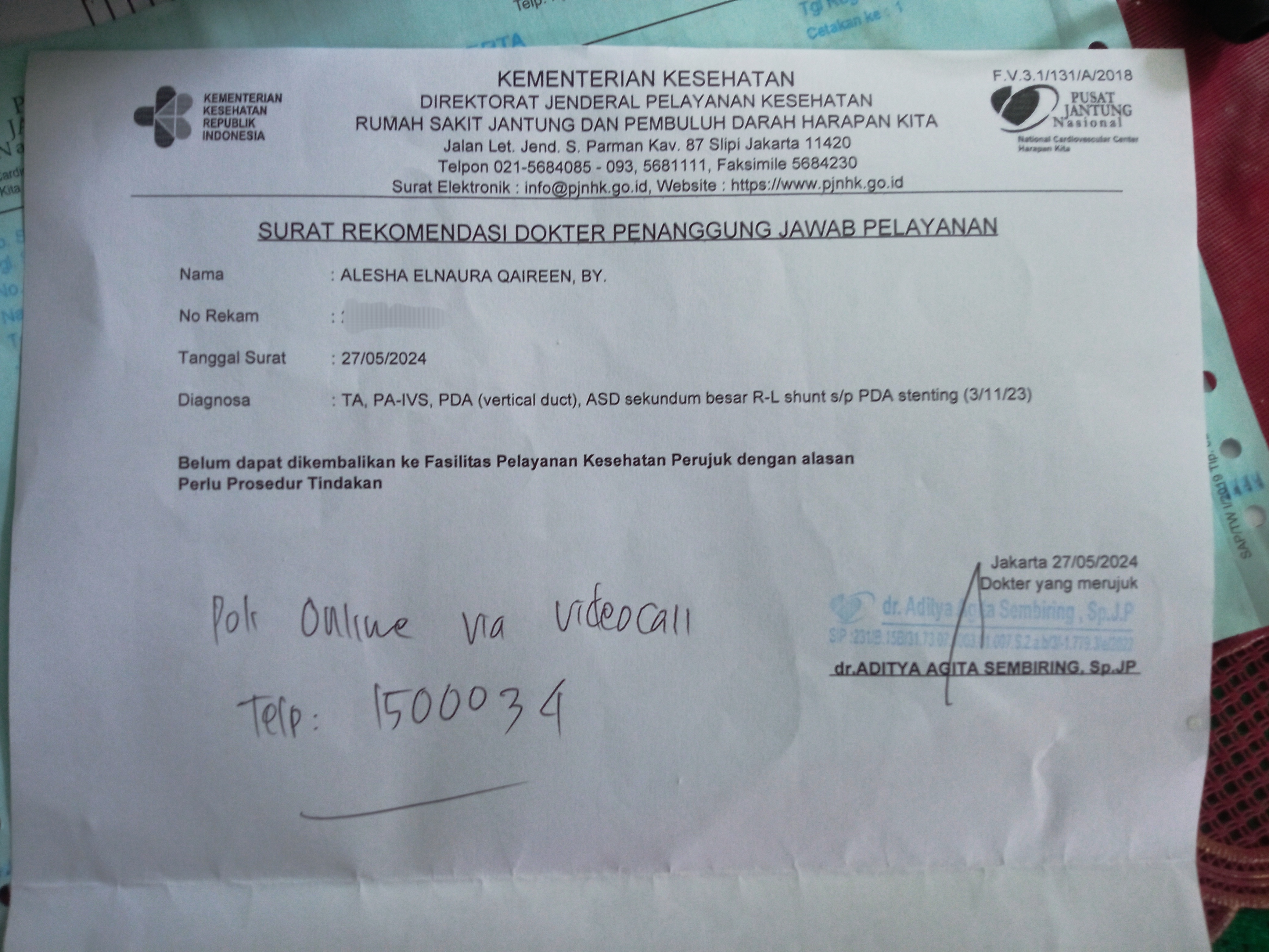 Sejauh ini, Alesha masih rutin kontrol ke rumah sakit untuk penebusan obat Aspilet dan Bisoprolol, sekaligus memantau saturasi serta tumbuh kembangnya. Saat ini kami juga tengah mempersiapkan tindakan kateter yang dijadwalkan pada bulan November nanti. Namun, akhir-akhir ini kebiruan pada bibir dan jari kaki Alesha semakin sering terlihat, terutama ketika ia kelelahan. Karena itu, aktivitas Alesha di luar rumah sangat dibatasi agar tidak mudah drop.