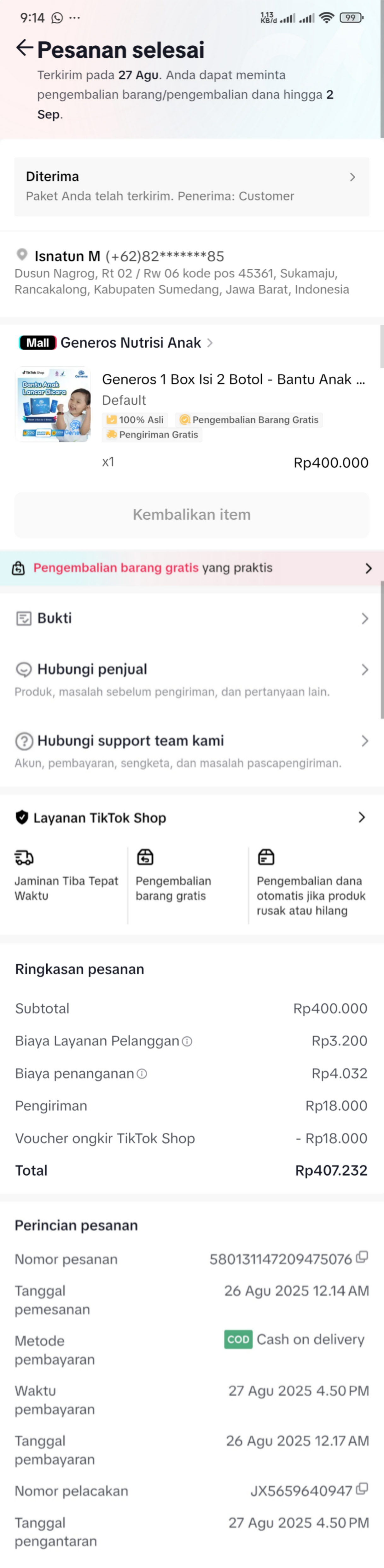 Dana digunakan untuk 1. Nutren Junior Rp375.000 × 4 = Rp1.500.000 2. Pampers Makuku L Rp75.000 x 2 = Rp150.000 3. Vitamin Generos Rp400.000.2025-09-25 09:17:44