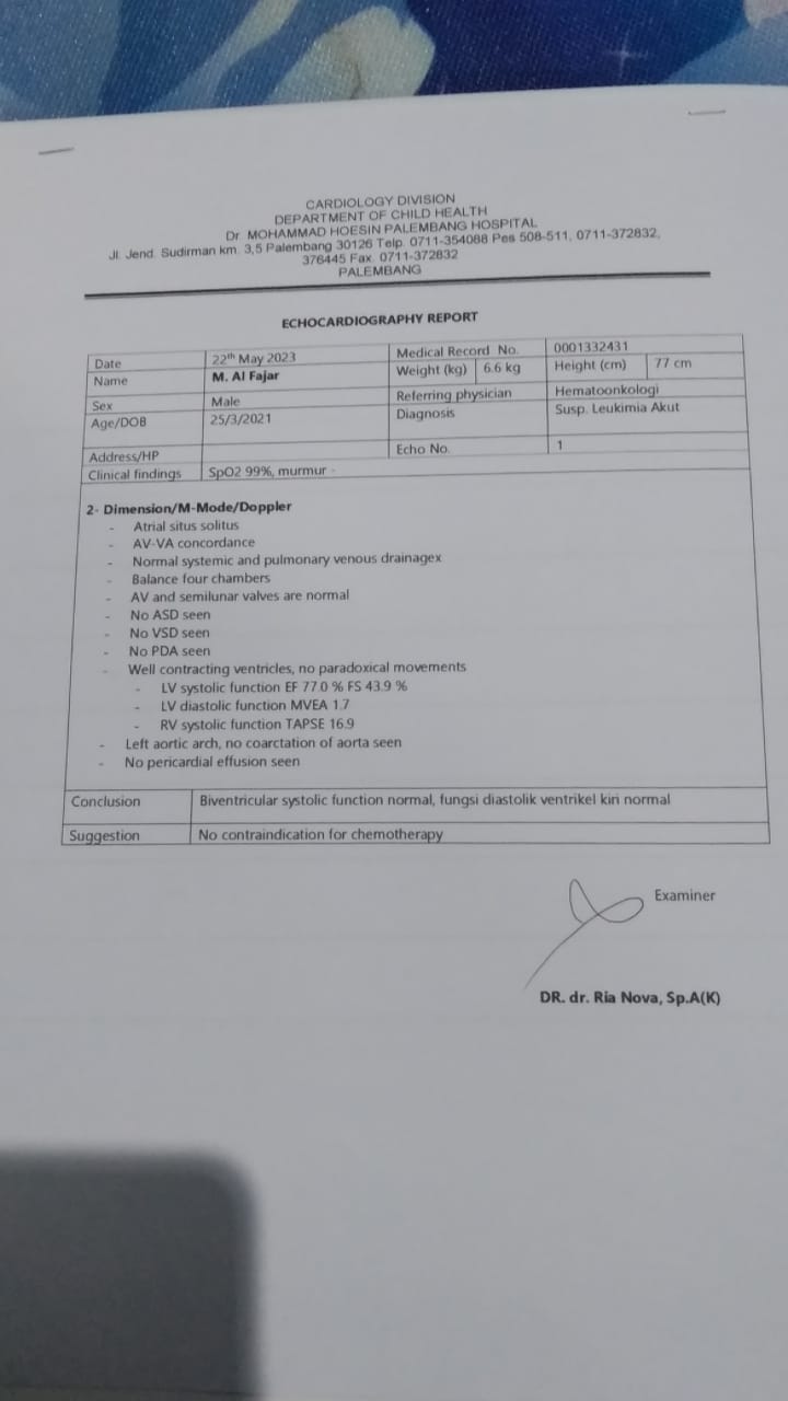 Setelah dilakukan berapa kali pemeriksaan, di pemeriksaan ECHO, anakku didiagnosa Leukemia akut. Pilu hati kami bahwa ditemukan penyakit lain di tubuh kecilnya ini.