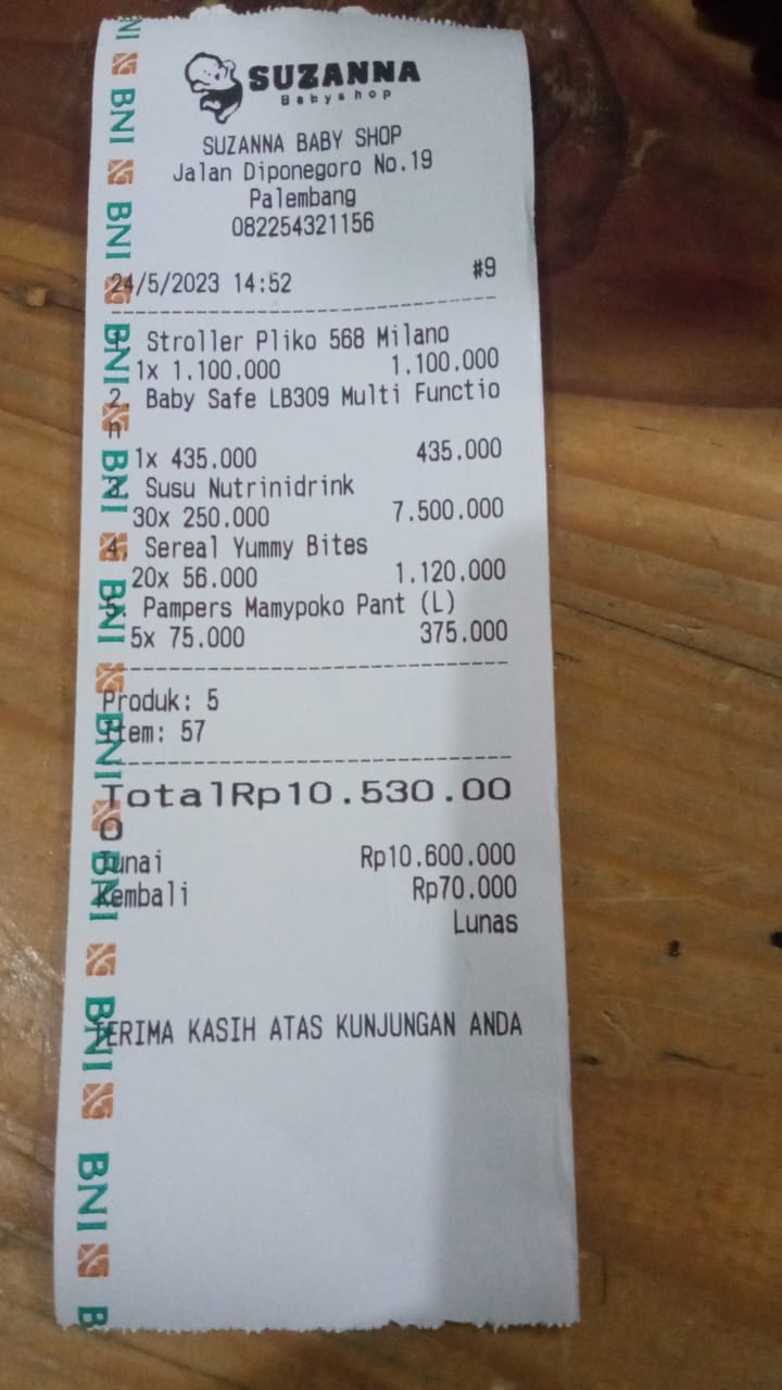 Dana digunakan untuk 1. Susu Nutridrink untuk konsumsi 1 bulan 10 hari 250.000 x 30 kaleng= Rp7.500.000 2. Sereal Yummy Bites untuk konsumsi 15 hari 56.000 x 20 kotak= Rp1.120.000 3. Stroller Rp1.100.000 4. Sterilizer botol Rp435.000 5. Pampers 75.000 x 5 ball= Rp375.000.2023-05-22 19:01:25