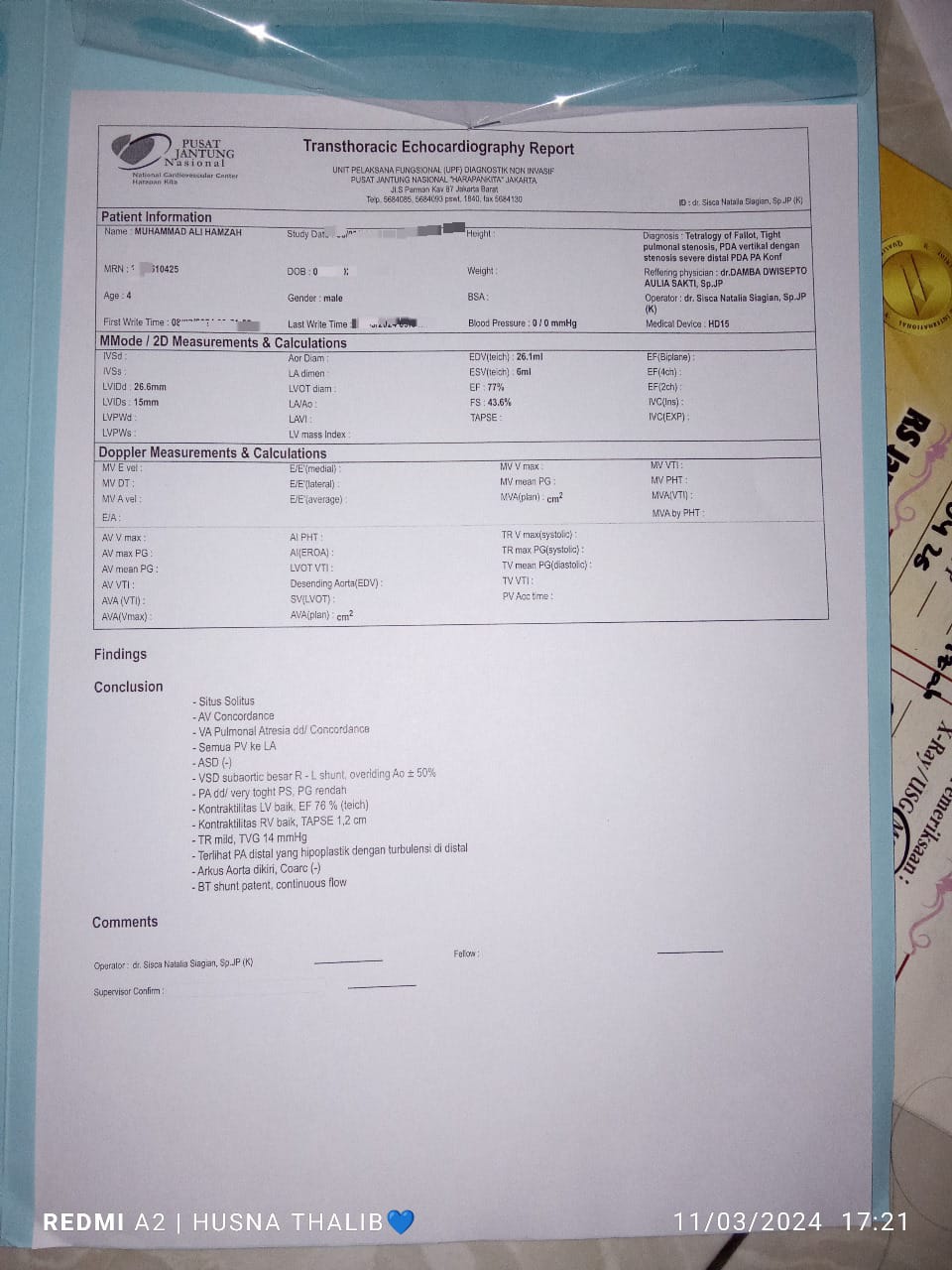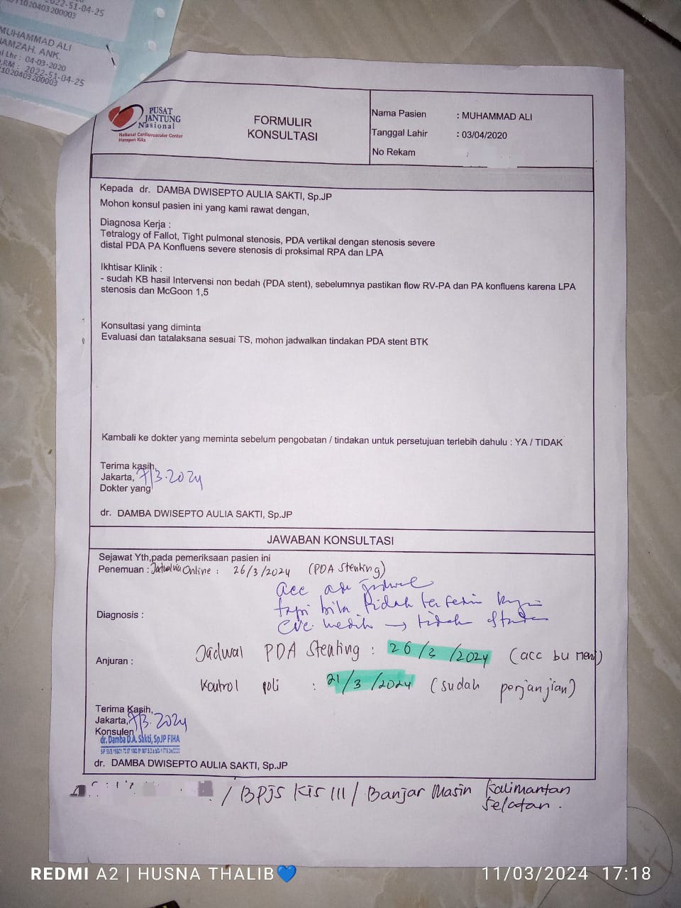 Saya ingin memberikan kabar terkait kondisi terkini anak saya, Ali hamzah. Saat ini kami masih menetap di Jakarta untuk menjalani pengobatan Ali yang memang dirujuk di Rumah Sakit Jantung Harapan Kita Jakarta. Alhamdulillah Ali sudah mendapatkan tindakan PDA STENT (pemasangan ring pada jantung) yang sebelumnya sempat tertunda karena ruangan CVCU dan ICU selalu full.