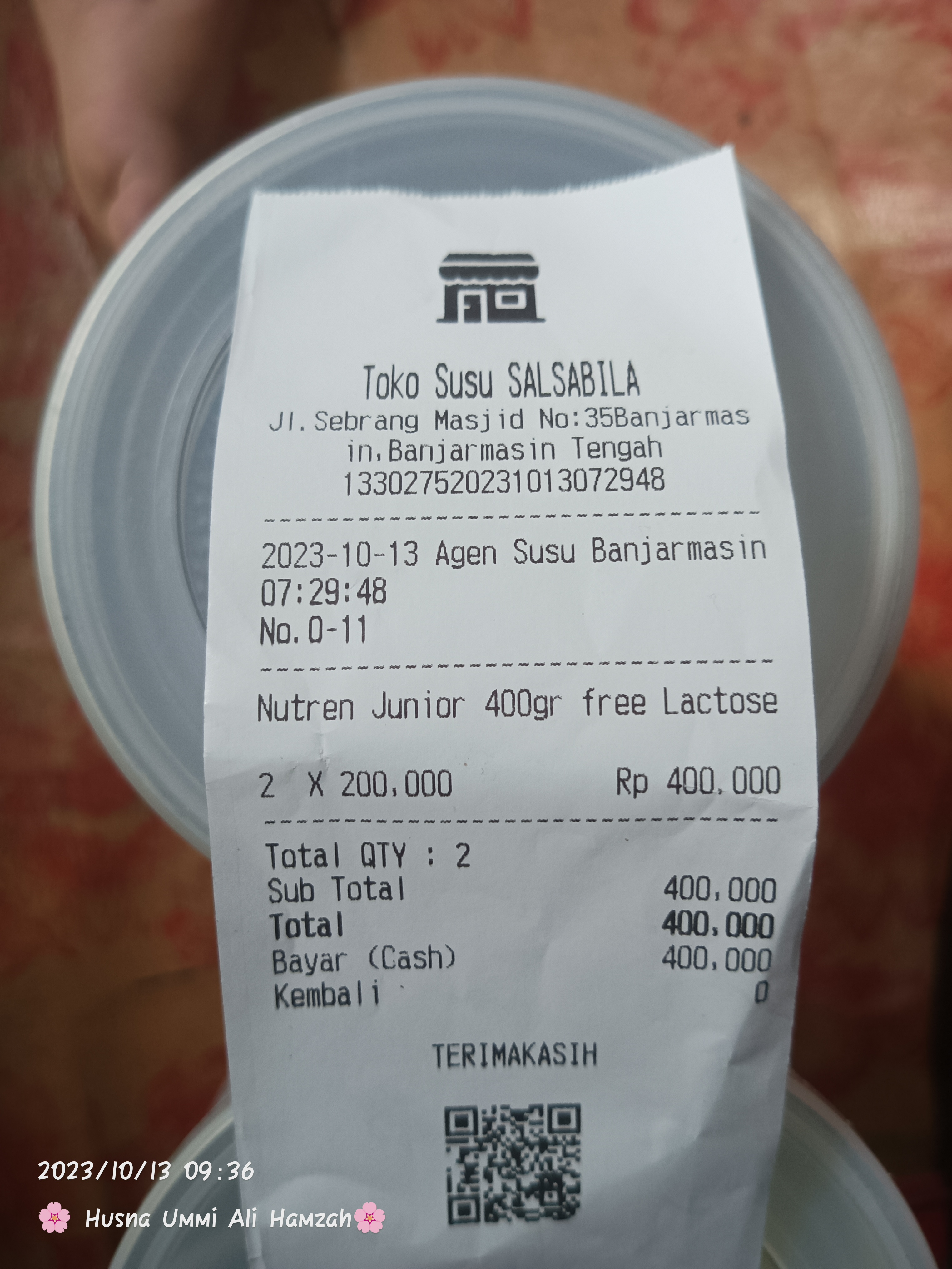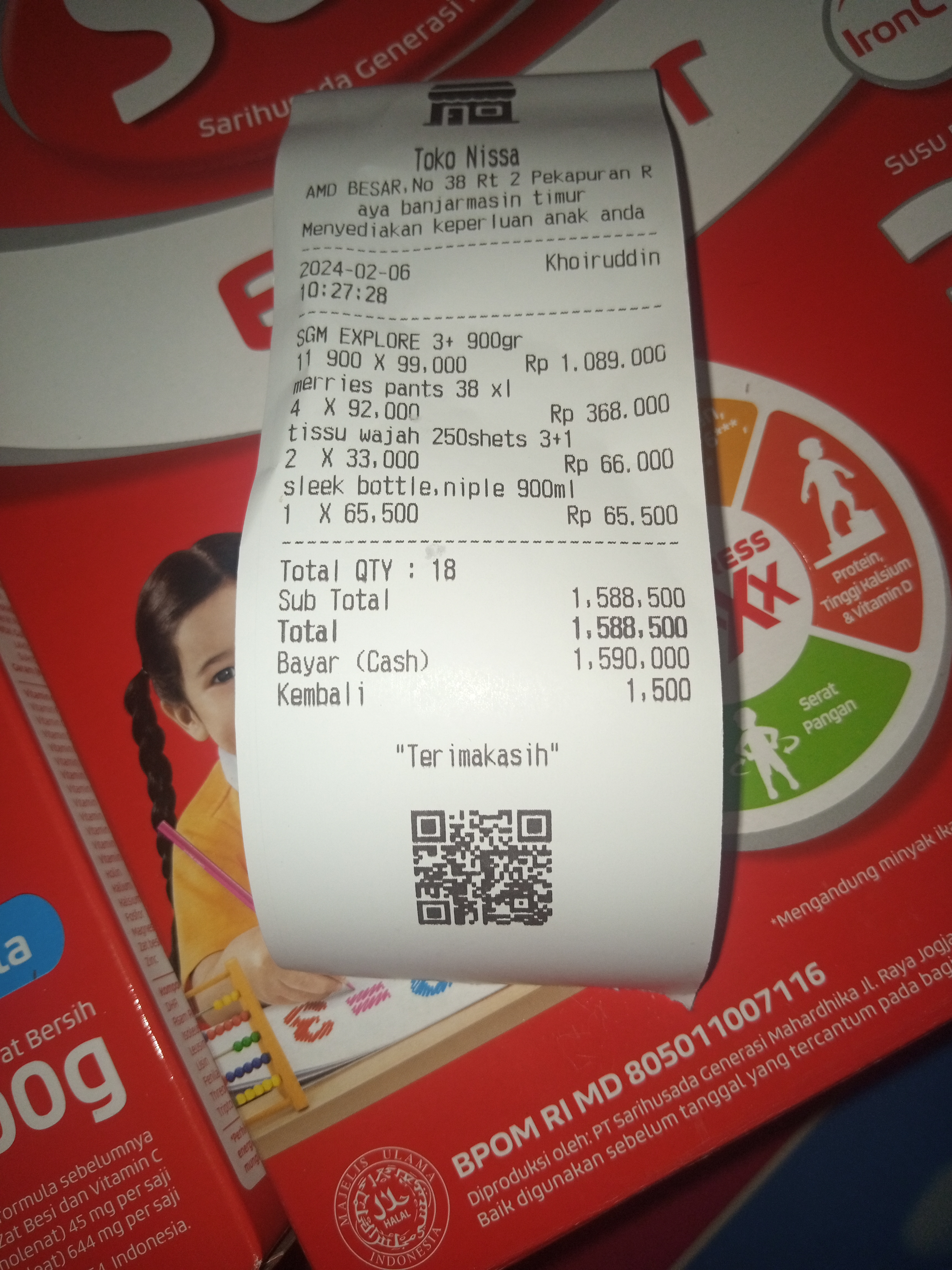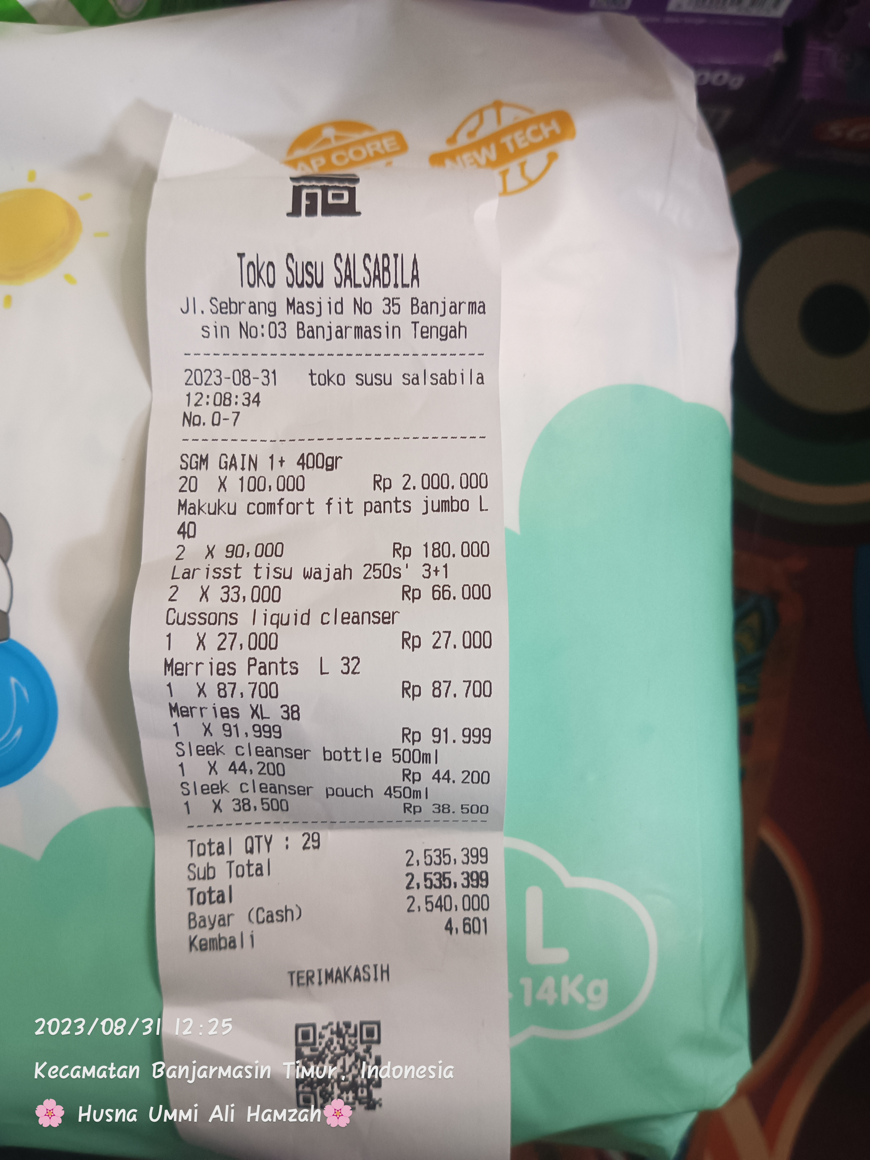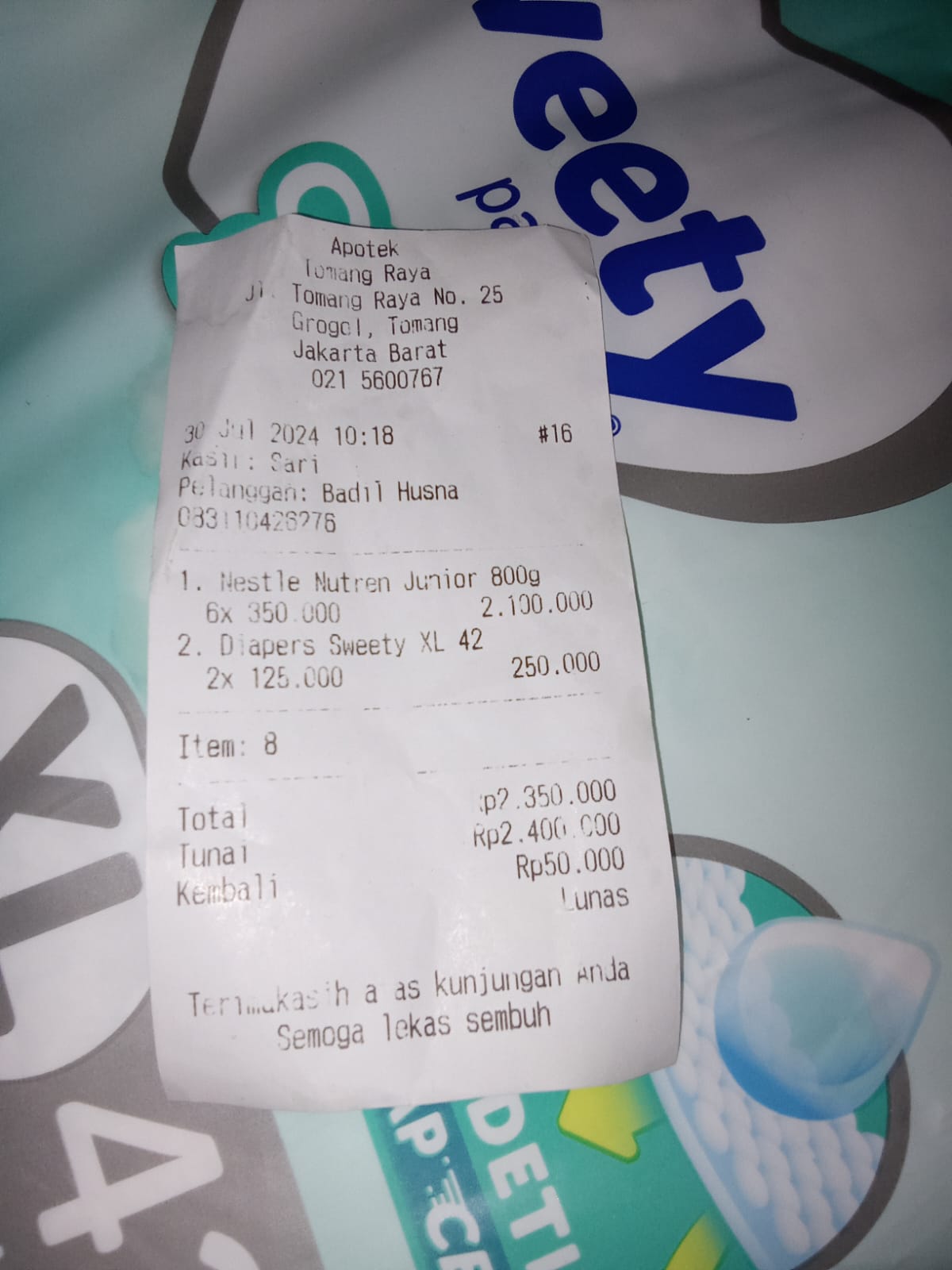 Pembelian susu Nutren Junior Vanilla 850gram 6kaleng @350.00*6 Pembelian pempes sweety pants xl isi 42 ball @125.000*22024-07-30 10:02:22