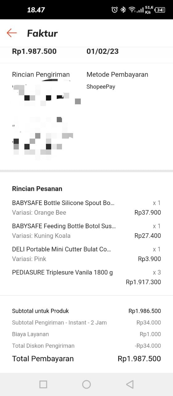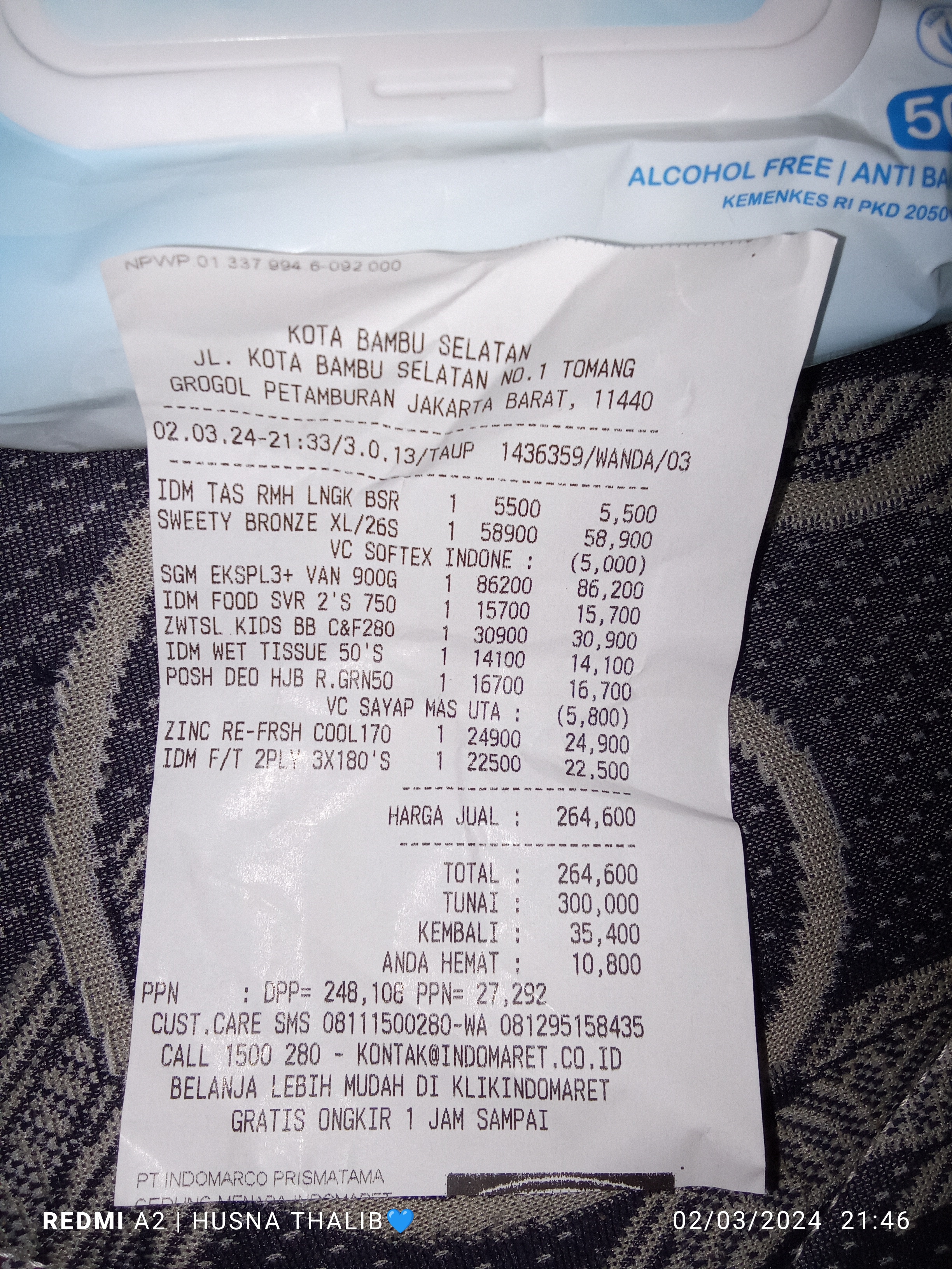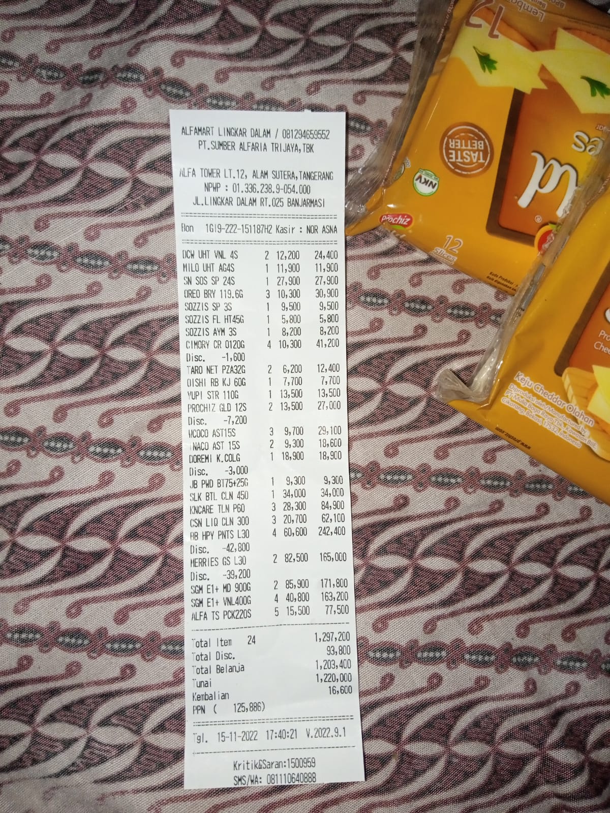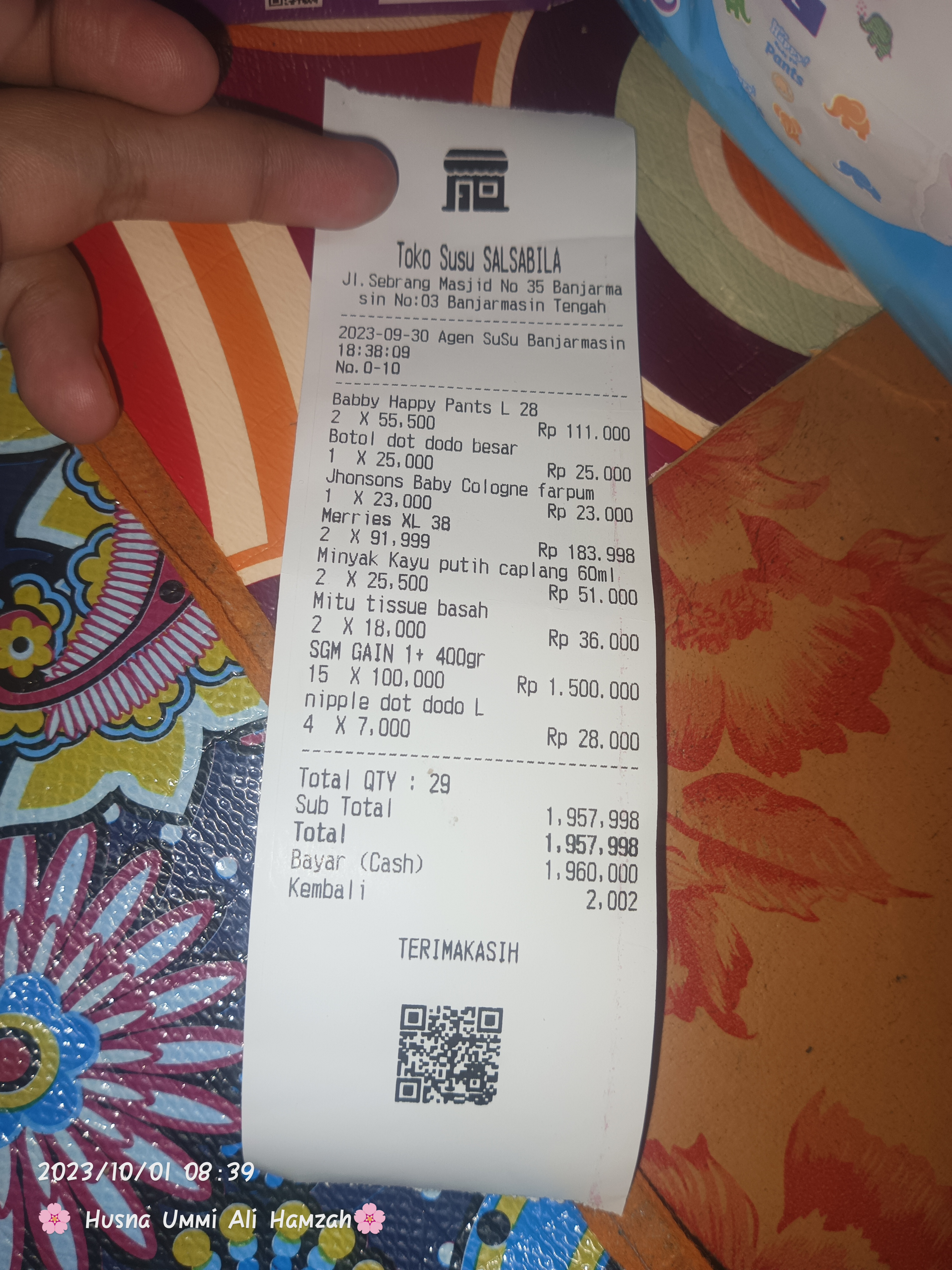 Pembelian susu Nutren Junior Vanilla 850gram 6kaleng @350.00*6 Pembelian pempes sweety pants xl isi 42 ball @125.000*22024-07-30 10:02:22