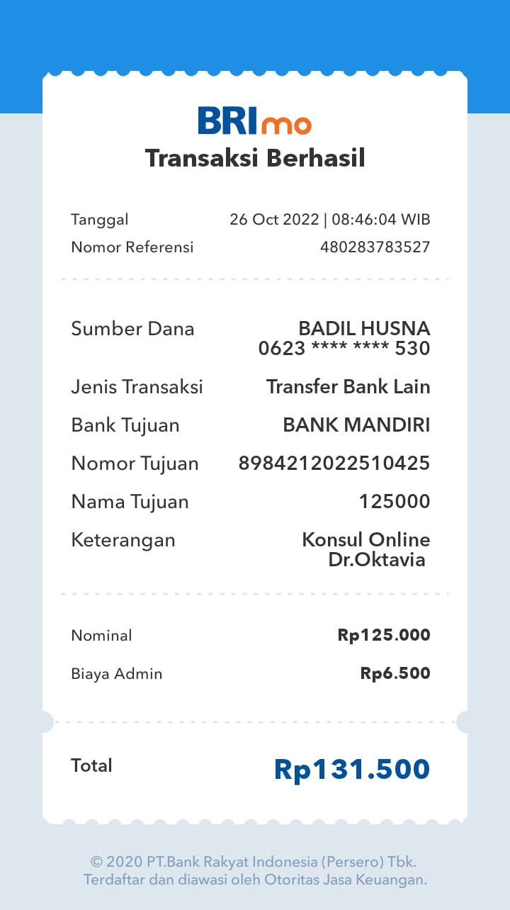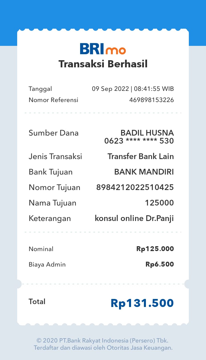 Dana digunakan untuk: 1. Bayar biaya konsultasi online dengan dr.Jantung RS.Jantung Harapan Kita di Rabu tanggal 7 September (diundur ke tanggal 21 September) 131.500 2. Bayar biaya konsultasi online dengan dr.Bedah RS.Jantung Harapan kita Rabu 14 September 131.500 Total 263.0002022-09-13 17:25:30