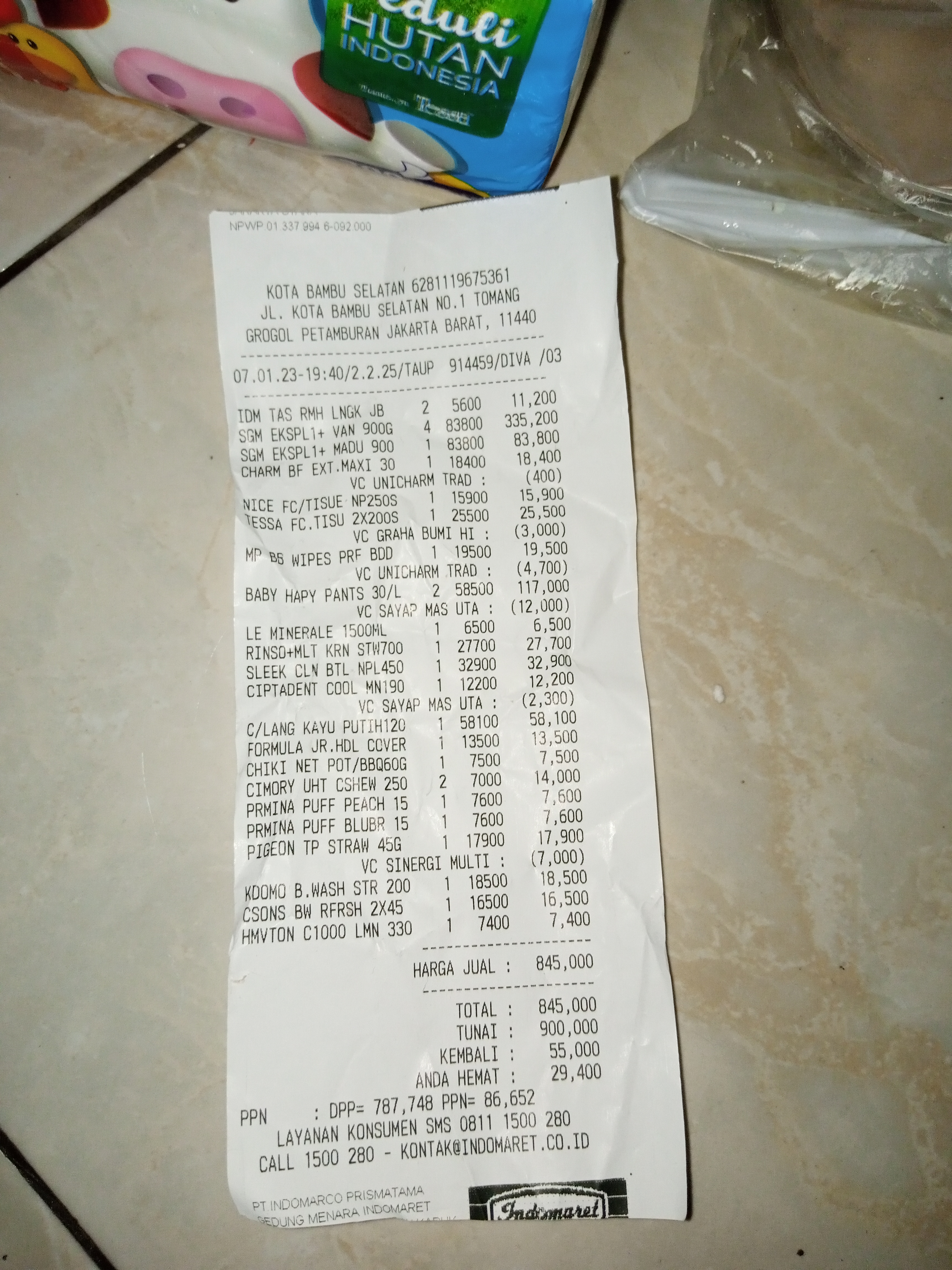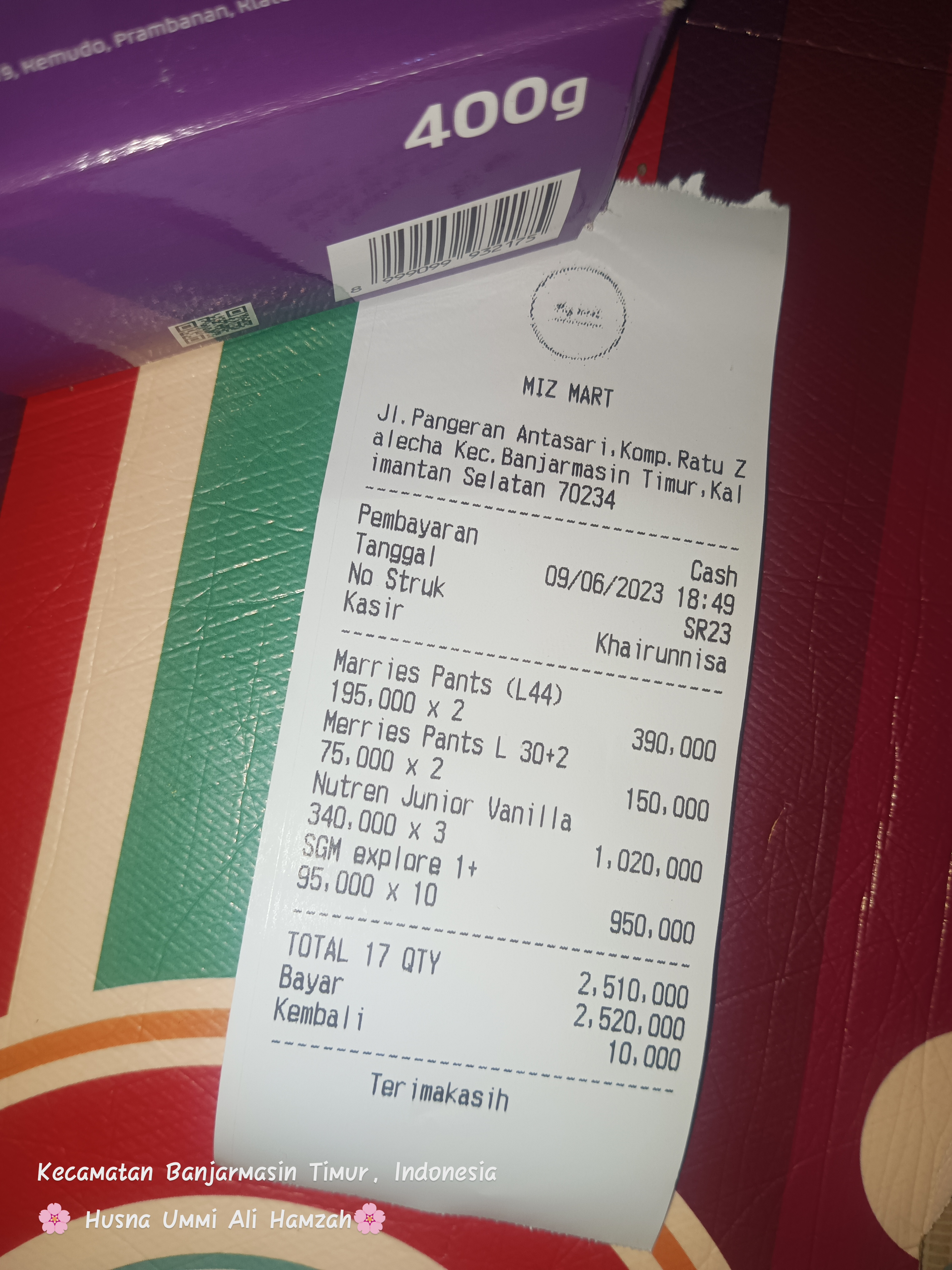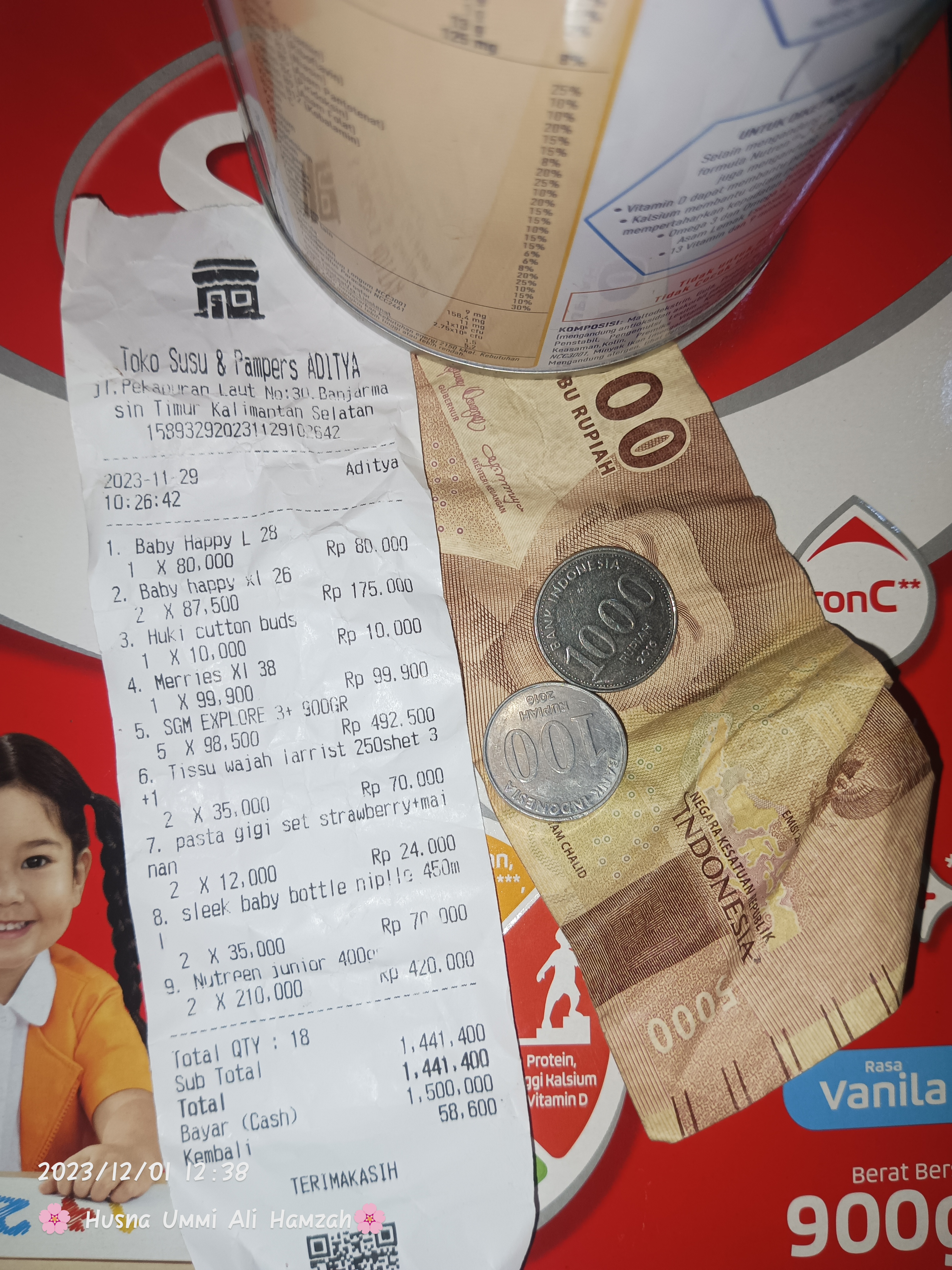 Dana digunakan untuk 1. Susu Nutren Junior 400 gram 210.000 x 2 kaleng= Rp420.000 2. Susu SGM Explore 3+ 900 gram 98.500 x 5 kotak= Rp492.500 3. Pasta gigi set sikat gigi kodomo 12.000 x 2 pcs= Rp24.000 4. Tisu kering 35.000 x 2= Rp70.000 5. Sabun dot sleek 450 ml 35.000 x 2= Rp70.000 6. Huki cottonbuds Rp10.000 7. Popok Baby happy ukuran L Rp80.000 8. Popok Baby happy ukuran XL 87.500 x 2= Rp175.000 9. Popok Merries ukuran XL Rp99.900.2023-11-30 18:10:16