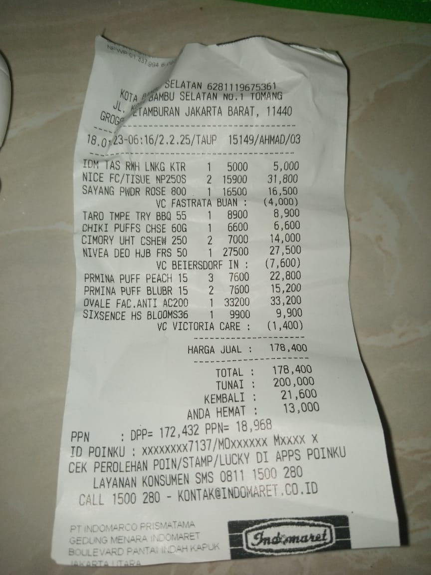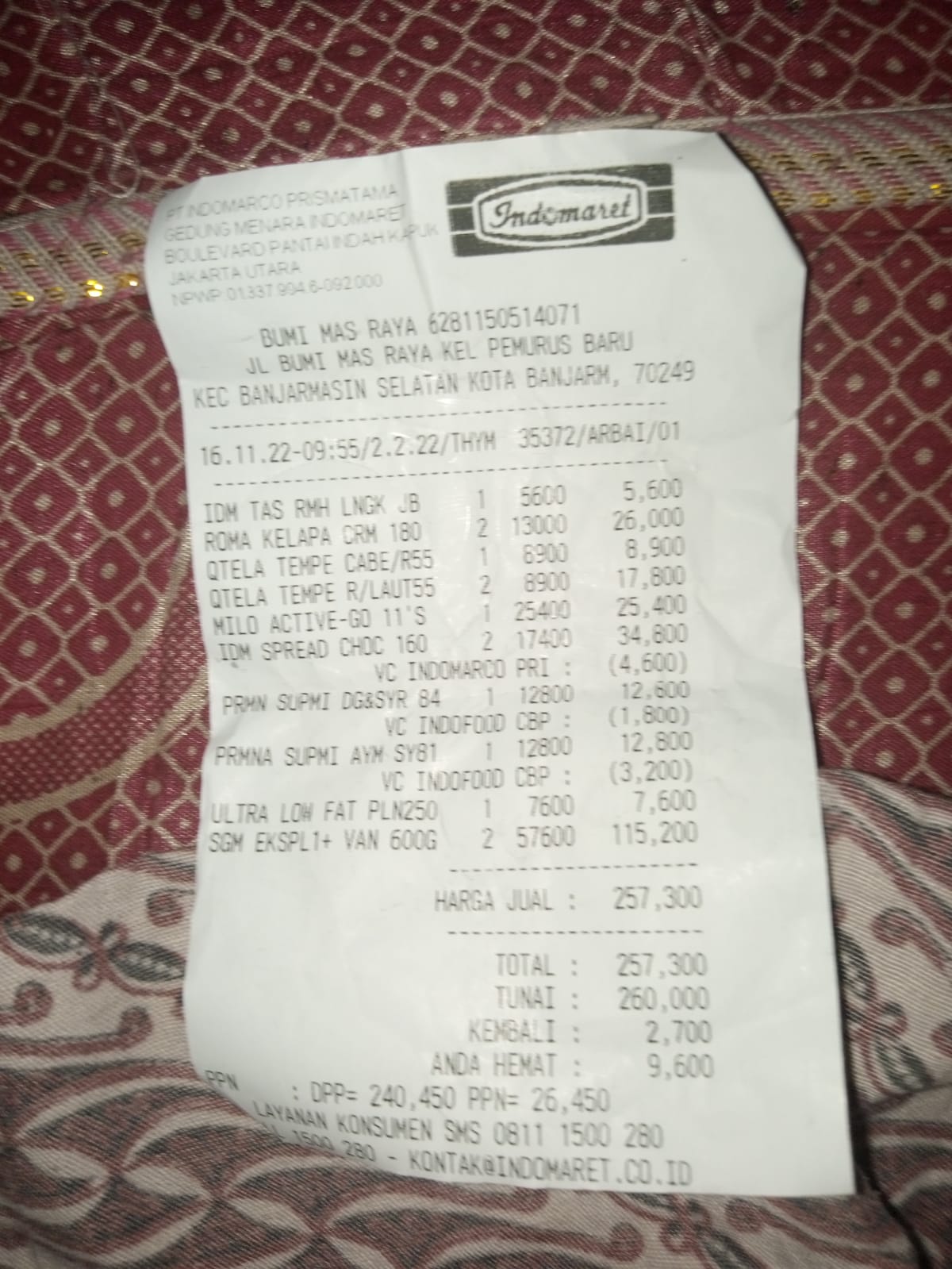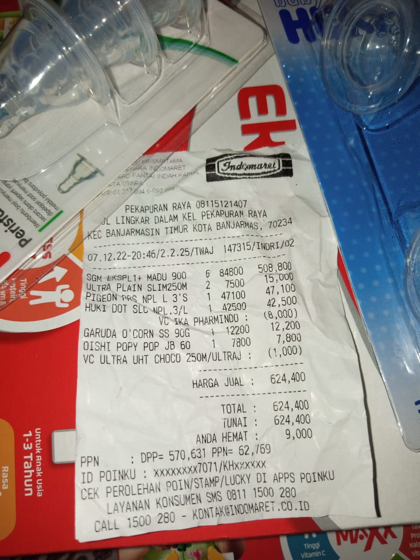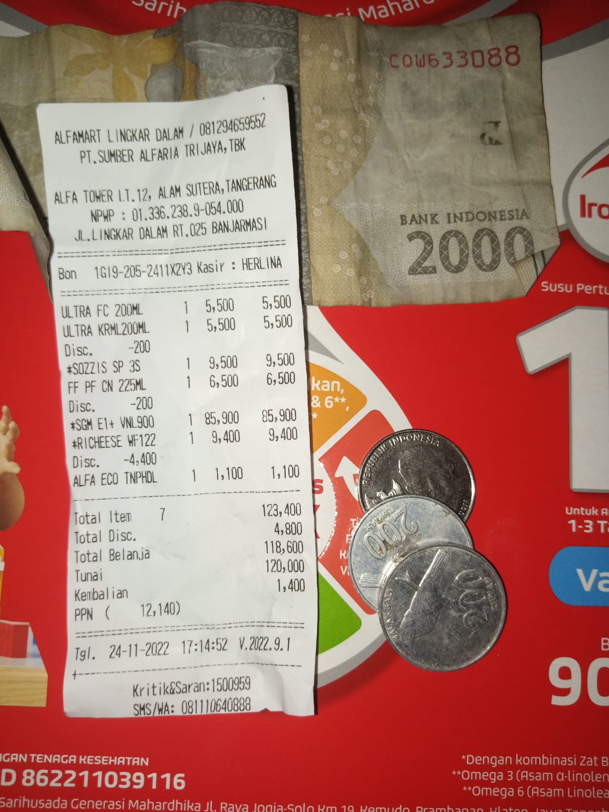 Dana digunakan untuk 1. Susu Nutren Junior 400 gram 210.000 x 2 kaleng= Rp420.000 2. Susu SGM Explore 3+ 900 gram 98.500 x 5 kotak= Rp492.500 3. Pasta gigi set sikat gigi kodomo 12.000 x 2 pcs= Rp24.000 4. Tisu kering 35.000 x 2= Rp70.000 5. Sabun dot sleek 450 ml 35.000 x 2= Rp70.000 6. Huki cottonbuds Rp10.000 7. Popok Baby happy ukuran L Rp80.000 8. Popok Baby happy ukuran XL 87.500 x 2= Rp175.000 9. Popok Merries ukuran XL Rp99.900.2023-11-30 18:10:16