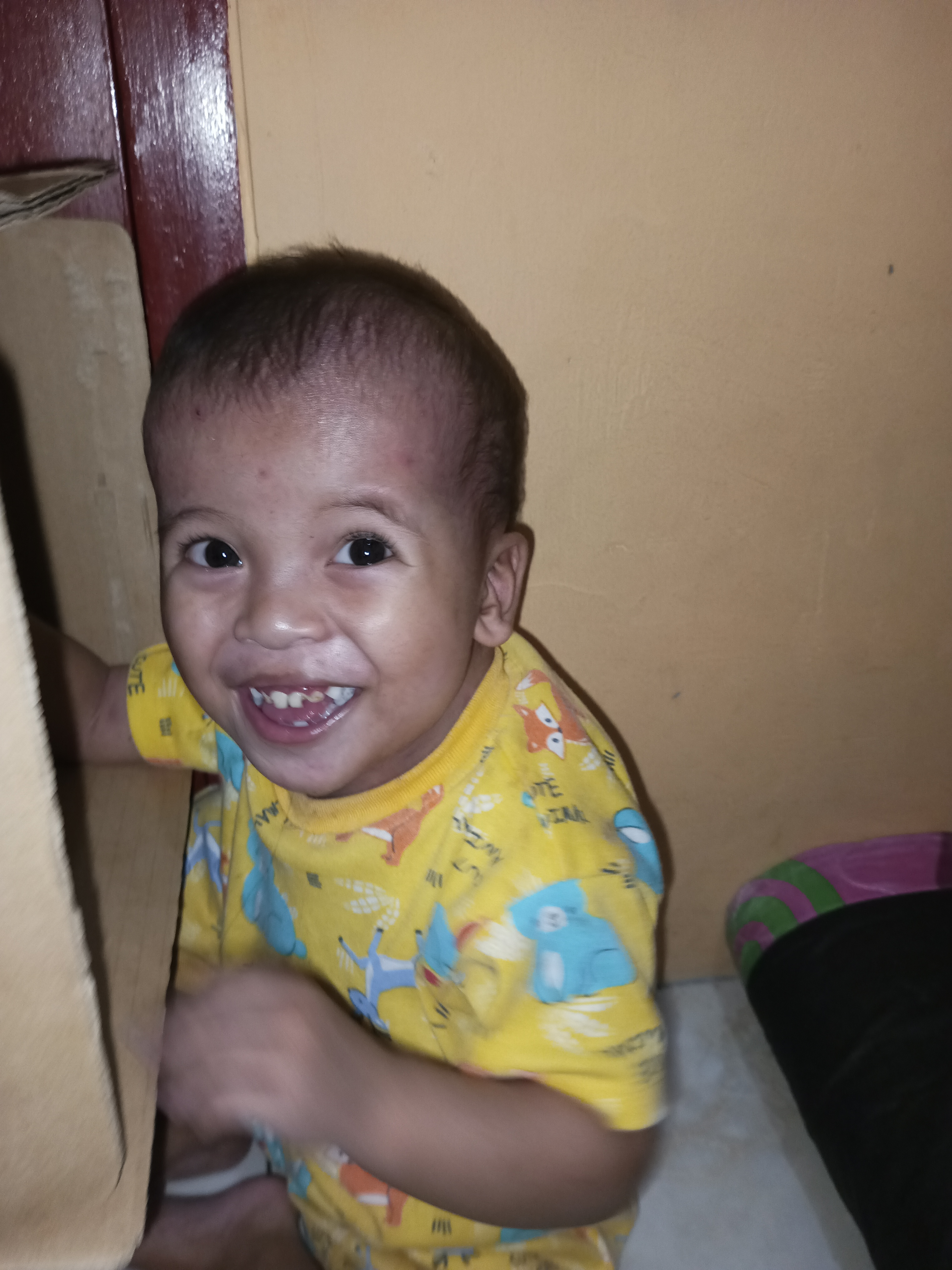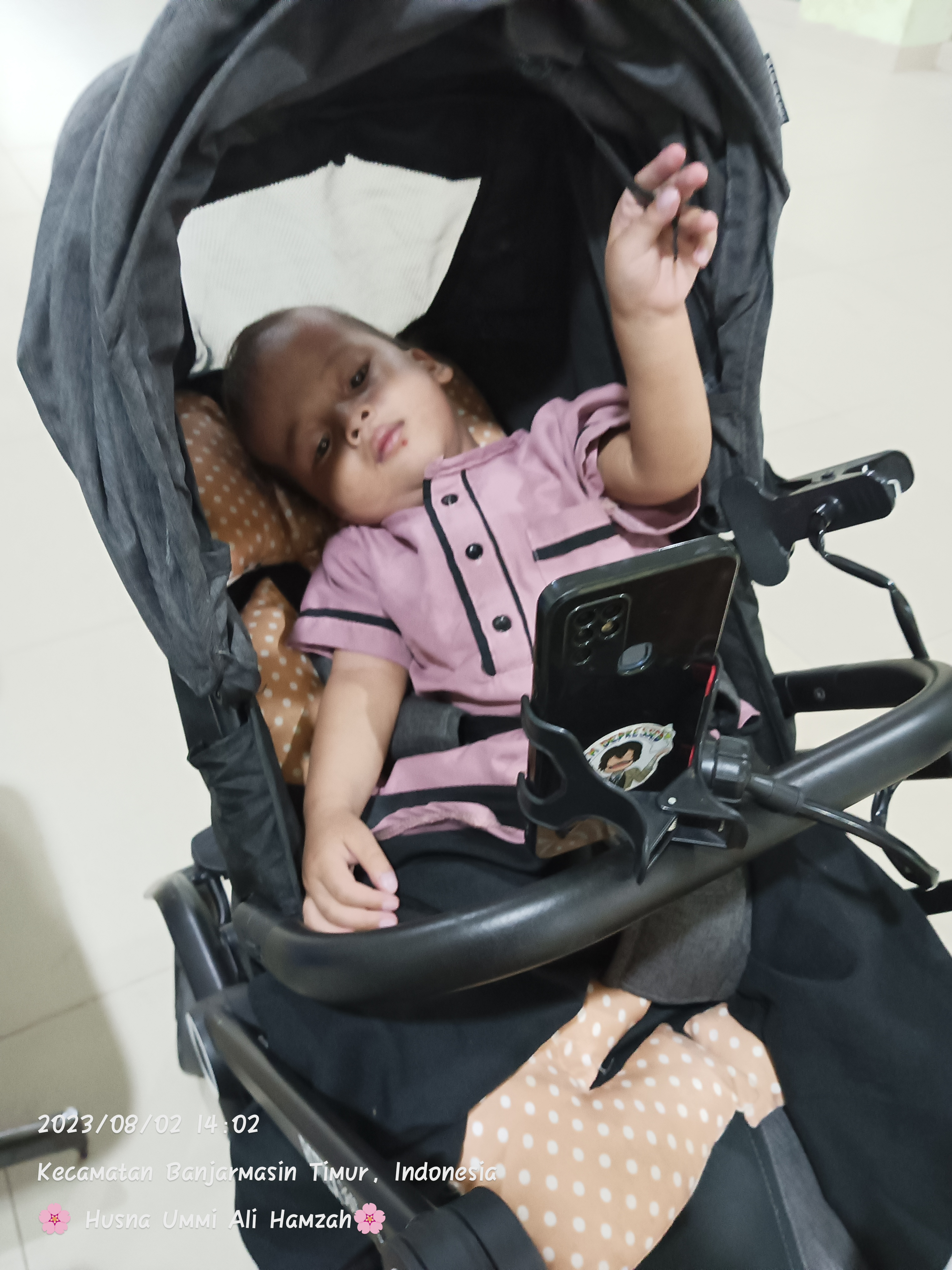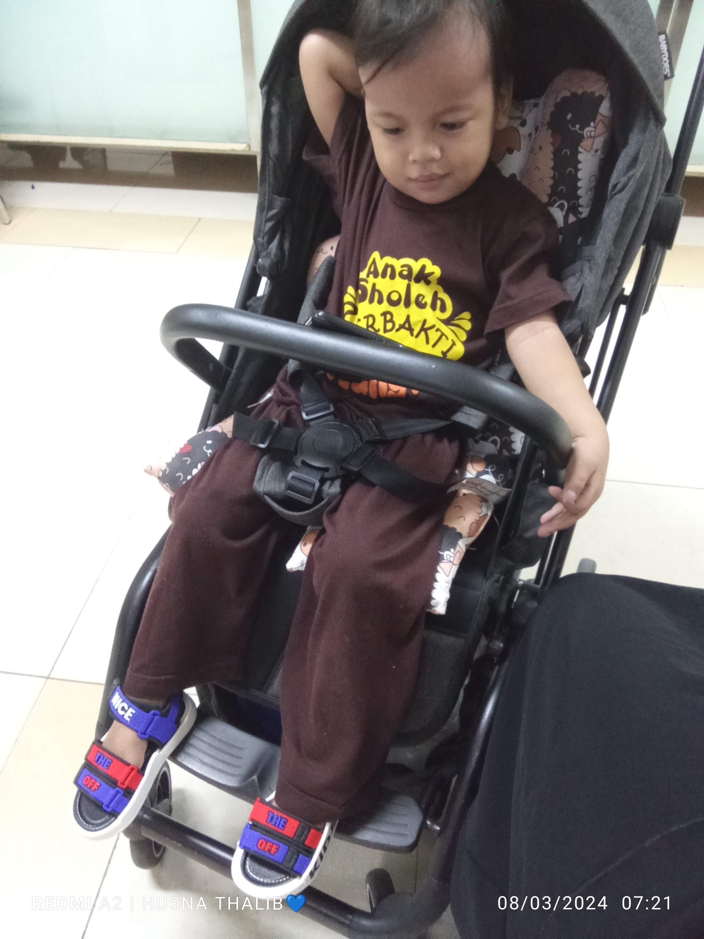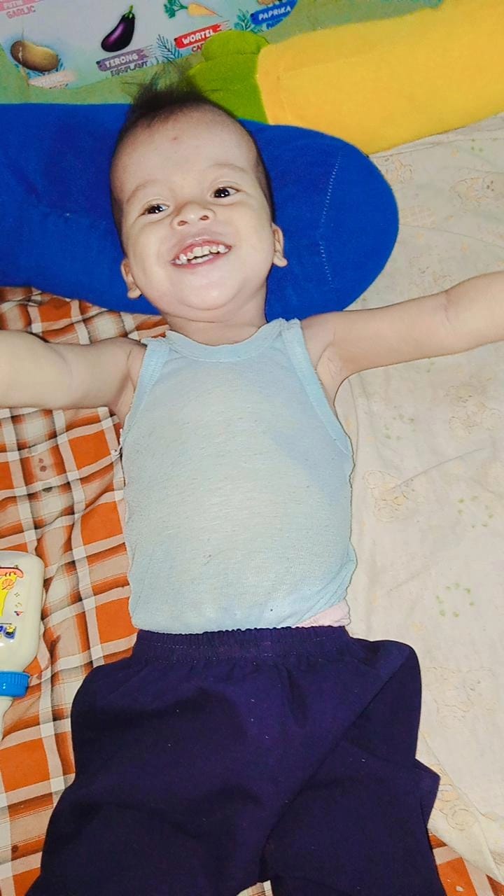 Alhamdulillah kondisinya saat ini sehat dan masih terus berjuang mengejar keterlambatan tumbuh kembangnya seperti berdiri, berjalan, duduk, bicara serta berat badannya.