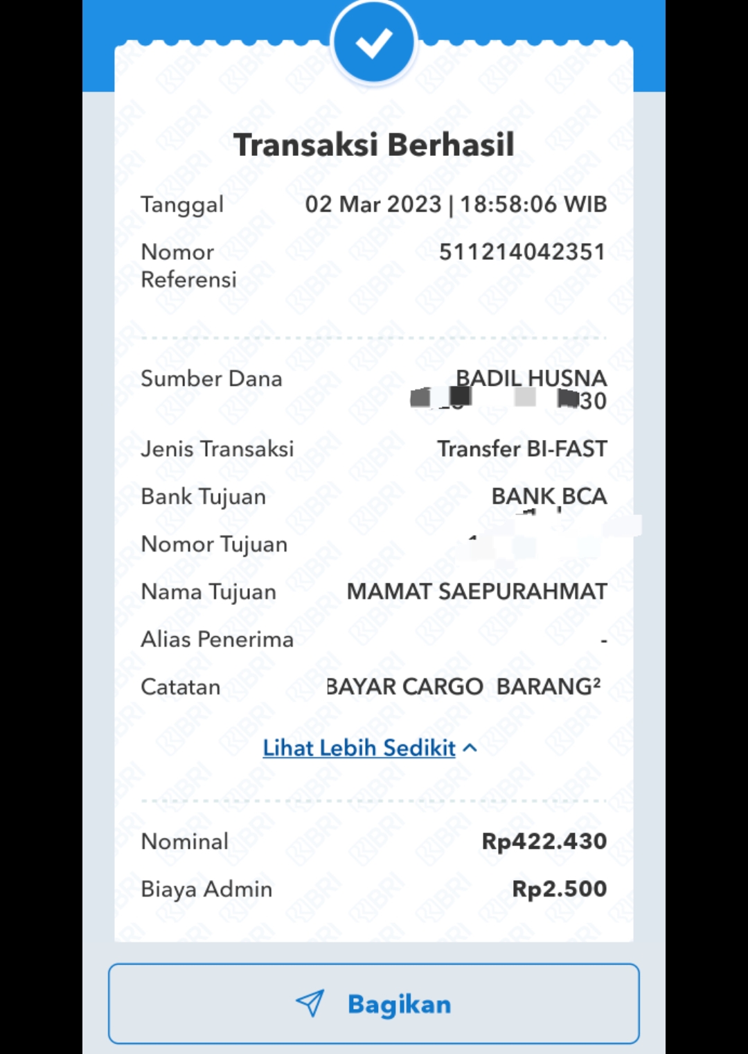 Ke rekening ****011962530 a/n BADIL HUSNA
