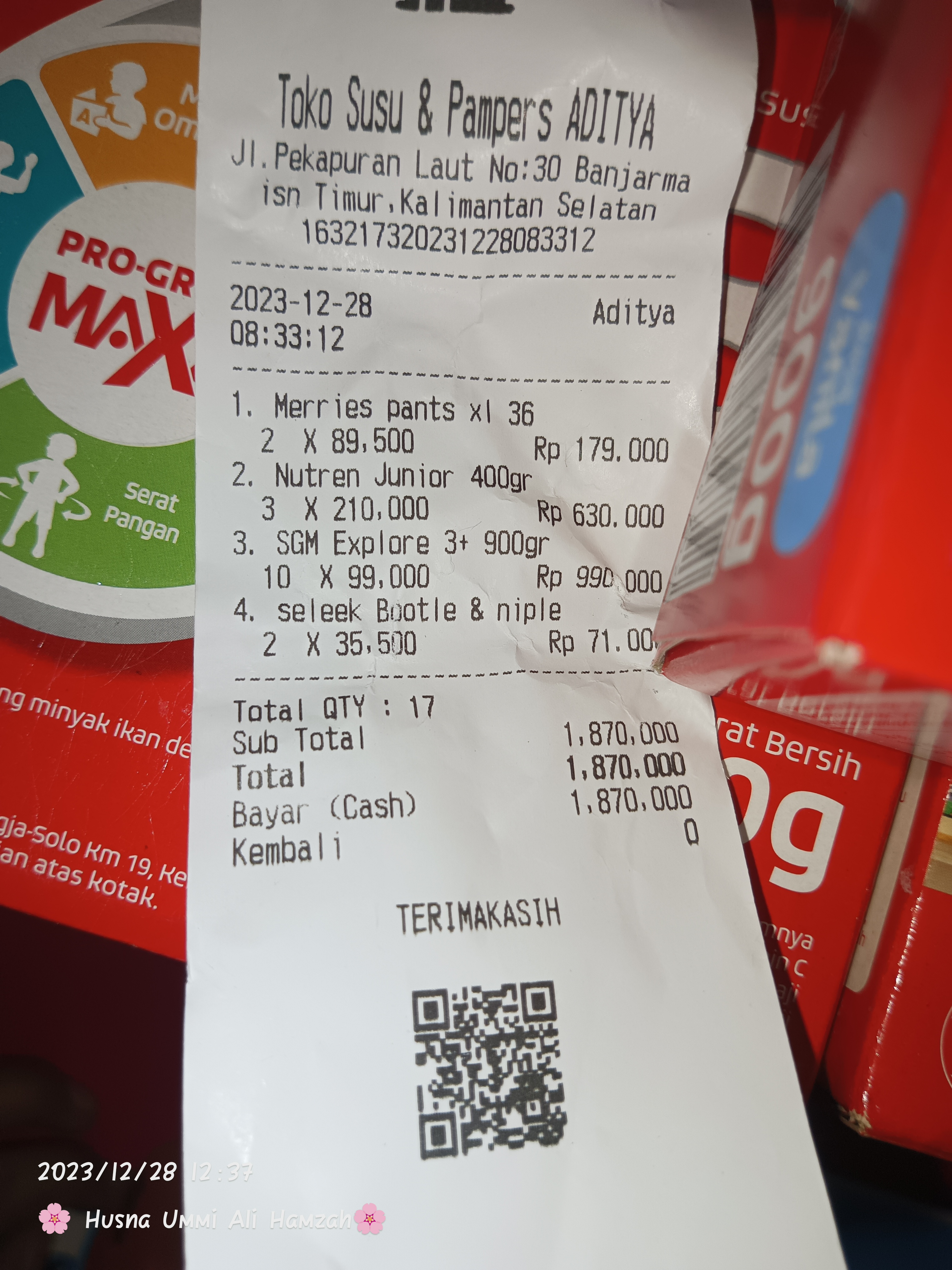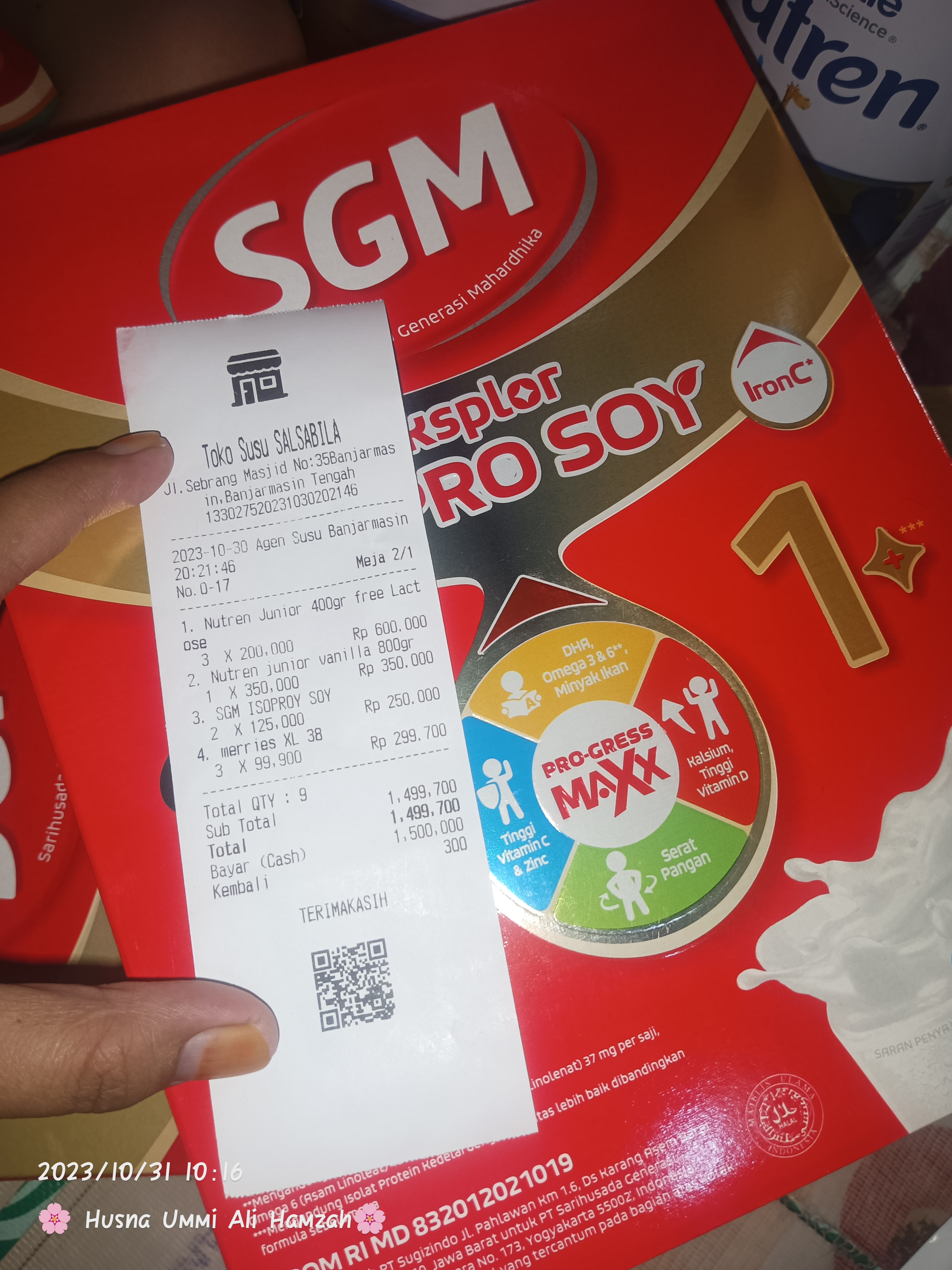 Dana digunakan untuk 1. Susu SGM Explore 3+ 900 gr 98.000 x 10 kotak= Rp980.000 2. Susu Nutren Junior 400 gr 200.000 x 3 kaleng= Rp600.000 3. Pampers Merries ukuran XL 80.000 x 2 ball= Rp160.000 4. Sabun Sleek untuk dot 35.000 x 2 bungkus= Rp70.000.2023-12-27 18:56:49