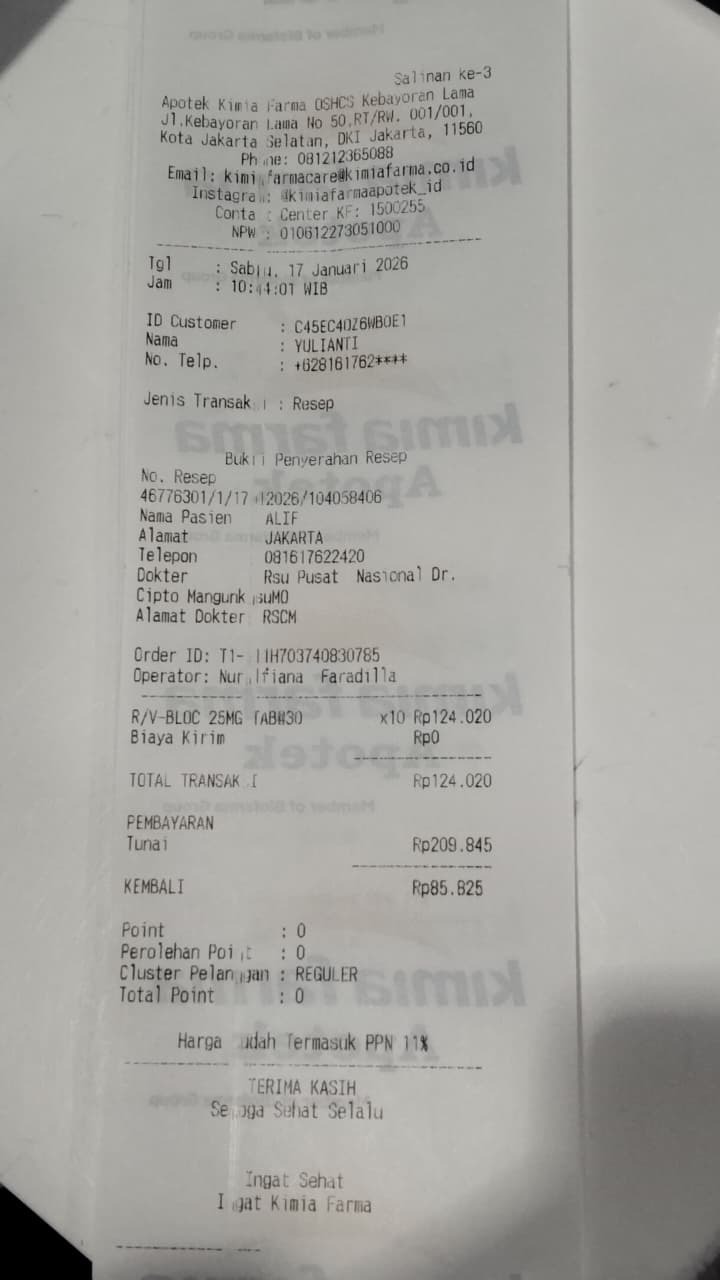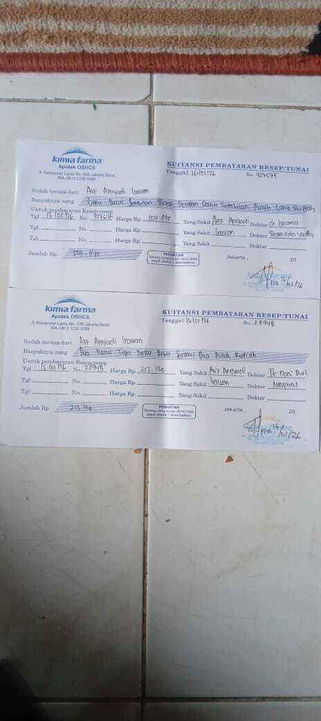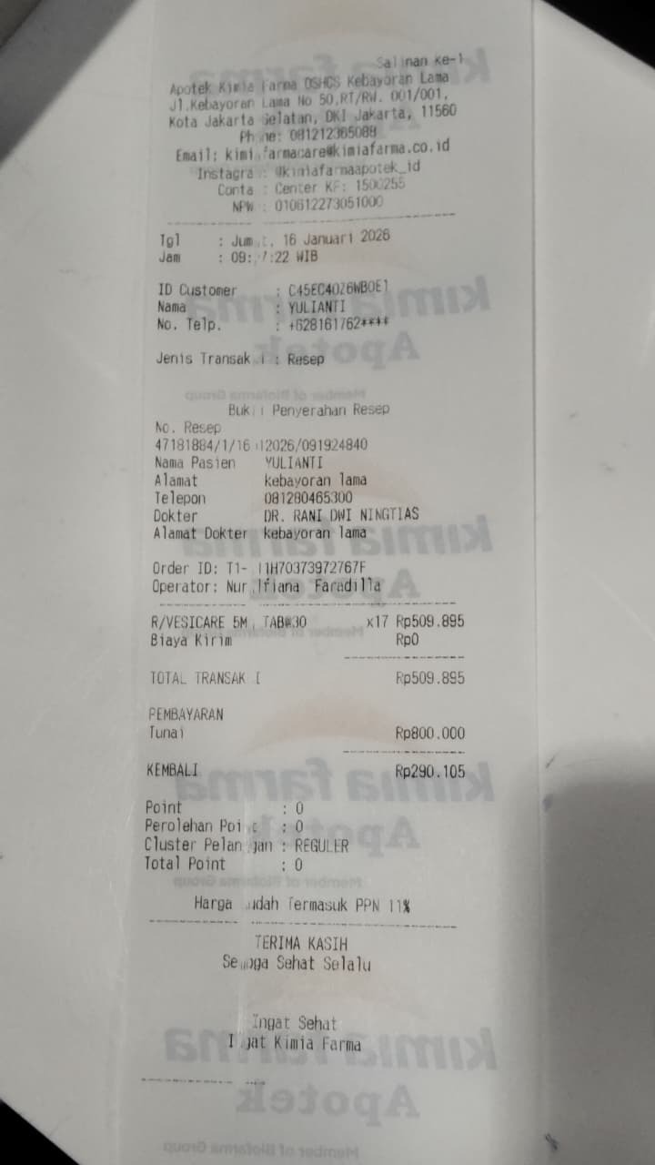 Dana digunakan untuk 1. Obat vesicare 30 tablet Rp900.000 2. Carvedilol 30 tablet Rp360.000 3 Killbac 1 botol Rp90.000 4. Ketosteril 20 tablet Rp200 0002026-01-13 14:29:29