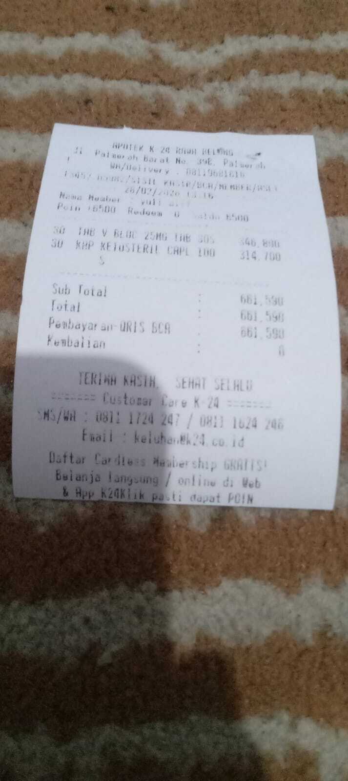 Dana digunakan untuk 1. Vesicare Rp367.000 2. Koto steril Rp110.500x2 strip= Rp221.000 3. Killbac Rp19.000 4. Ibmed gel.Rp50.000 x 2= Rp100.000 5. Cic cateter steril Rp.30.000x5= Rp150.000 6. Konsumsi rawat inap Rp710.0002025-11-21 10:01:33