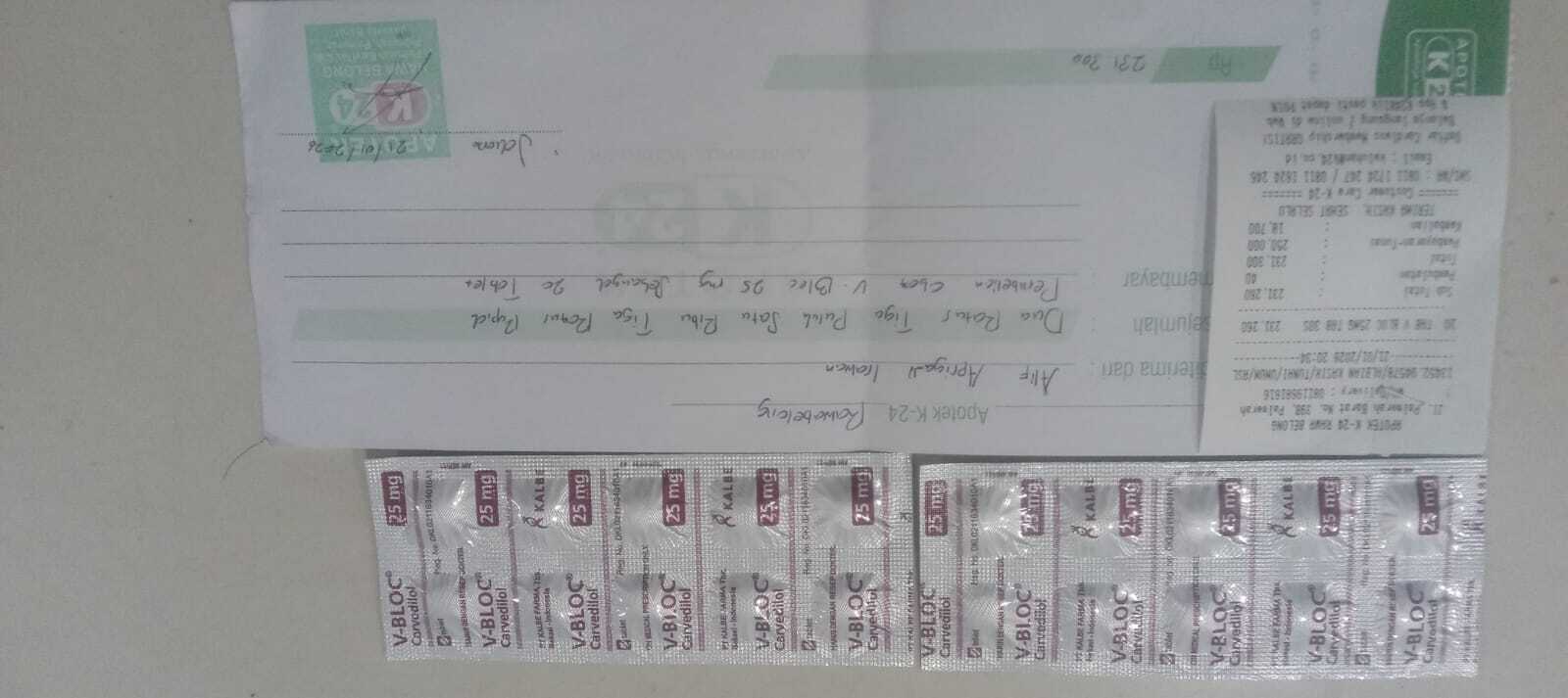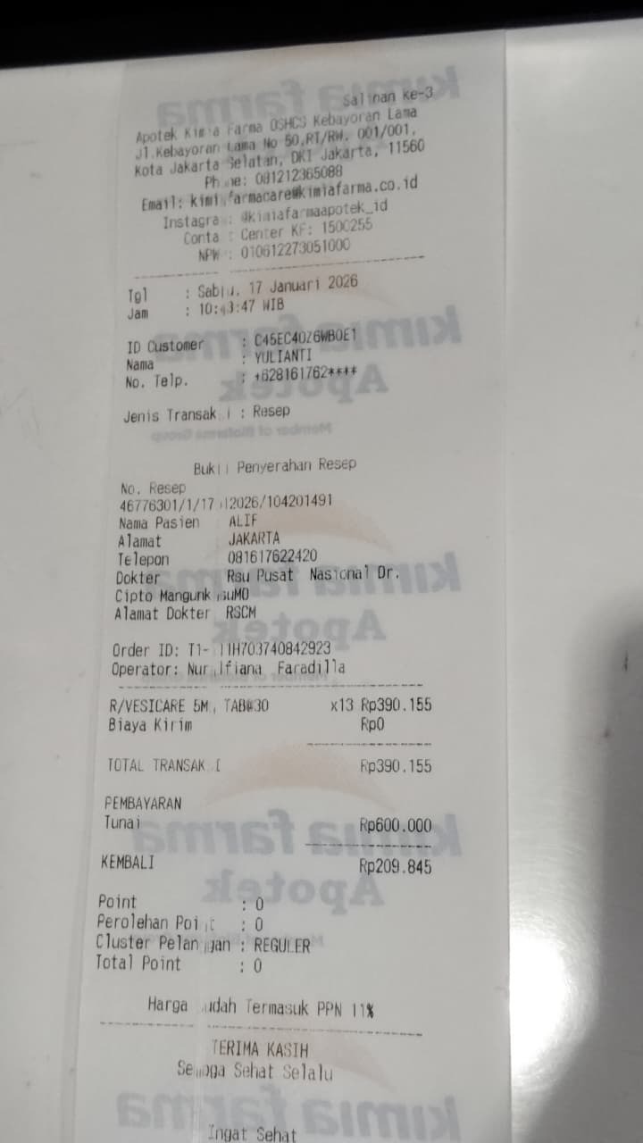 Dana bantuan dari #TemanBaik digunakan untuk membeli obat Vesicare, Carvedilol, Killbac, dan Ketosteril.
