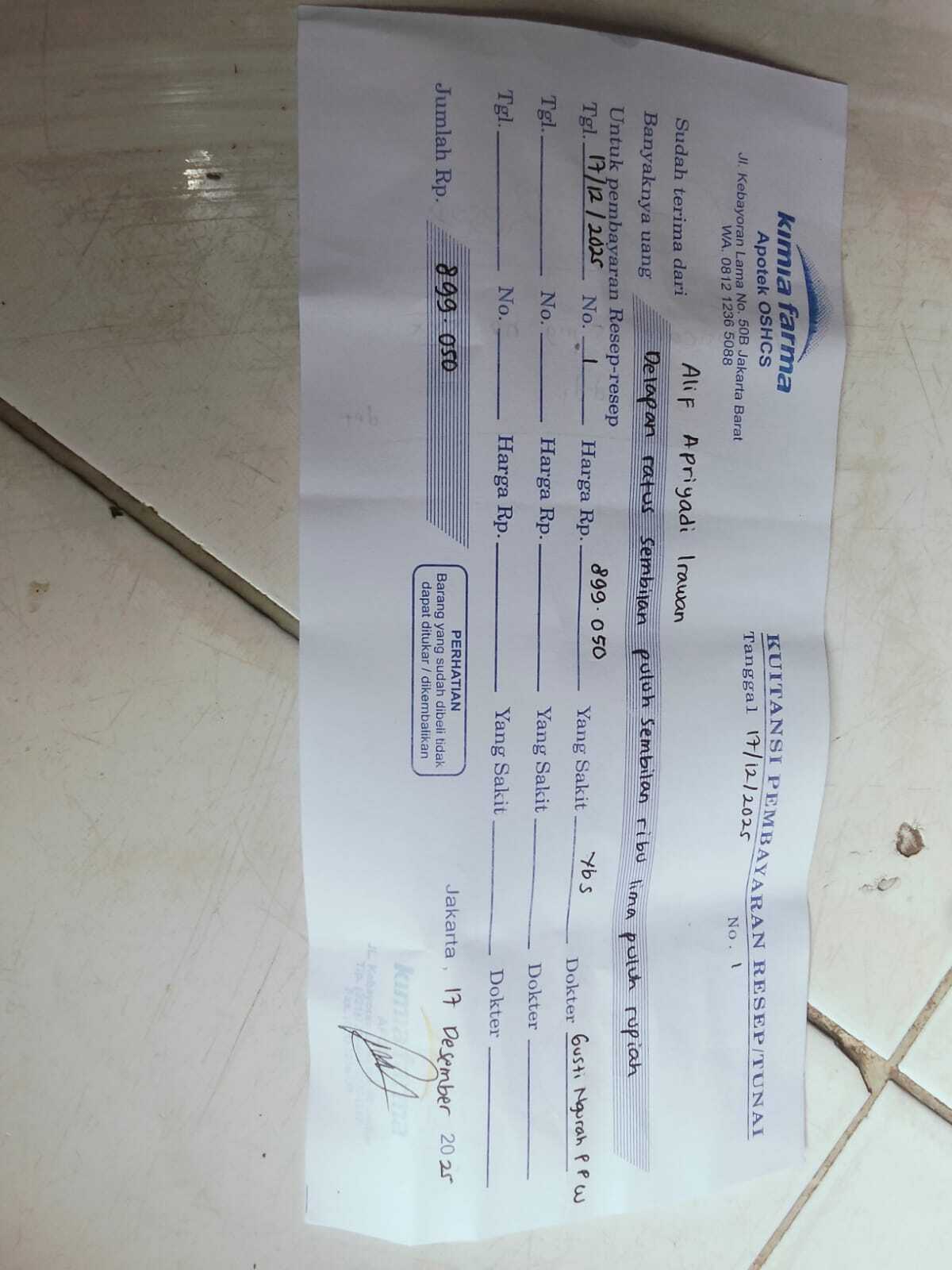 Dana digunakan untuk 1. Reimburse obat vesicare Rp30400 x 3 setrip= Rp899.050 2. Reimburse Kill bac 350 ml Rp96.000 3. Reimburse Plester anti air 10x10 Rp63.3002025-12-23 11:19:08