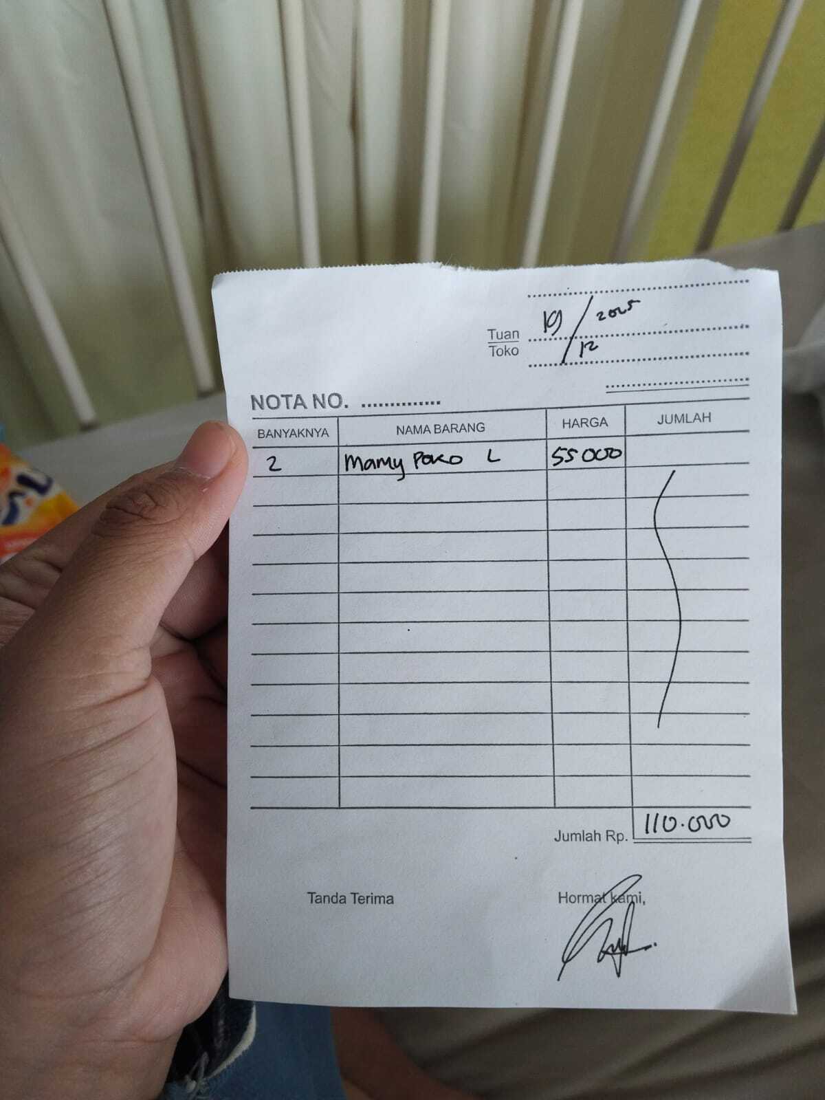 Dana yang telah diberikan digunakan untuk membeli popok MamyPoko ukuran L sebanyak 2 bal dengan rincian: