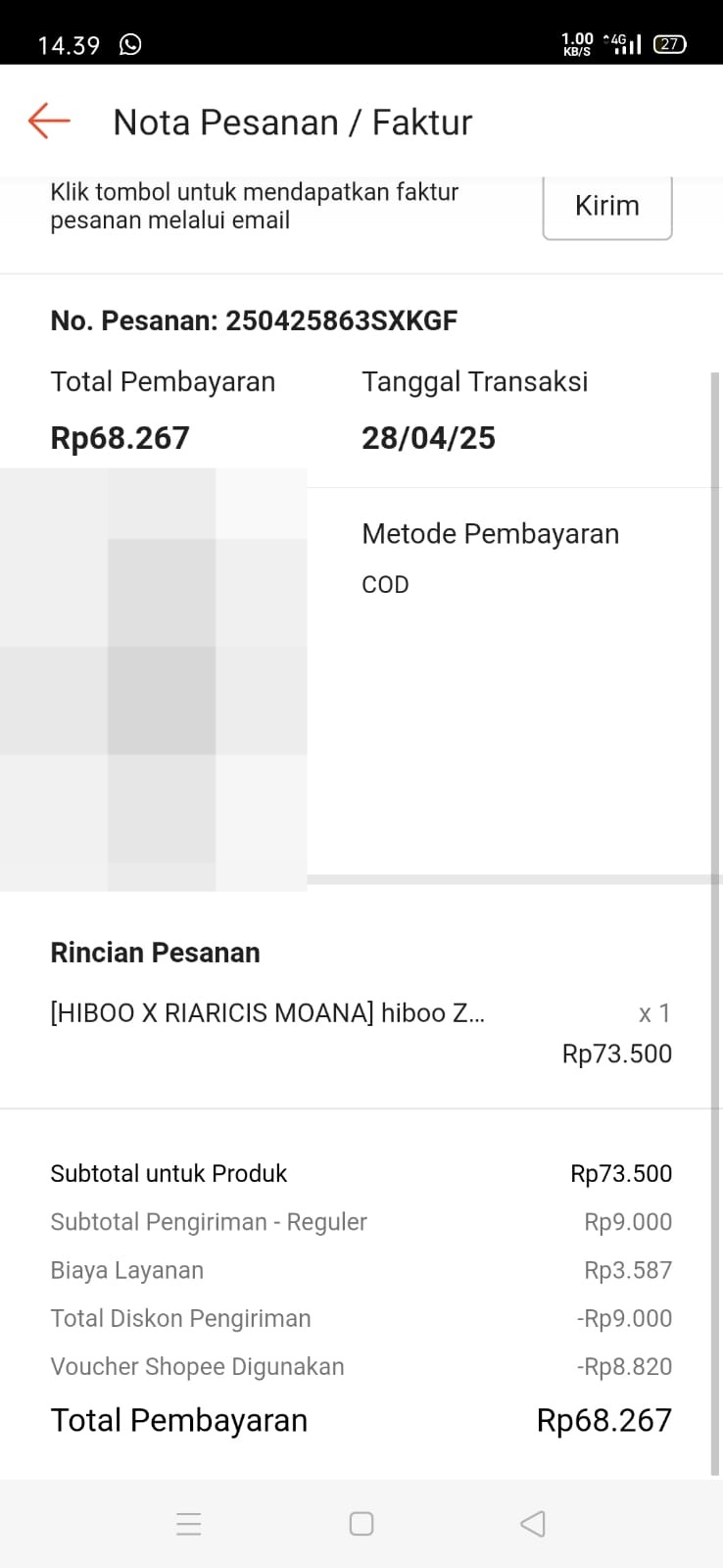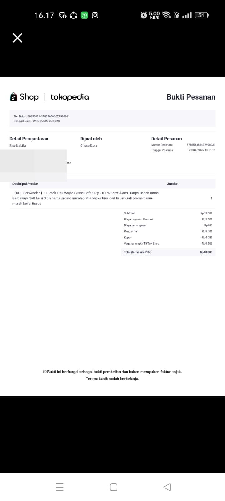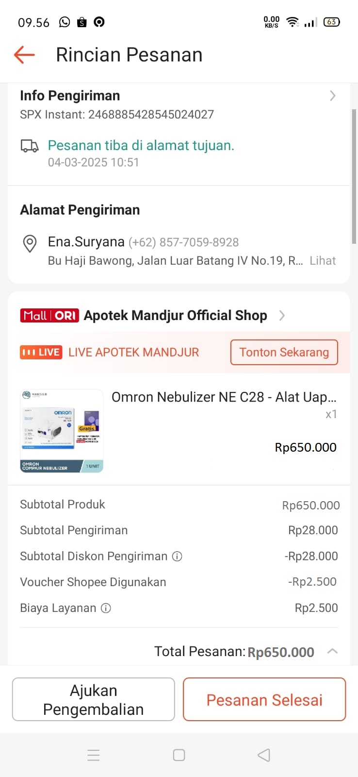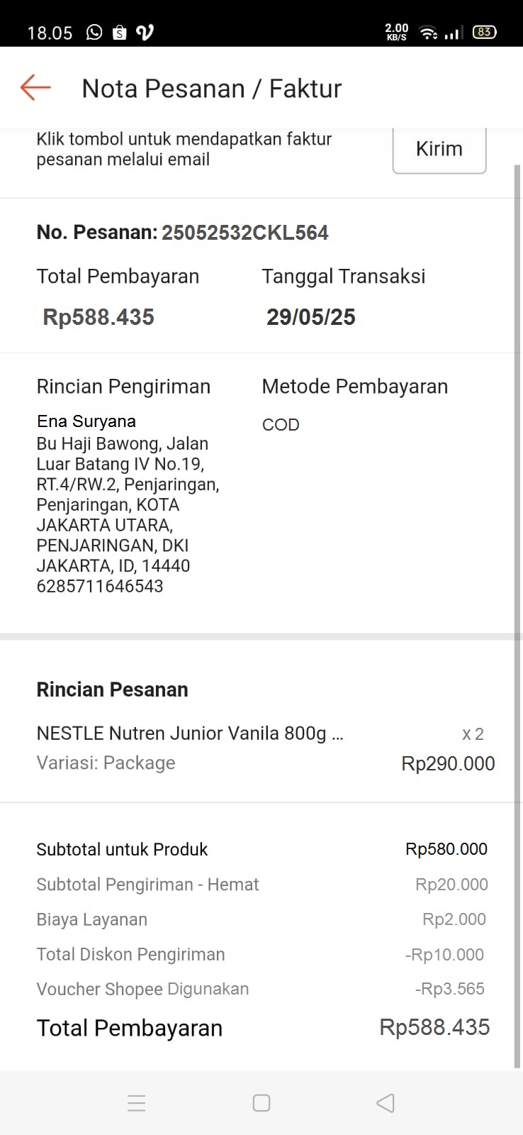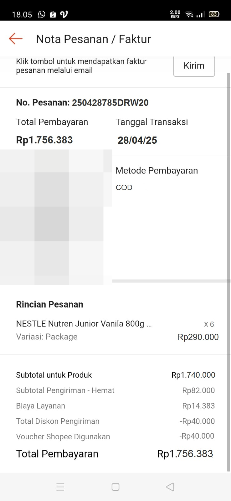 1. Nutren Junior 800 gram Rp.290.000 x 4 kaleng = Rp1.160.000 2. Popok Merk Merries 6 Ball Rp.87.000 x 6 ball = Rp.522.000.2025-01-15 09:33:36