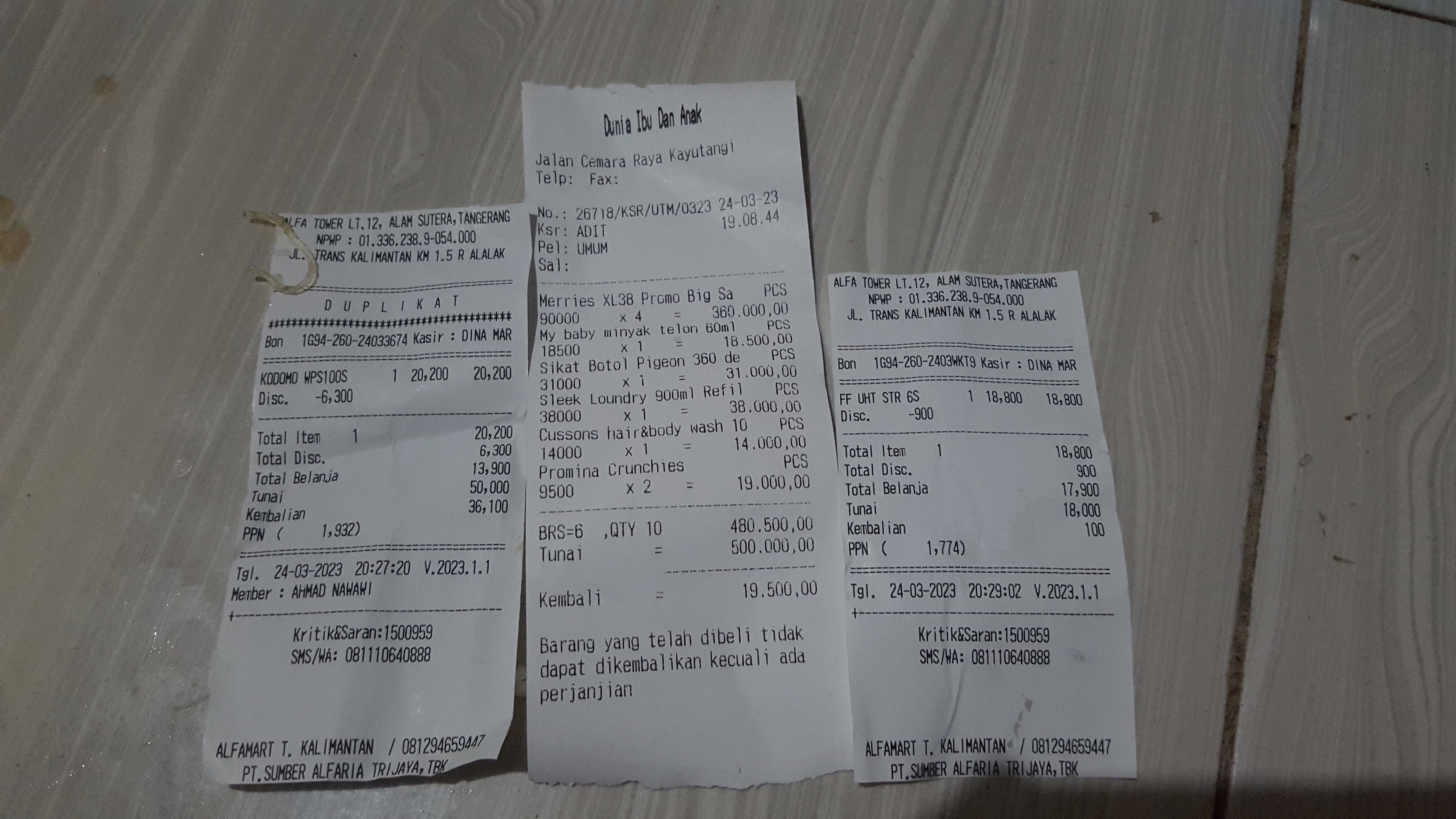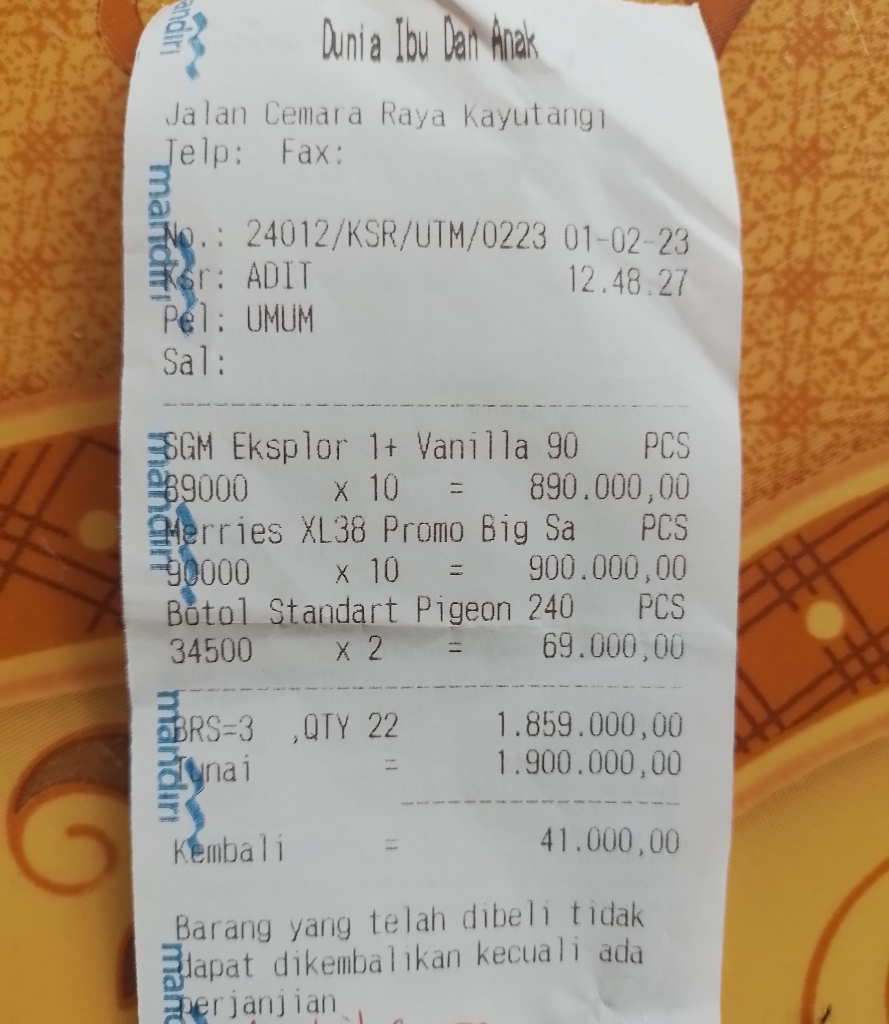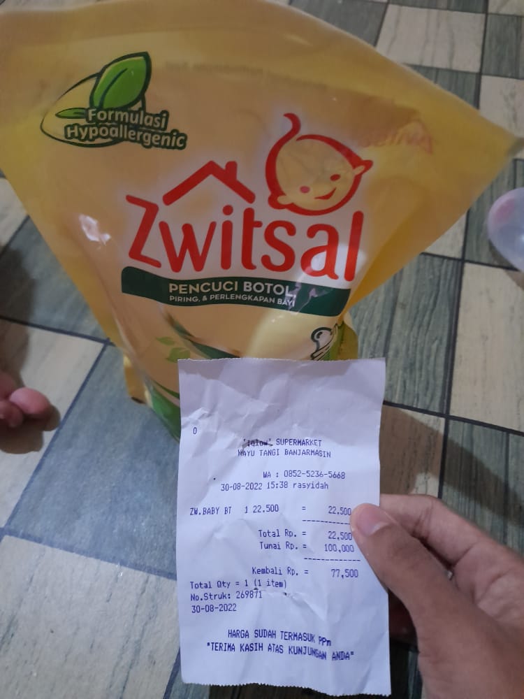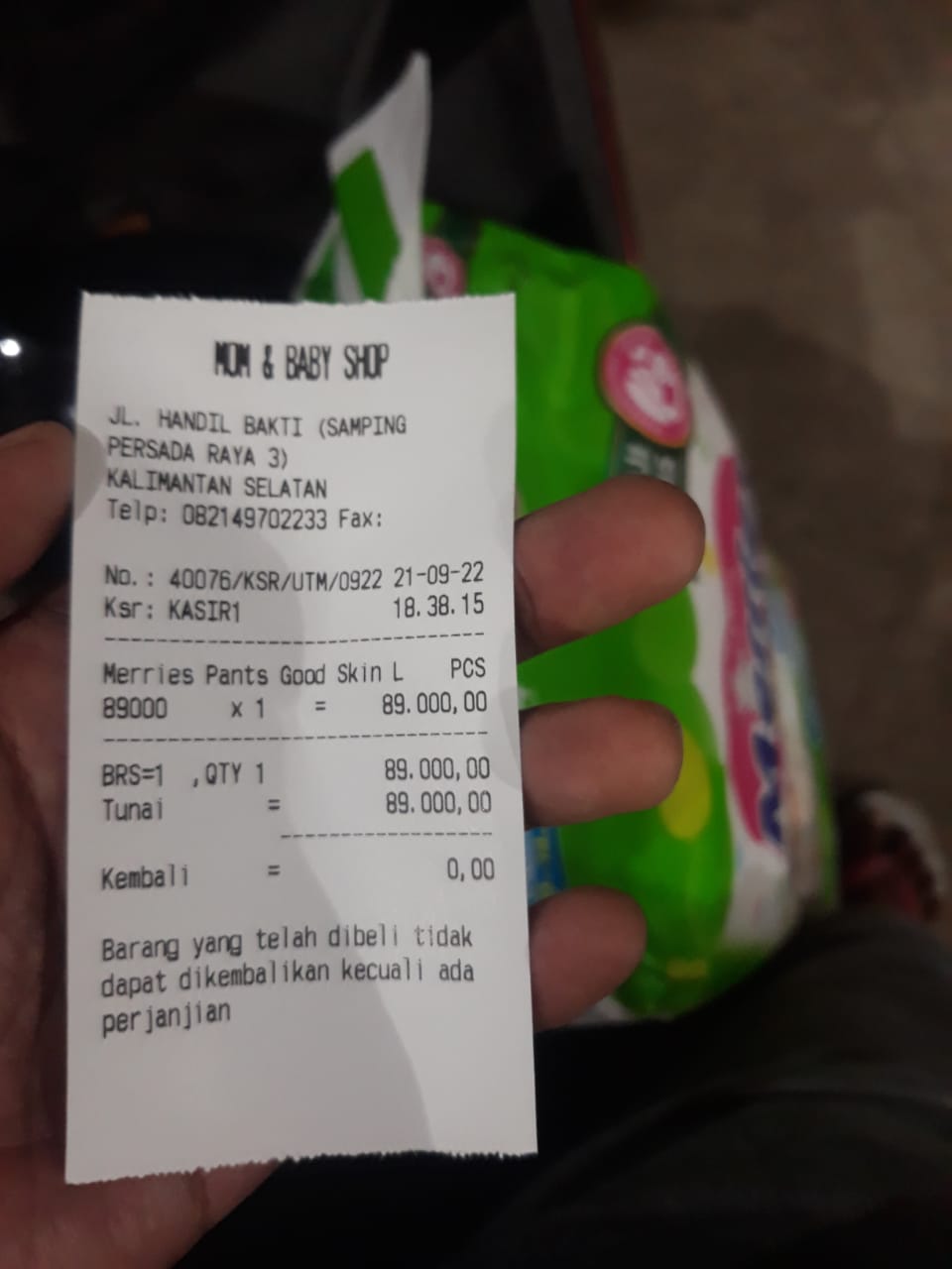 Dana digunakan untuk 1. Popok merries XL 95.000 x 4 ball= Rp380.000 2. Sikat dot Rp33.000 3. My baby minyak telon 60 ml Rp21.000 4. Sabun mandi Cussons 100 ml Rp17.000 5. Snack Promina 10.000 x 2= Rp20.000 6. Sabun dot sleek 900 ml Rp50.000.