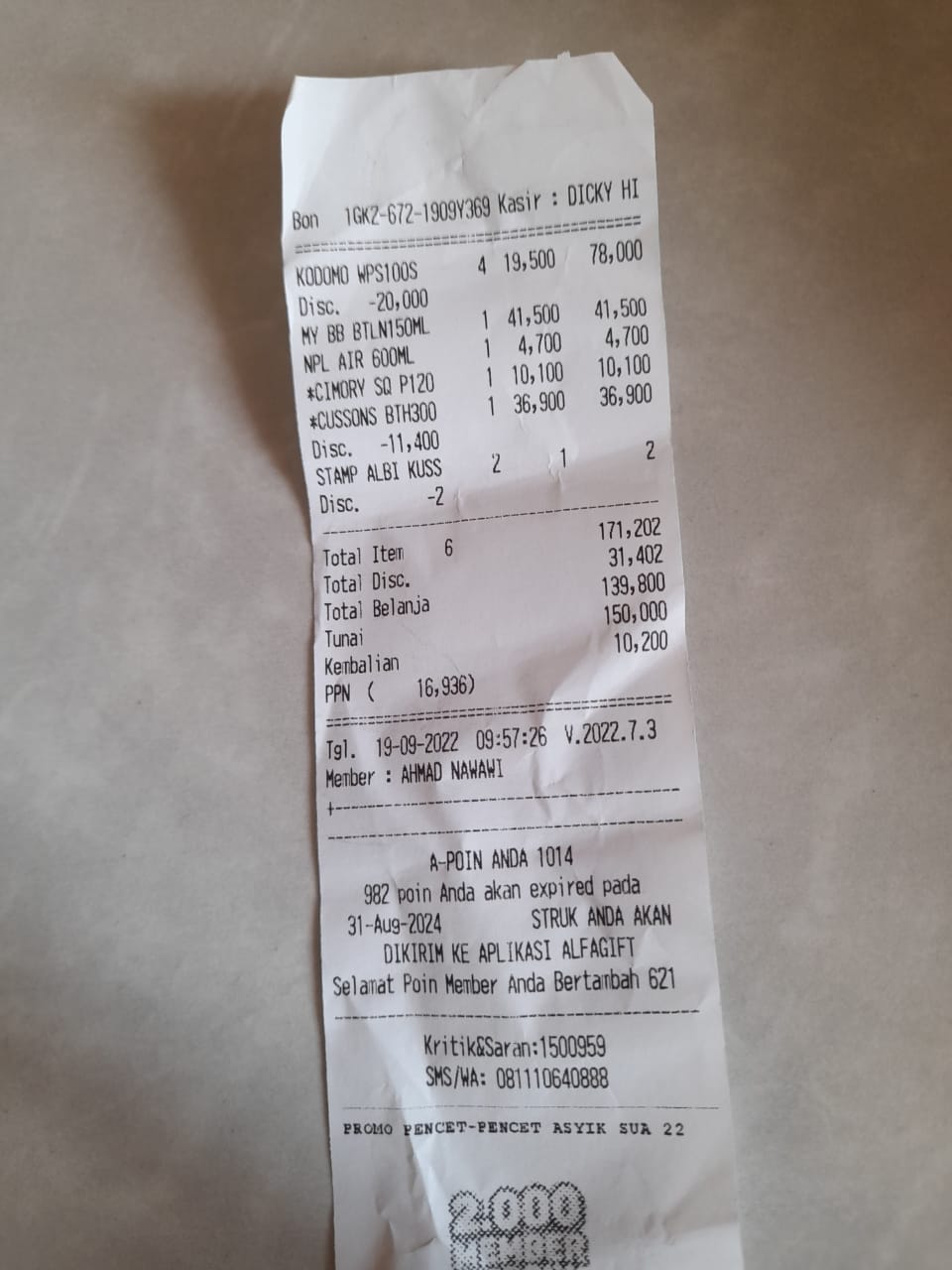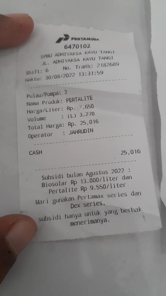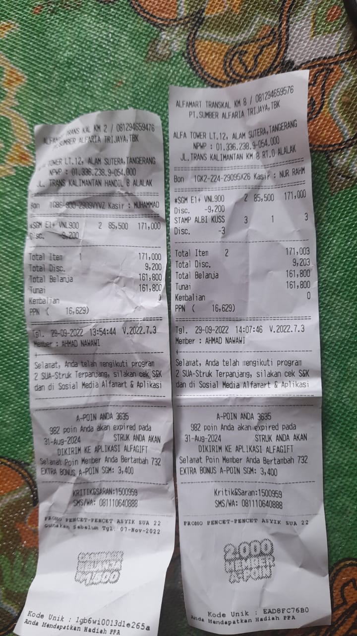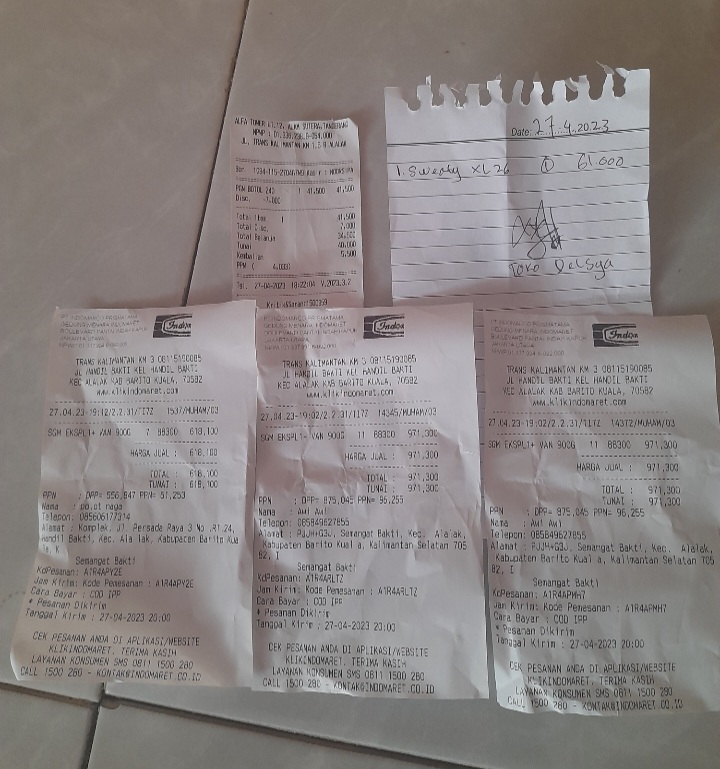 Dana digunakan untuk 1. Popok merries XL 95.000 x 4 ball= Rp380.000 2. Sikat dot Rp33.000 3. My baby minyak telon 60 ml Rp21.000 4. Sabun mandi Cussons 100 ml Rp17.000 5. Snack Promina 10.000 x 2= Rp20.000 6. Sabun dot sleek 900 ml Rp50.000.