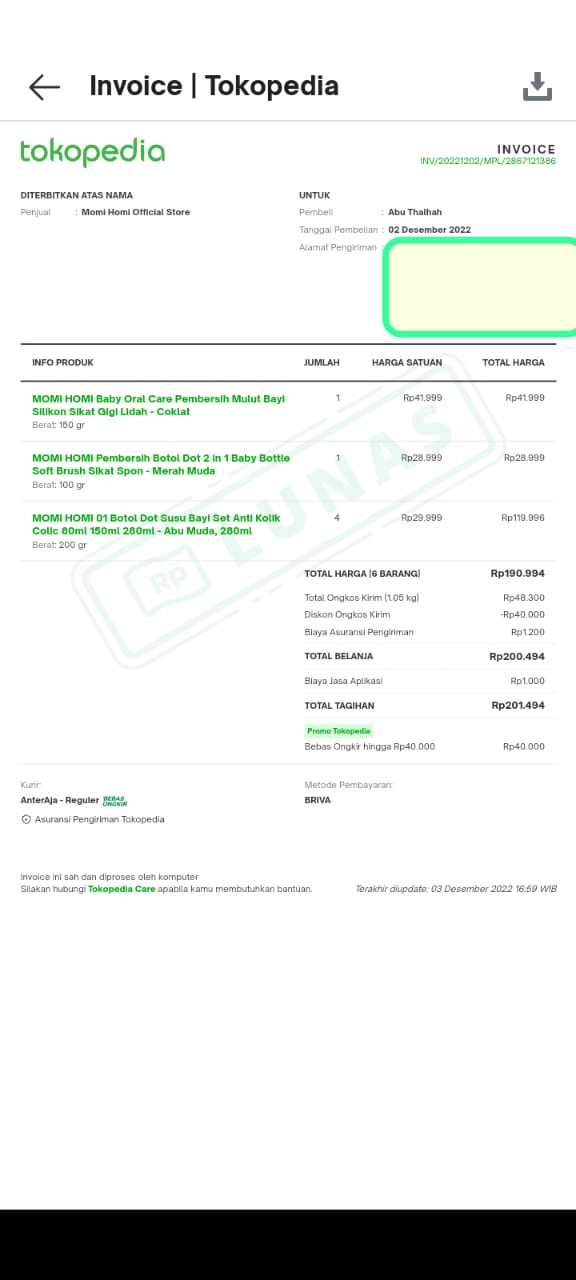 Dana digunakan untuk: 1. Untuk beli Dot Bayi merk Momi Homi 240Ml @28.000x4= 112.000 ditambah ongkir 16.000 dan biaya COD 11.500= Rp139.500 2. Beli madu kelulut 600gr Rp170.000.