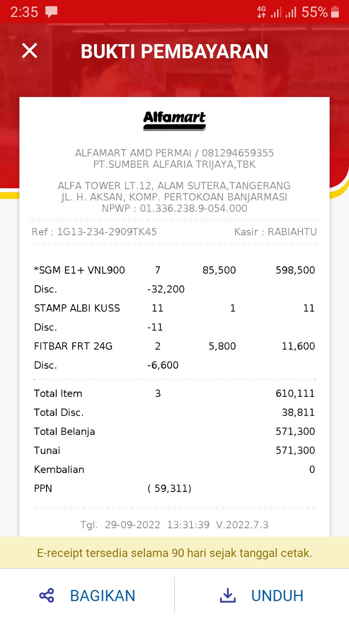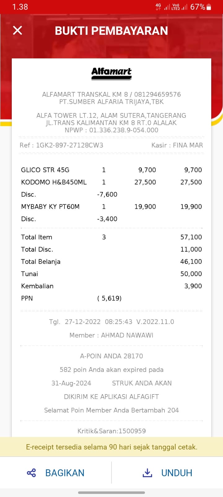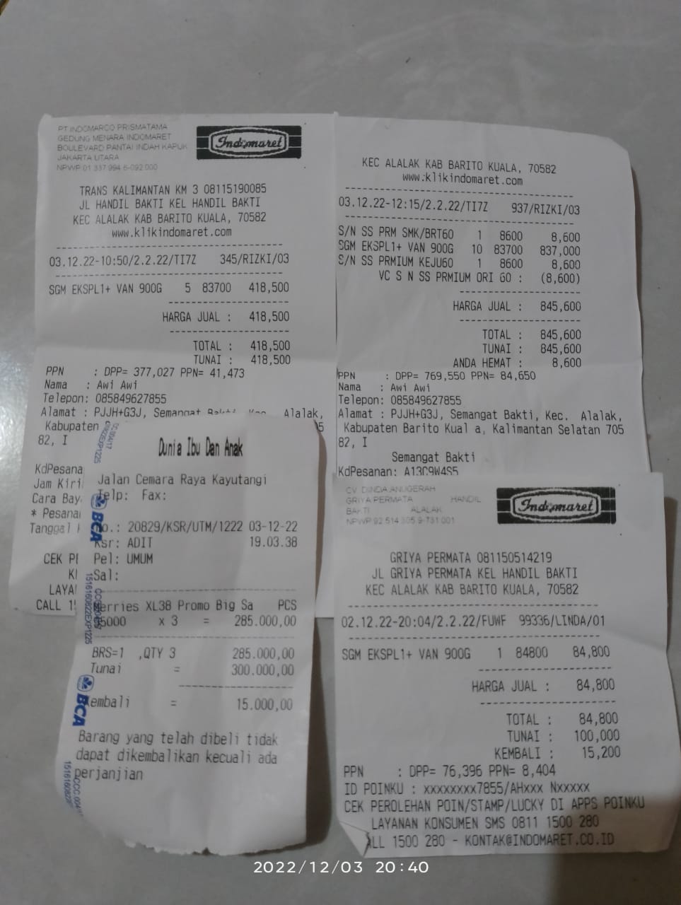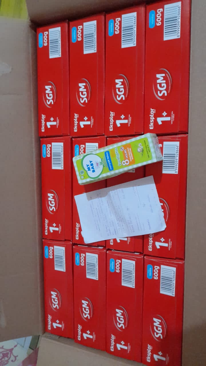 Dana digunakan untuk pembelian Susu SGM 1 + Vanila 900 gr 900.000 x 3 dus= Rp2.700.000.