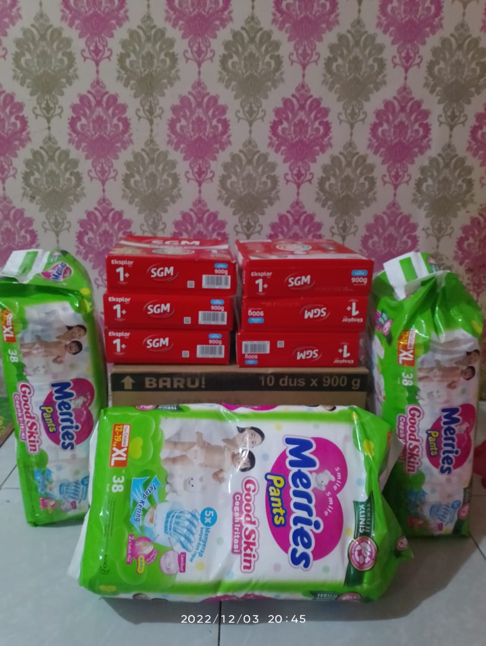Dana digunakan untuk 1. Susu SGM 1+ Vanila 900 gr 90.000 x 30 box= Rp2.700.000 2. Dot bayi huki 250 Ml 33.000 x 3= Rp99.000.