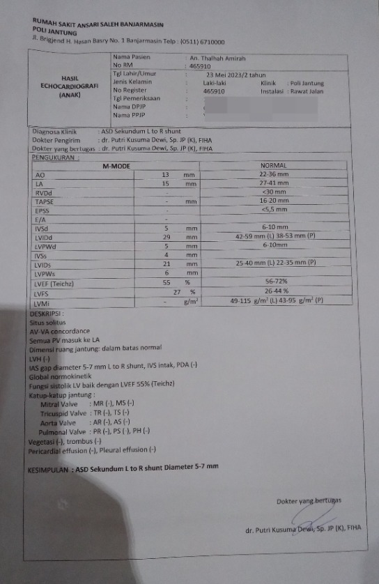 18 Juli 2023, anakku melakukan echo jantung kembali di RS Ansari Saleh Banjarmasin untuk mengetahui apakah lubang jantungnya sudah tertutup sendiri atau belum.