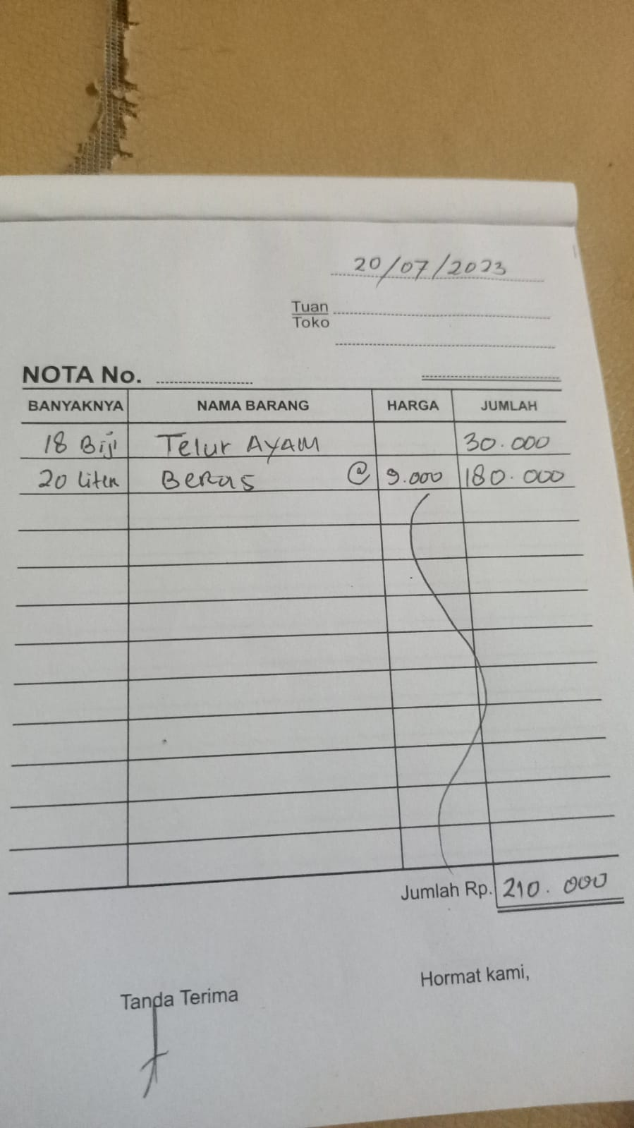Dana digunakan untuk 1. Popok 2 bungkus isi 30 Rp120.000 2. Beras 9.000 x 20 liter= Rp180.000 3. Telur 18 biji Rp30.000.2023-07-20 16:10:56