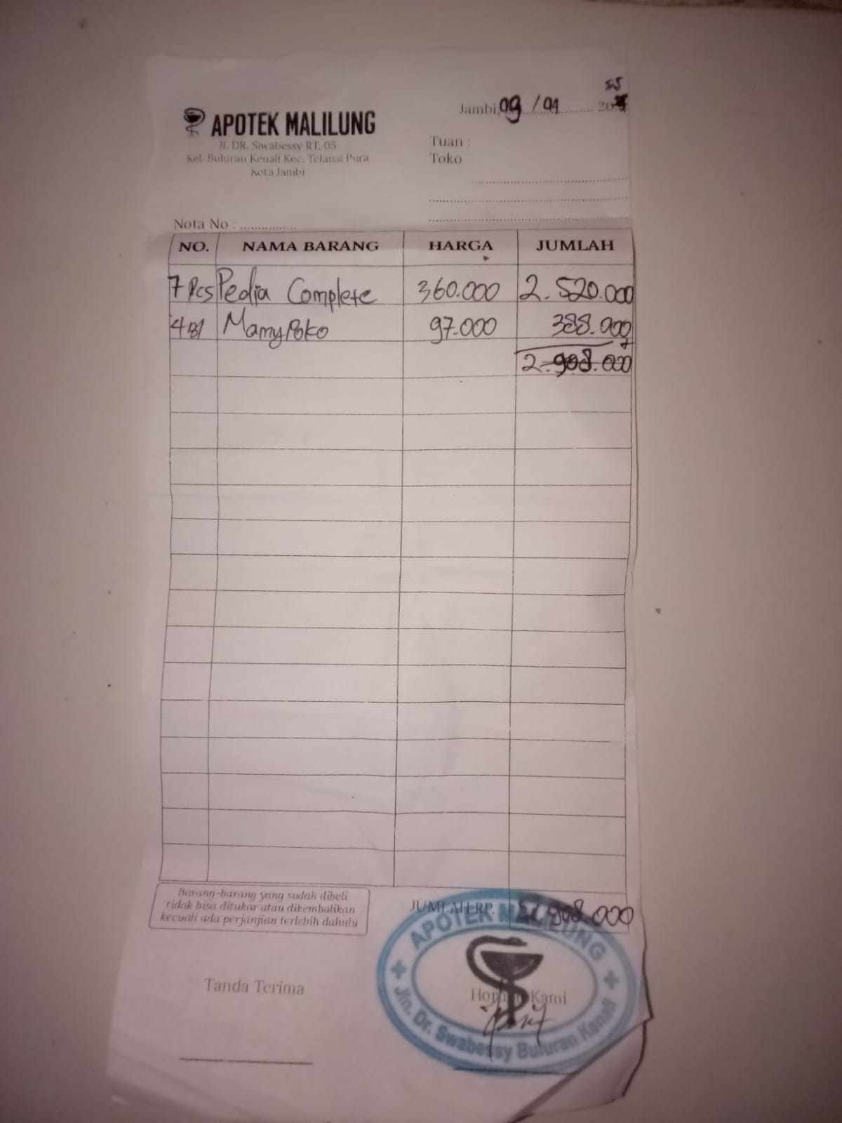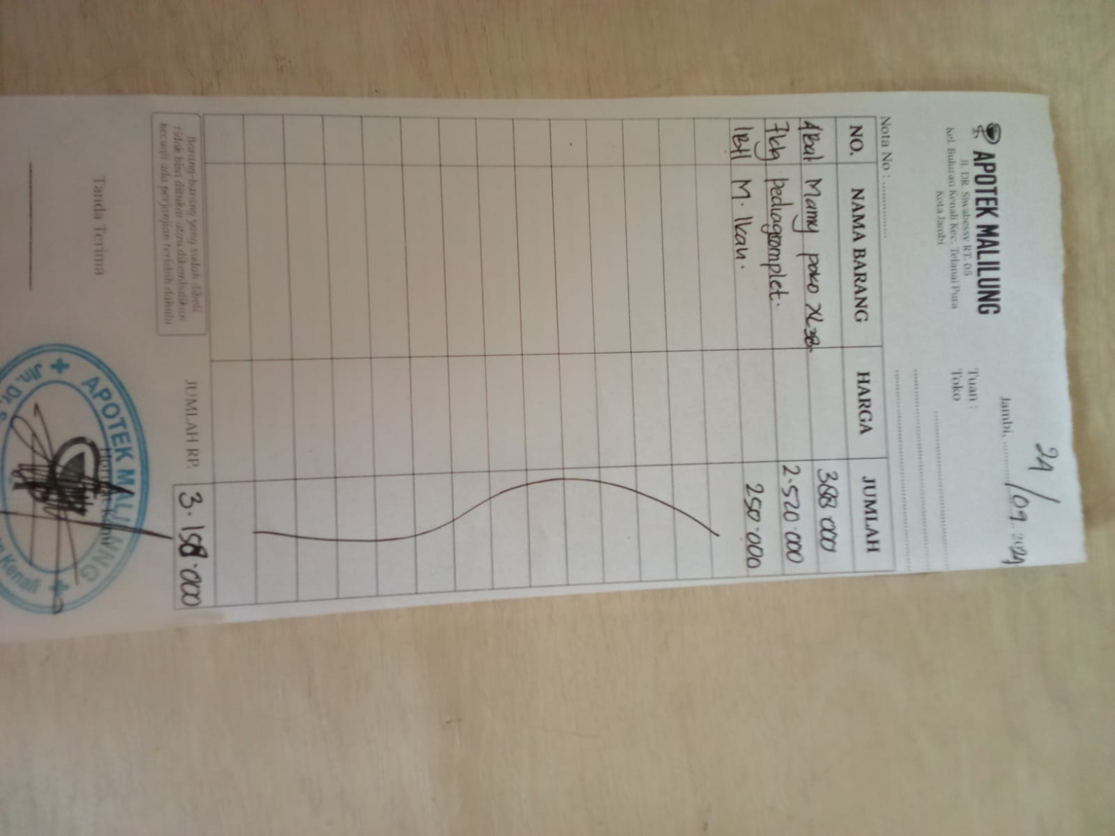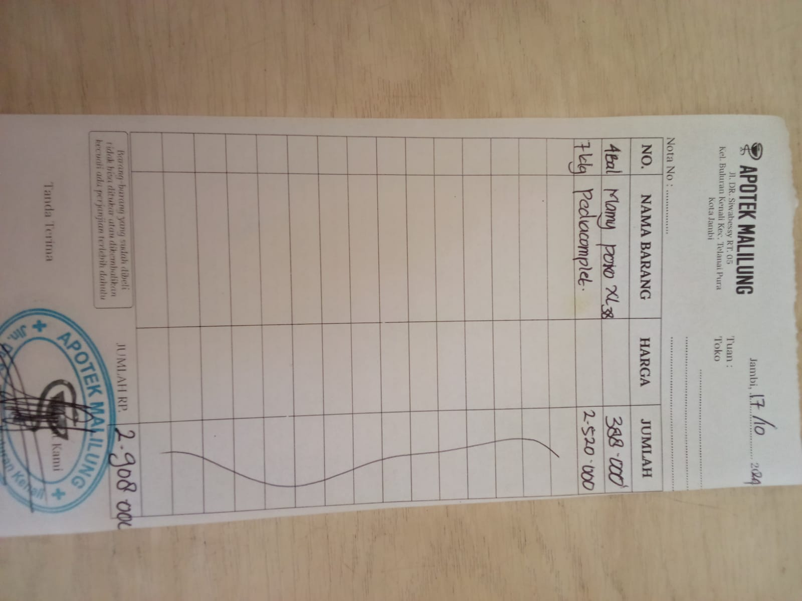 1.susu pediacomplit 360000 × 7 kaleng Rp 2520000 Pempers 4 bal ukuran XL 97000 × 4 Rp 388000 Vitamin omega tiga ( 1 ) 250000 × 1 Rp 250000 Total Rp 3.1580002024-09-24 11:25:01