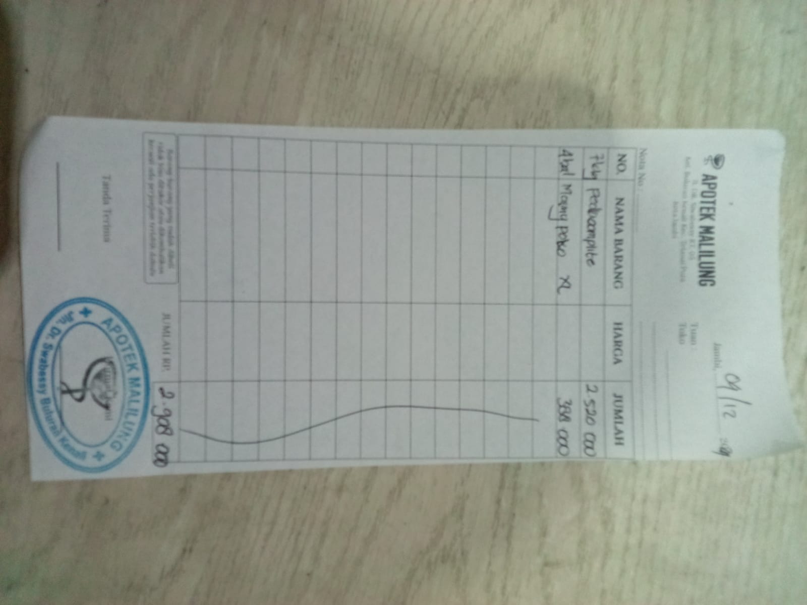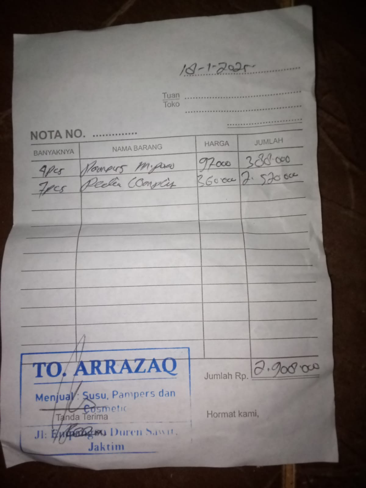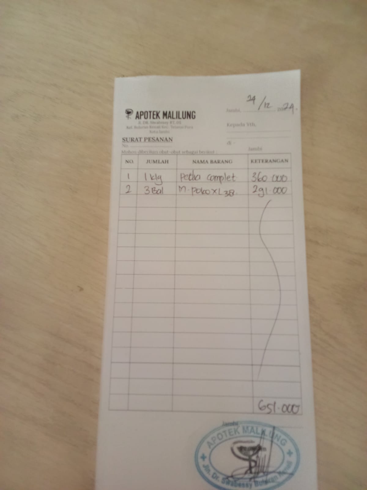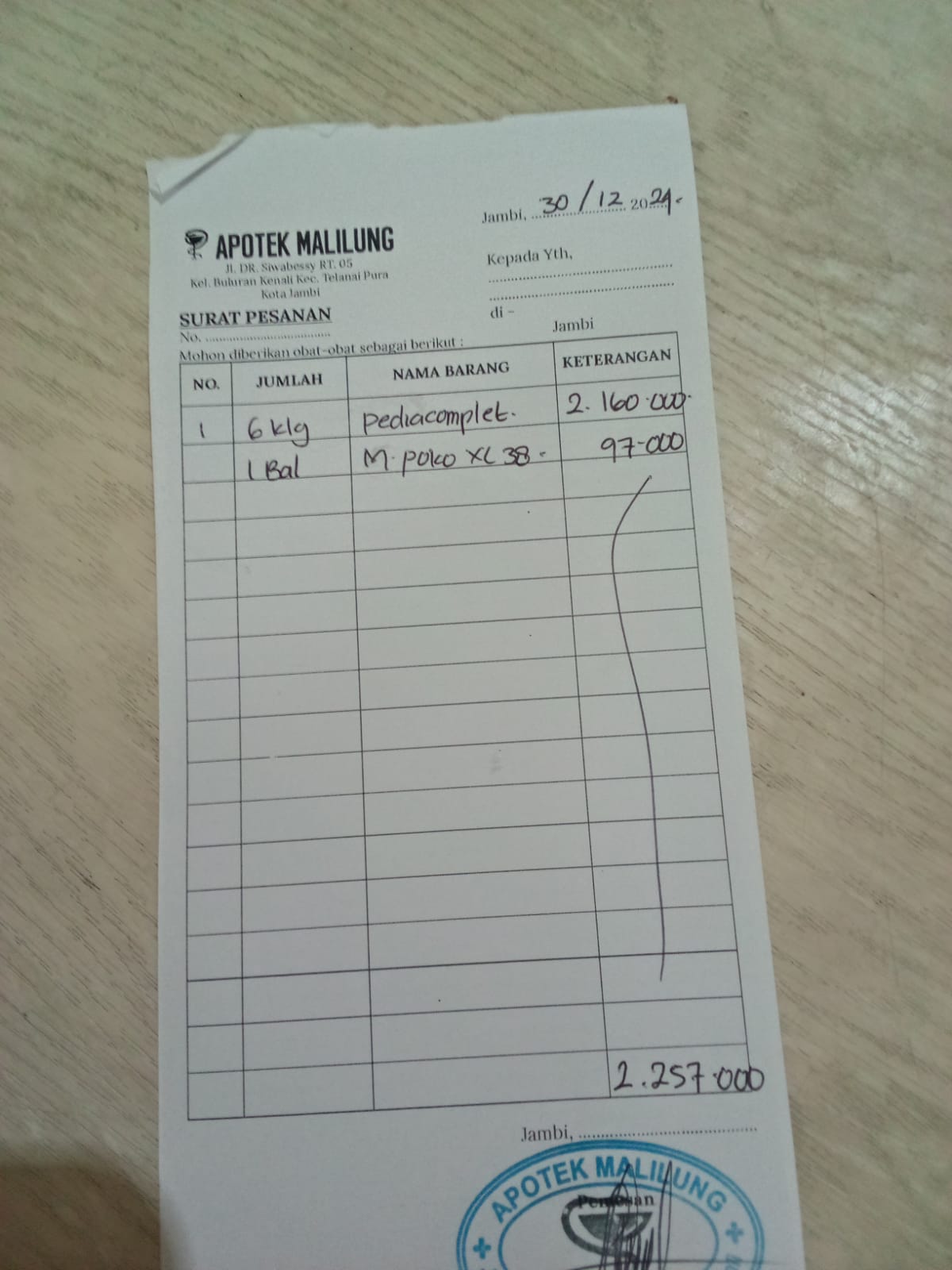 1.susu pediacomplit 360000 × 7 kaleng Rp 2520000 Pempers 4 bal ukuran XL 97000 × 4 Rp 388000 Vitamin omega tiga ( 1 ) 250000 × 1 Rp 250000 Total Rp 3.1580002024-09-24 11:25:01