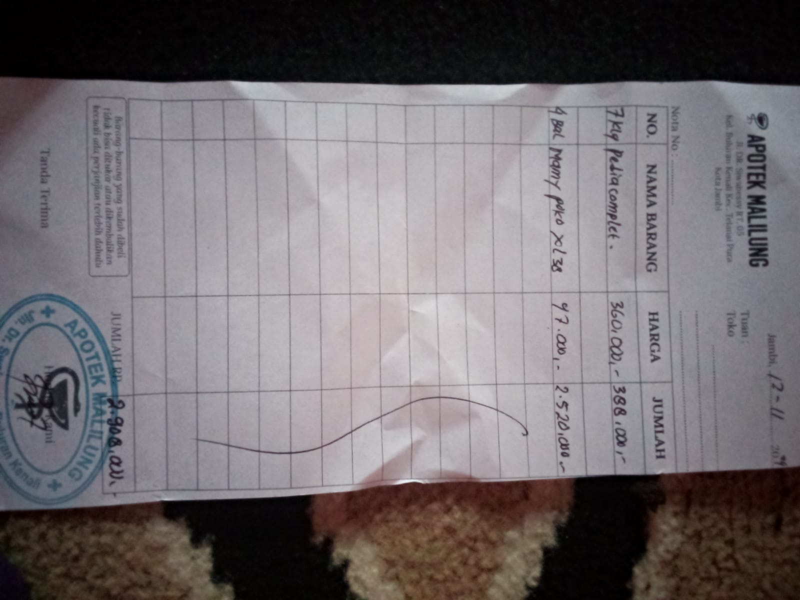 Dana digunakan untuk 1. Susu Pediacomplit Rp360.000 × 7 pcs = Rp2.520.000 2. Pampers mamypoko Rp97.000 × 4 ball = Rp388.0002024-11-12 09:14:45
