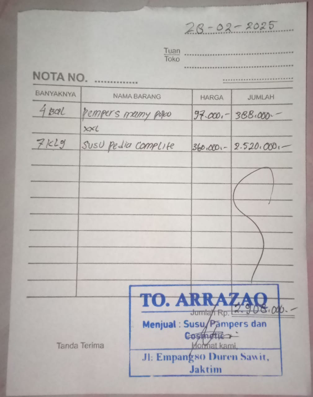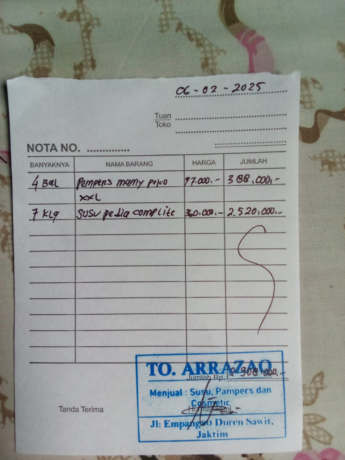 Dana digunakan untuk 1.Susu pediacomplit Rp360.000 × 7dus = Rp2.520.000 2.Pampers mamypoko Rp97.000 × 4ball = Rp388.0002025-03-19 13:44:52