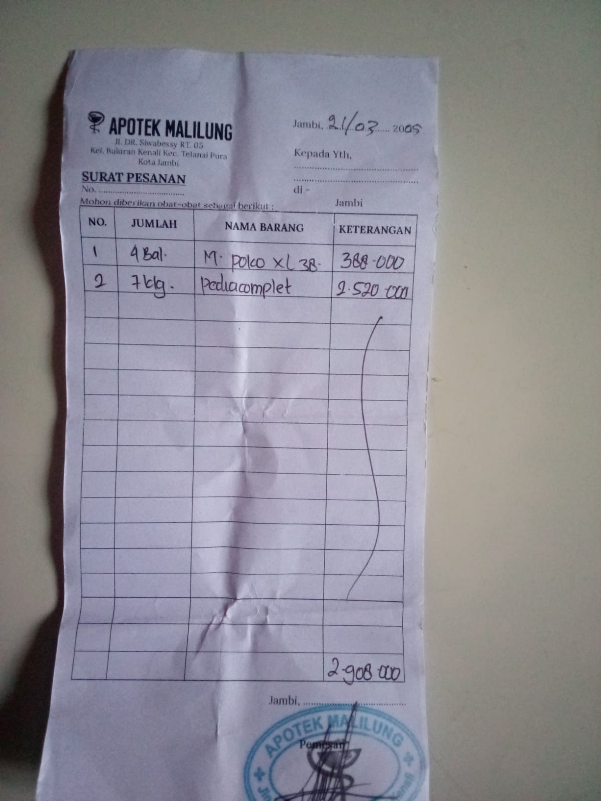 Dana digunakan untuk 1.Susu pediacomplit Rp360.000 × 7kaleng = Rp2.520.000 2.Pampers mamy Poko Rp97.000 × 4ball =Rp388.0002025-04-08 09:36:07