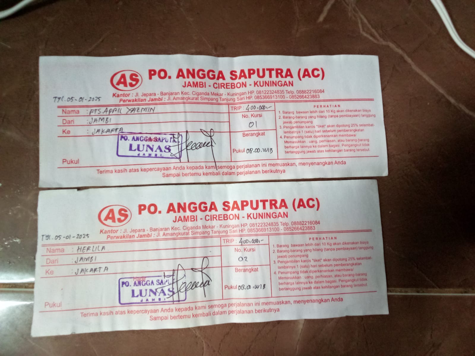 Dana digunakan untuk 1.Biaya transportasi bus Rp400.000 × 2 orang = Rp800.000 2.Biaya konsumsi 2 orang Rp200.0002025-03-05 09:17:53