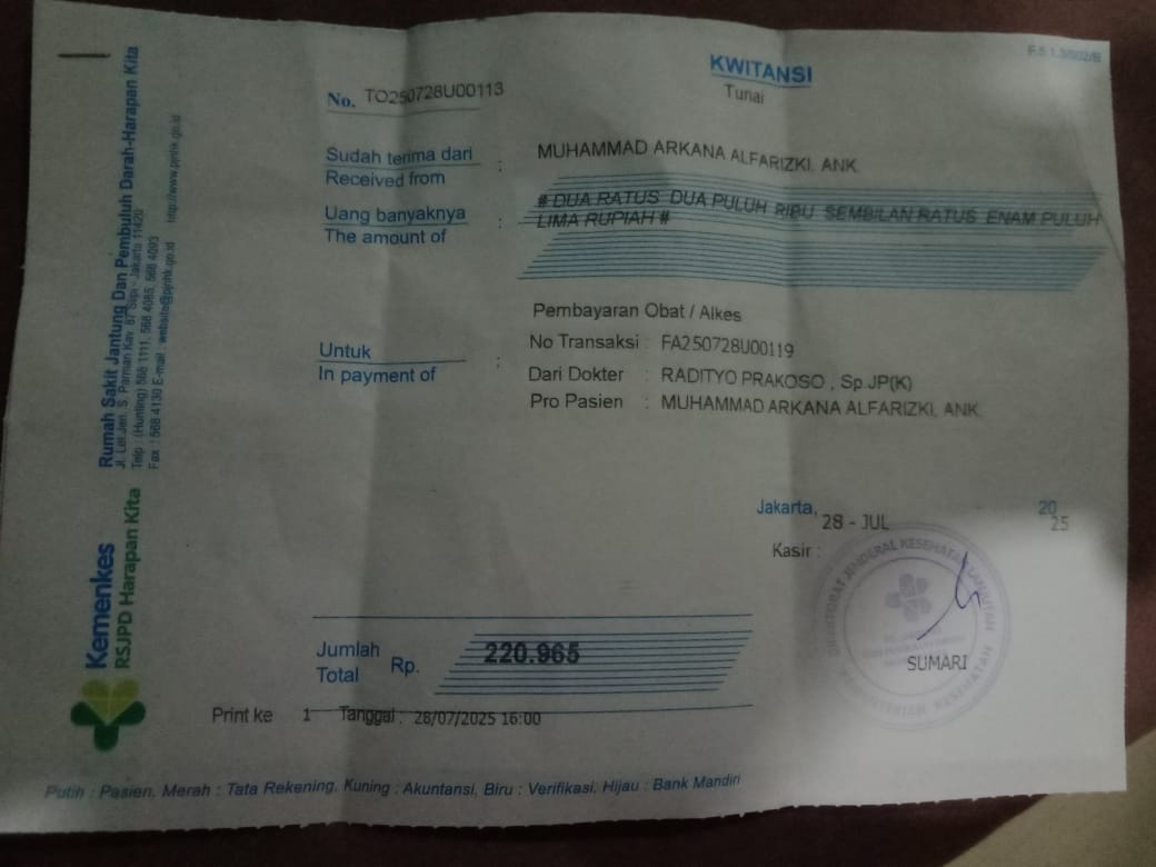 Terima kasih atas bantuan dan doa yang telah diberikan. Bantuan dari kalian telah kami gunakan untuk membeli kebutuhan penting Arkana seperti obat yang tidak ditanggung BPJS, popok, susu, vitamin, tisu basah dan kering, minyak telon, serta biaya untuk konsultasi poli online dengan dokter jantung anak di RS Harapan Kita, Jakarta Barat.