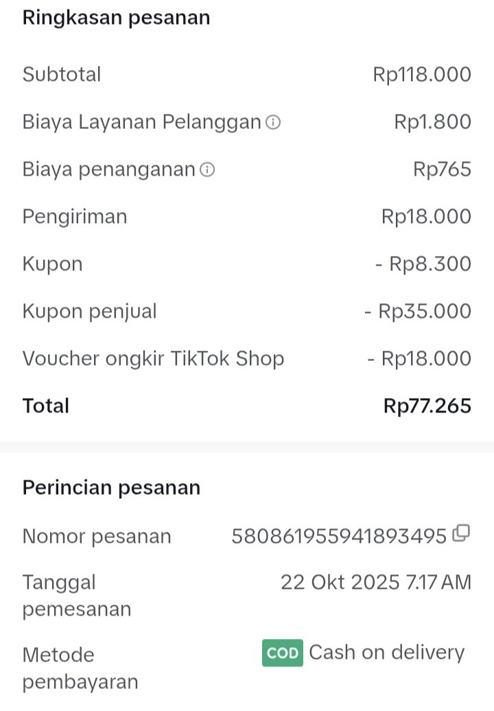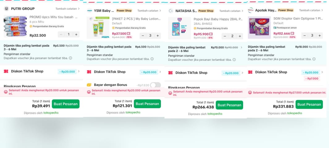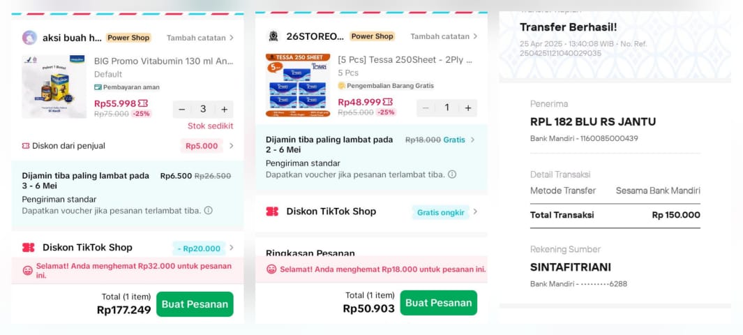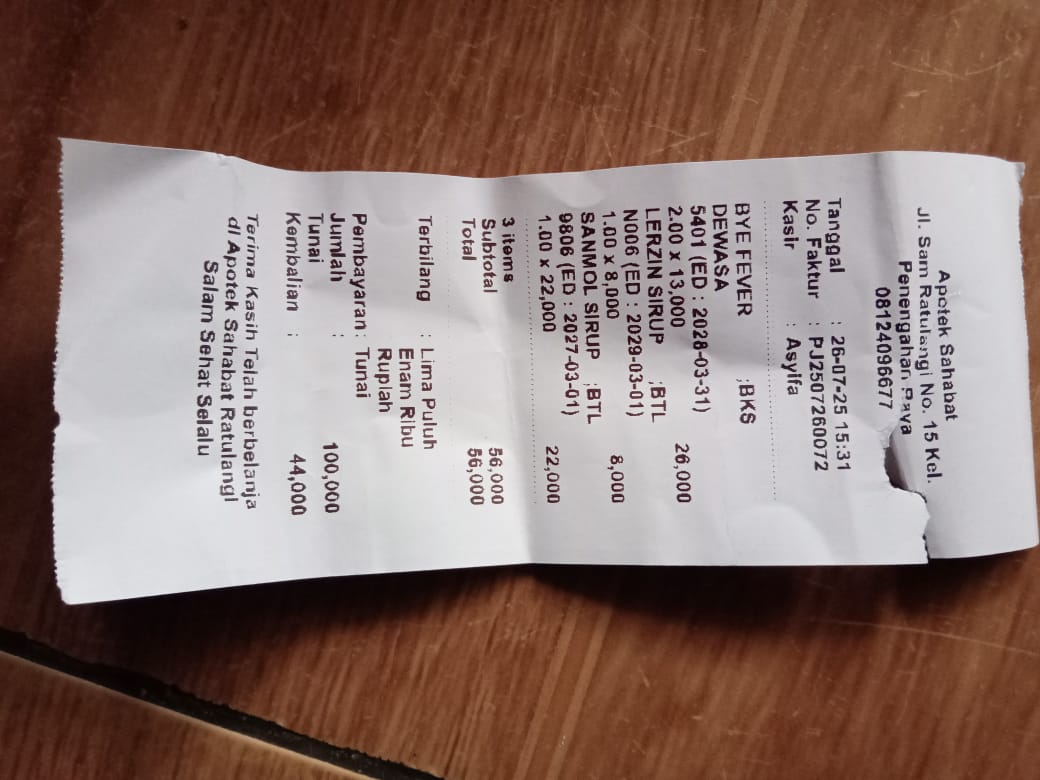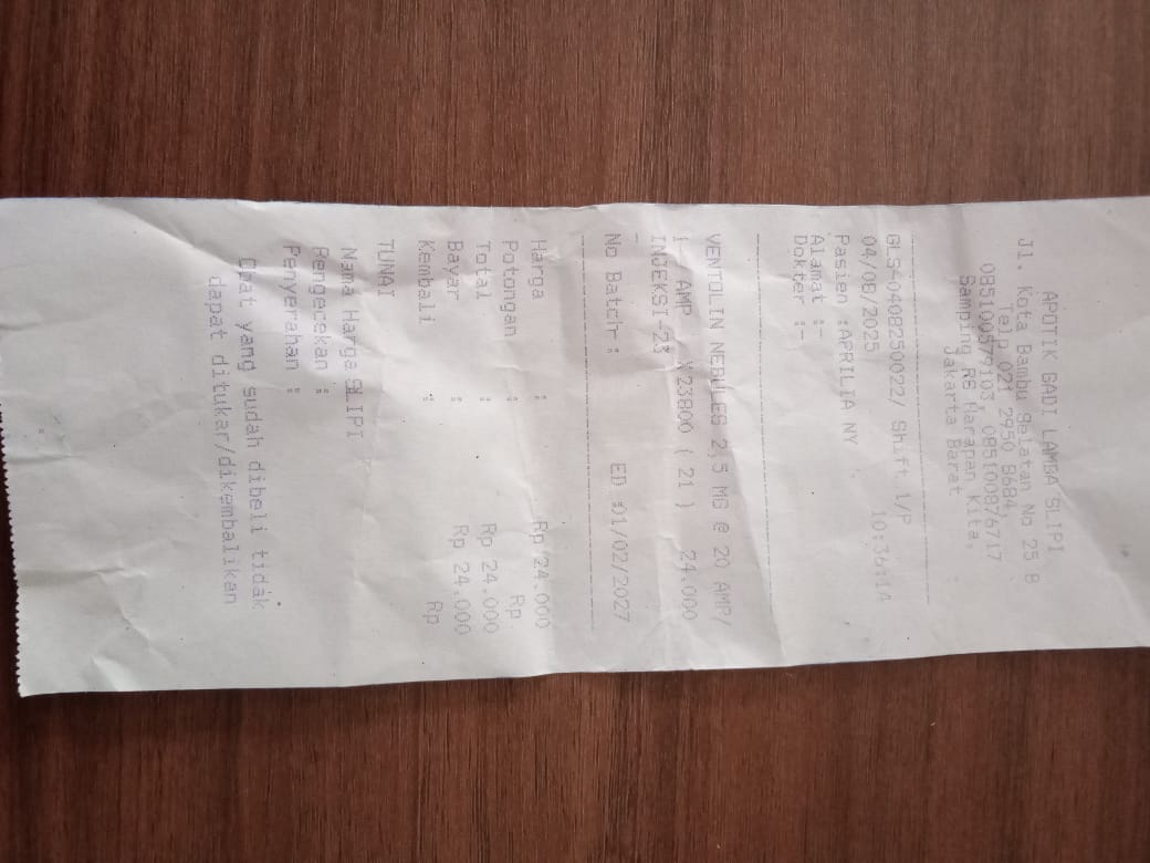 Dana digunakan untuk 1. Pempers baby happy Rp.60.000 × 2 ball = Rp120.000 2. sabun switzal Rp.40.000 × 2 bungkus = Rp.80.000 3. Pasta gigi Jordan Rp40.000 4. Sikat gigi Jordan Rp40.000 5. Tisu basah Rp.20.000 × 4 bungkus =Rp.40.000 6. Tisu Kering Rp.25.000 × 4 bungkus =Rp.50.000 7. Madu vitabumin Rp.80.000 × 2 botol = Rp160.000 8. Alat nebulizer Rp779.0002025-11-03 09:20:48