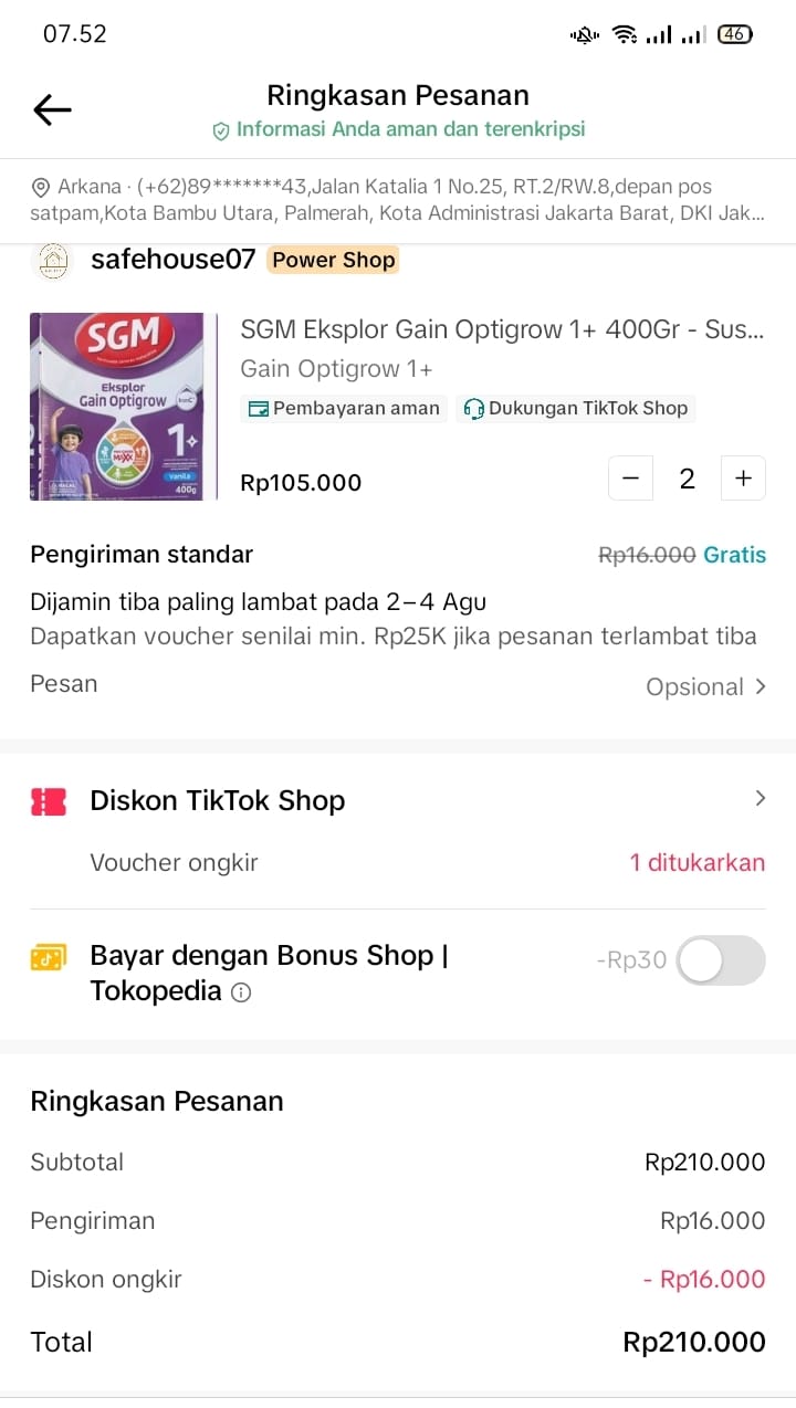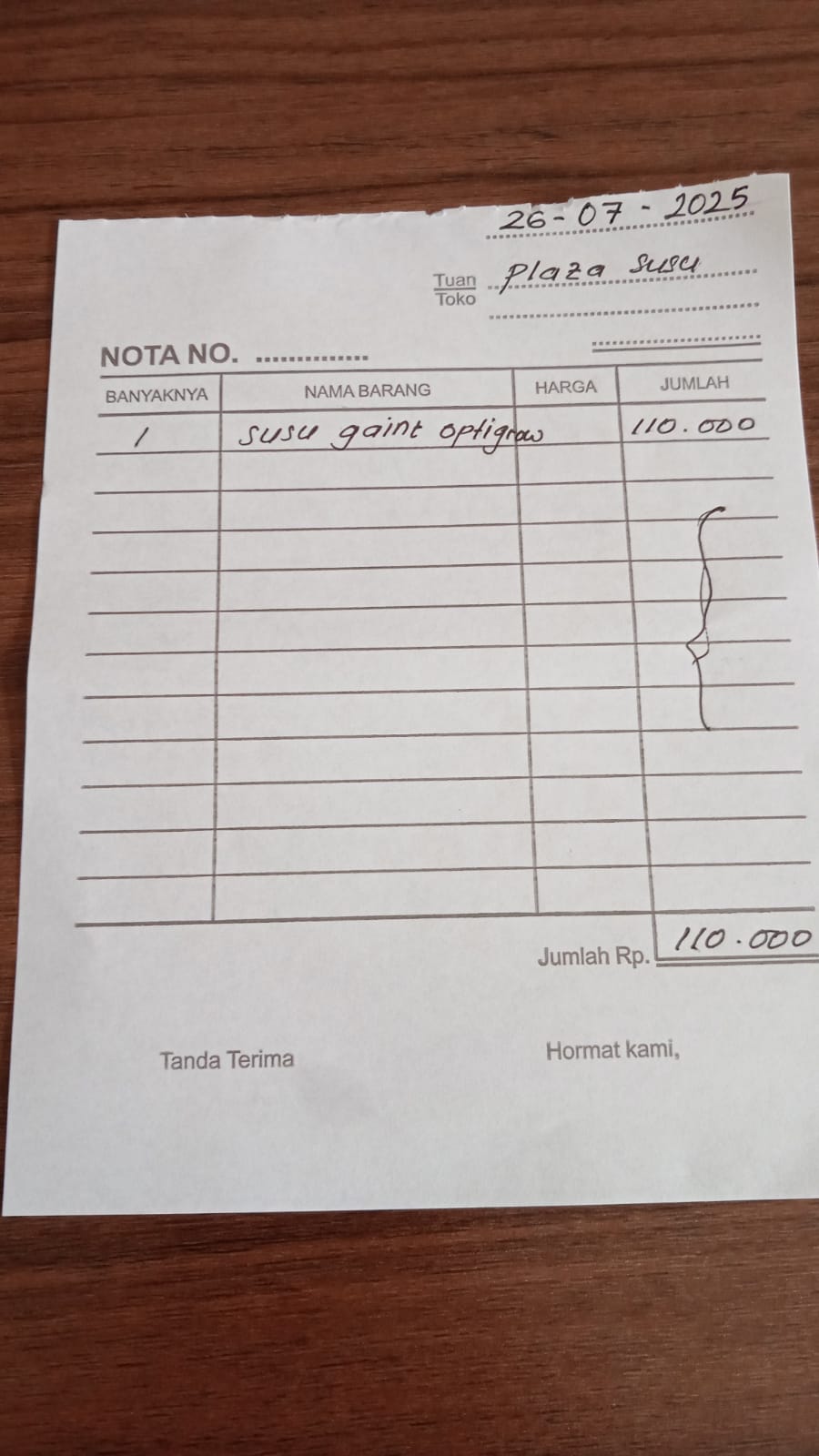 Dana digunakan untuk 1.Pampers baby happy 4 ball Rp266.438 2.Minyak telon lotion my baby 3 pcs Rp62.643 3.Susu optigrow 3 dus Rp331.883 4.Madu vitabumin 2 pcs Rp118.166 5.Tisu kering 5 pcs Rp50.903 6.Tsu basah 6 pcs Rp39.491 7.Reimburse poli Online Rp150.000 8.Obat sildenafil untuk 2 Minggu Rp200.0002025-05-05 09:36:21
