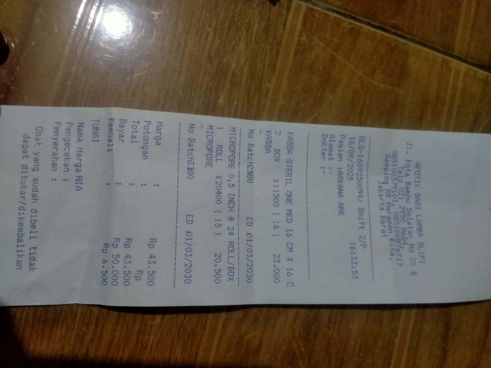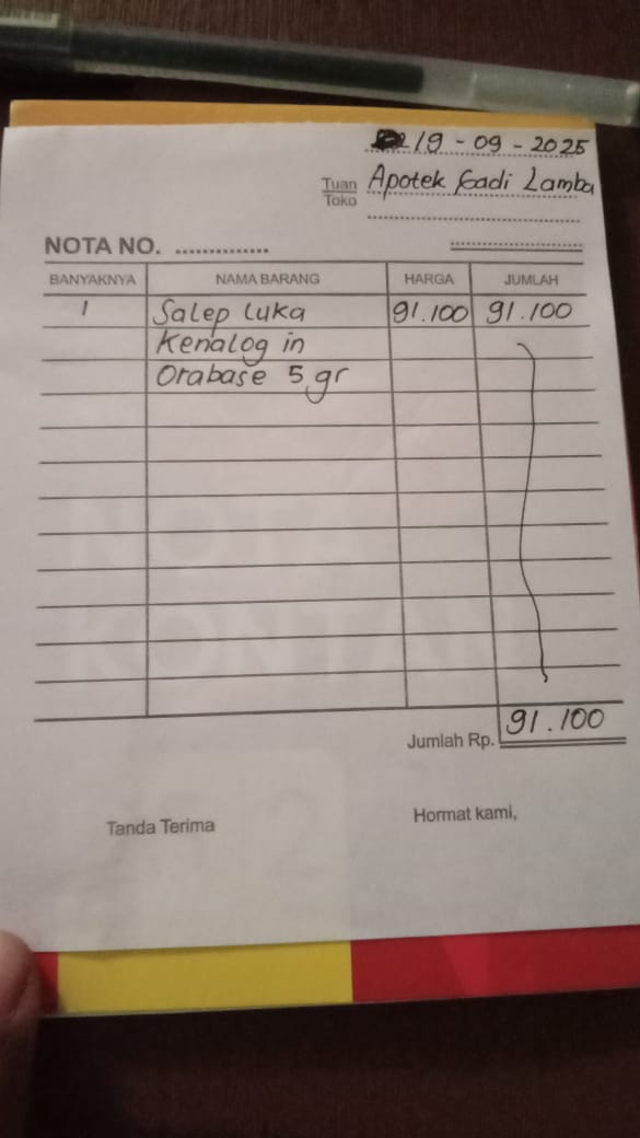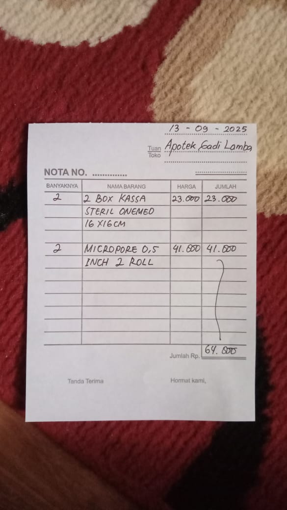 Dana digunakan untuk 1. kain kasa steril onemed Rp11.500 × 5 box =Rp57.500 2. Plester luka Rp20.500 × 3 =Rp61.500 3. salep luka Rp80.000 × 2 = Rp160.000 4. lotion my baby Rp20.000 × 3 =Rp60.000 5. Air NACL Rp30.000 × 2 = Rp60.000 7. Akomodasi di jakarta Rp1.598.5002025-09-17 09:54:12