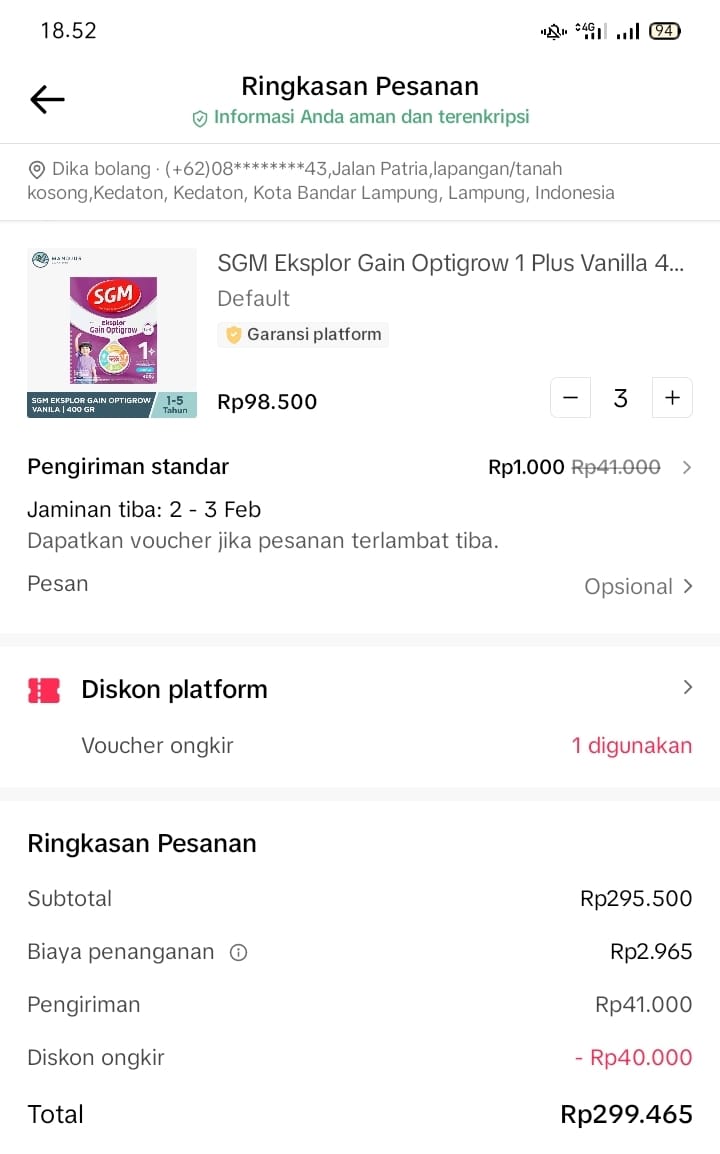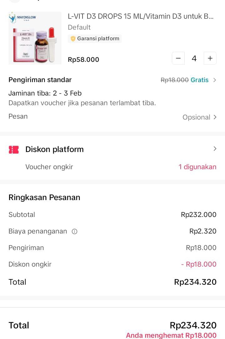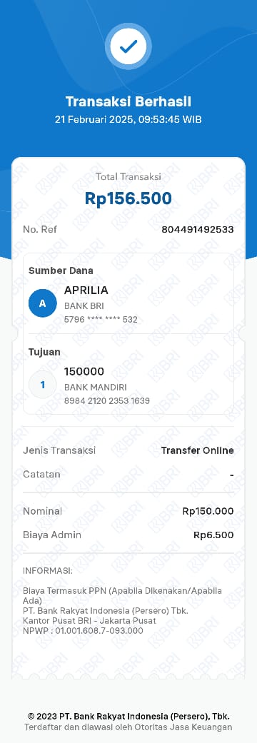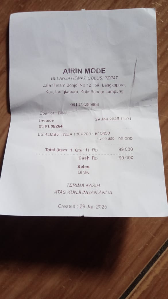 Dana digunakan untuk 1. Selambu tenda Rp99.000 2. Poli online RS ( via VC) Rp150.000 3. Vitamin D ( L-vit) 58.500 × 4 = Rp234.000 4. Pampes mamypoko 4 ball Rp266.634 5. Susu SGM gain optigrow vanila 3 kotak Rp299.465.2025-02-03 13:28:09